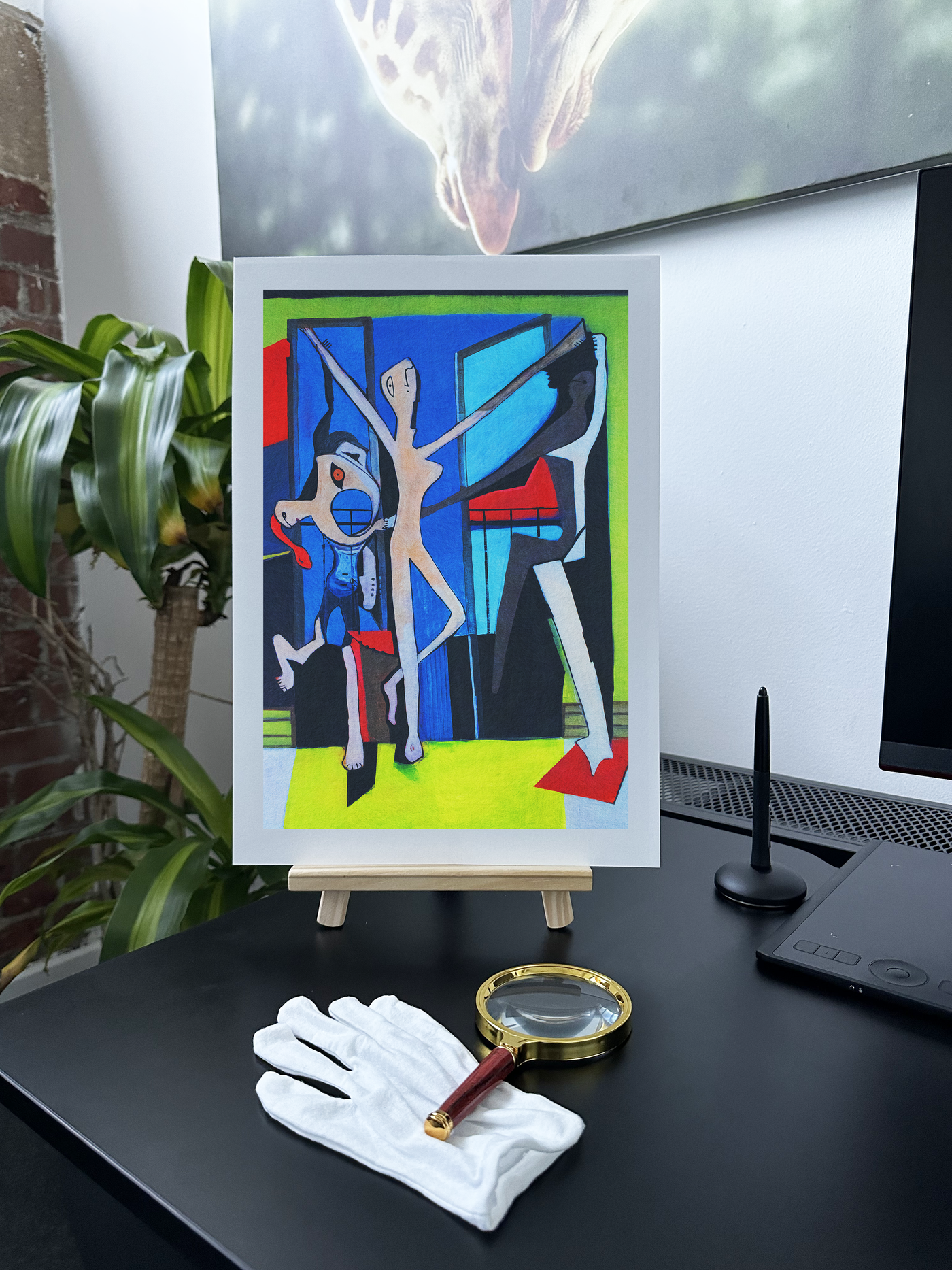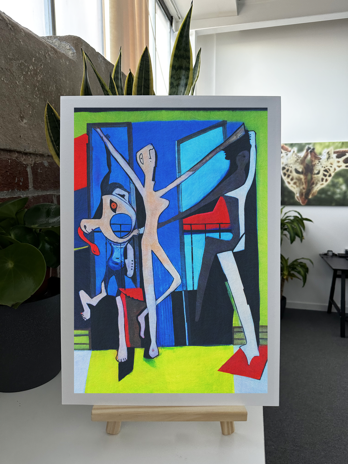 The colour palette is boldly contemporary yet thoughtfully composed, with deep cobalt blues dominating the central space, framed by energetic lime greens that suggest the festive atmosphere. Strategic touches of bright red add rhythm and movement to the composition, while the pale, ethereal figures stand out against the rich background colours. Our print enhancement team have preserved every intentional line and geometric form that gives the piece its distinctive character, ensuring that both the modernist influence and cultural narrative remain clear and impactful.