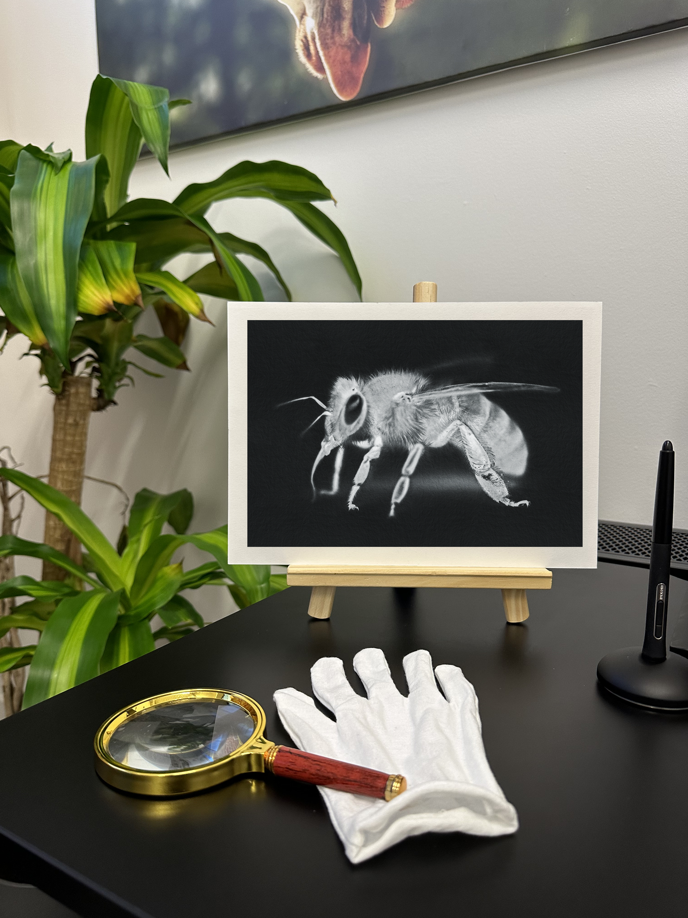 Our advanced printing techniques ensure that every nuance of this remarkable photograph is faithfully reproduced on Fine Art paper. From the delicate antennae to the segmented legs, each aspect of the bee's form is rendered with exquisite detail, allowing viewers to appreciate the complexity of its structure.
