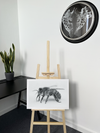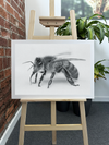 The Fine Art paper texture lends a subtle, organic feel to this striking image, complementing the natural subject matter. Observe how the soft grain of the Fine Art paper interplays with the bee's fuzzy body, creating a tactile quality that enhances the viewing experience. The light background makes the bee stand out in bold relief, emphasising its form and structure.