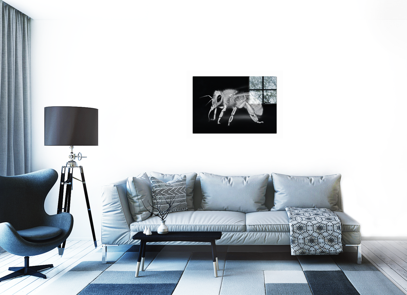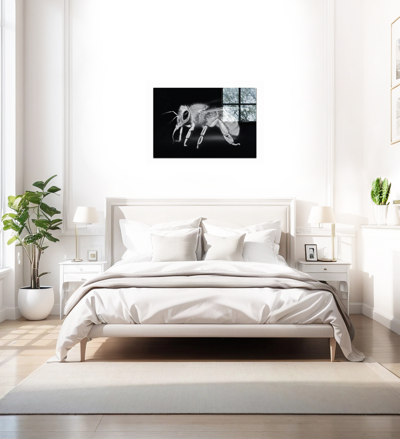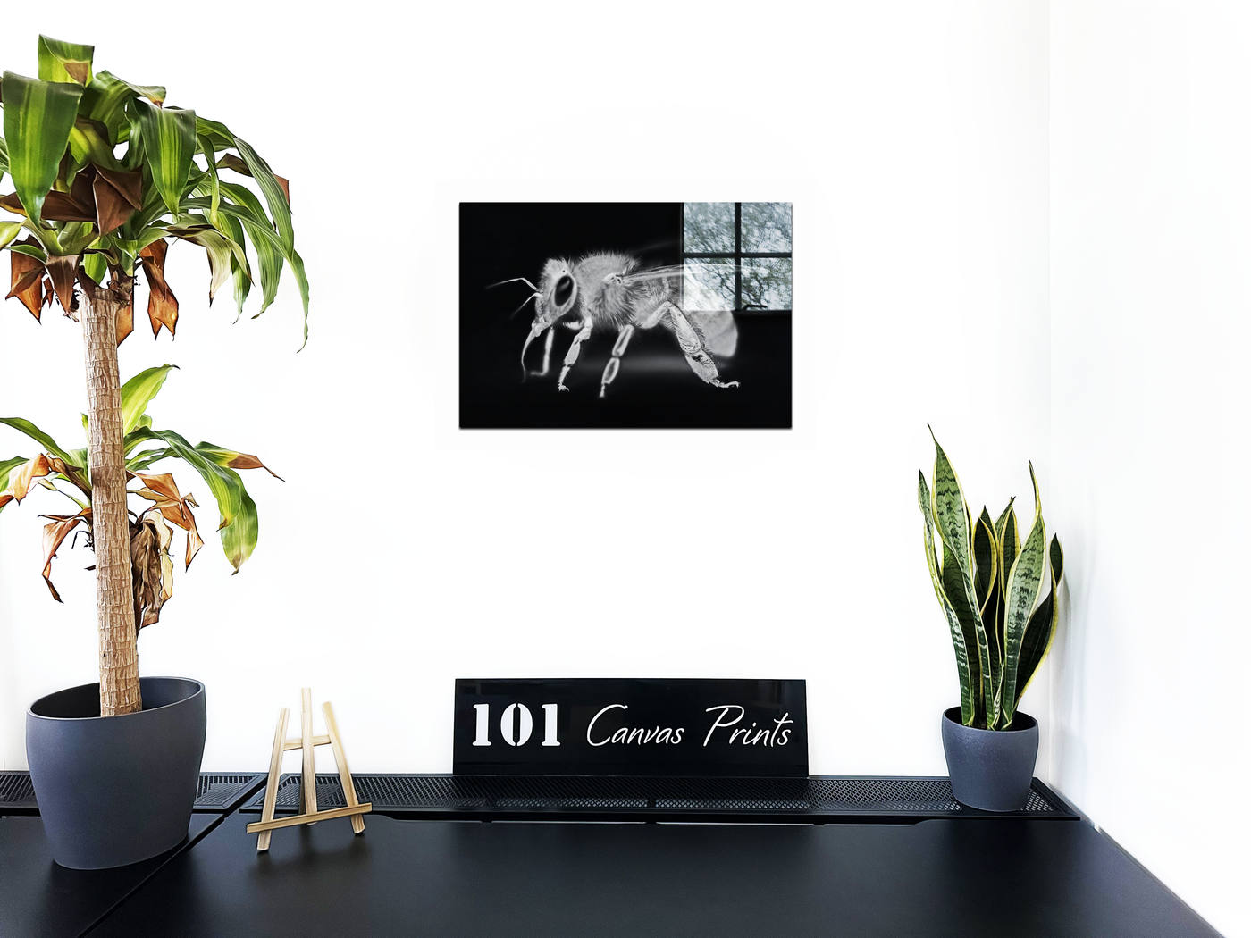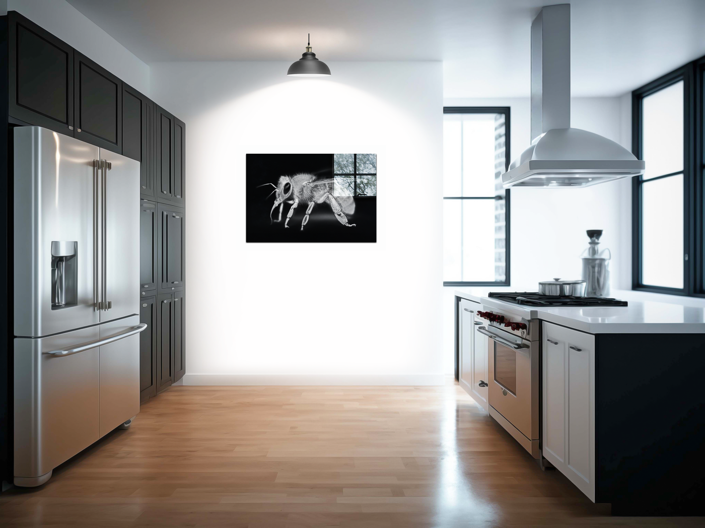 The Acrylic medium amplifies the striking contrast of this black and white image, bringing every hair and joint of the bee into sharp focus. Notice how the bee seems to hover in a void, with only a hint of a window frame providing context, creating a surreal and captivating visual experience. The reflective quality of the Acrylic adds depth, making the bee appear to float within the frame.