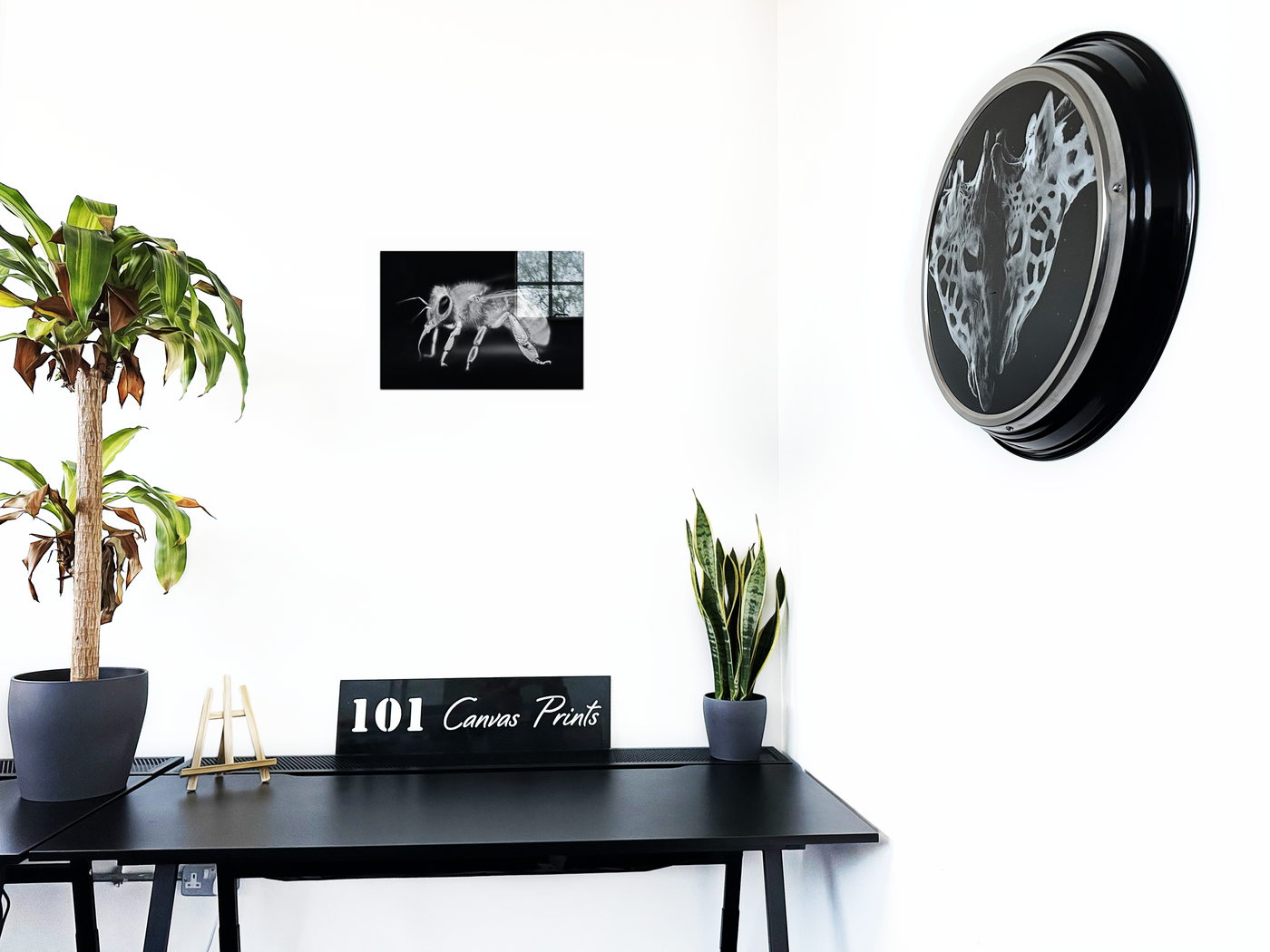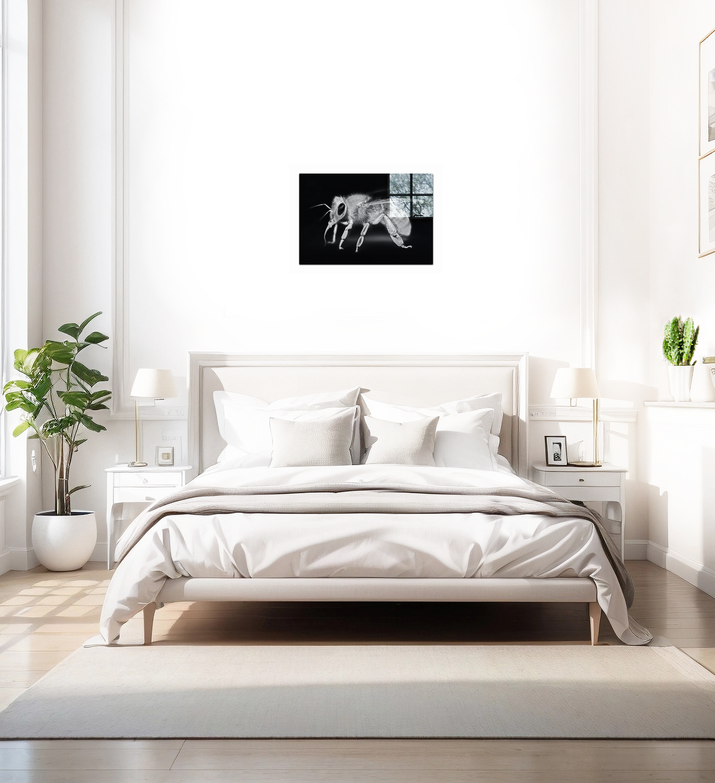 The Acrylic medium amplifies the striking contrast of this black and white image, bringing every hair and joint of the bee into sharp focus. Notice how the bee seems to hover in a void, with only a hint of a window frame providing context, creating a surreal and captivating visual experience. The reflective quality of the Acrylic adds depth, making the bee appear to float within the frame.