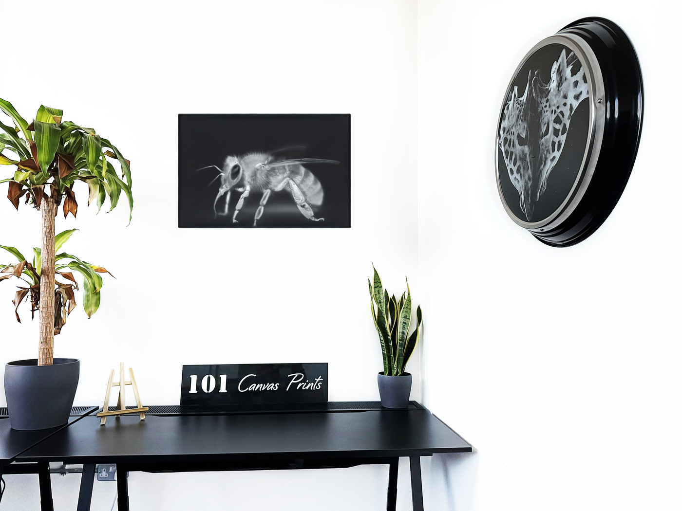 Experience the hidden world of nature's busy pollinators with "Bee in Monochrome Black", an exceptional Canvas print from 101 Canvas Prints. Our talented photography team has expertly captured a bee in mid-flight, offering a rare and intimate glimpse into the intricate beauty of these essential creatures.
