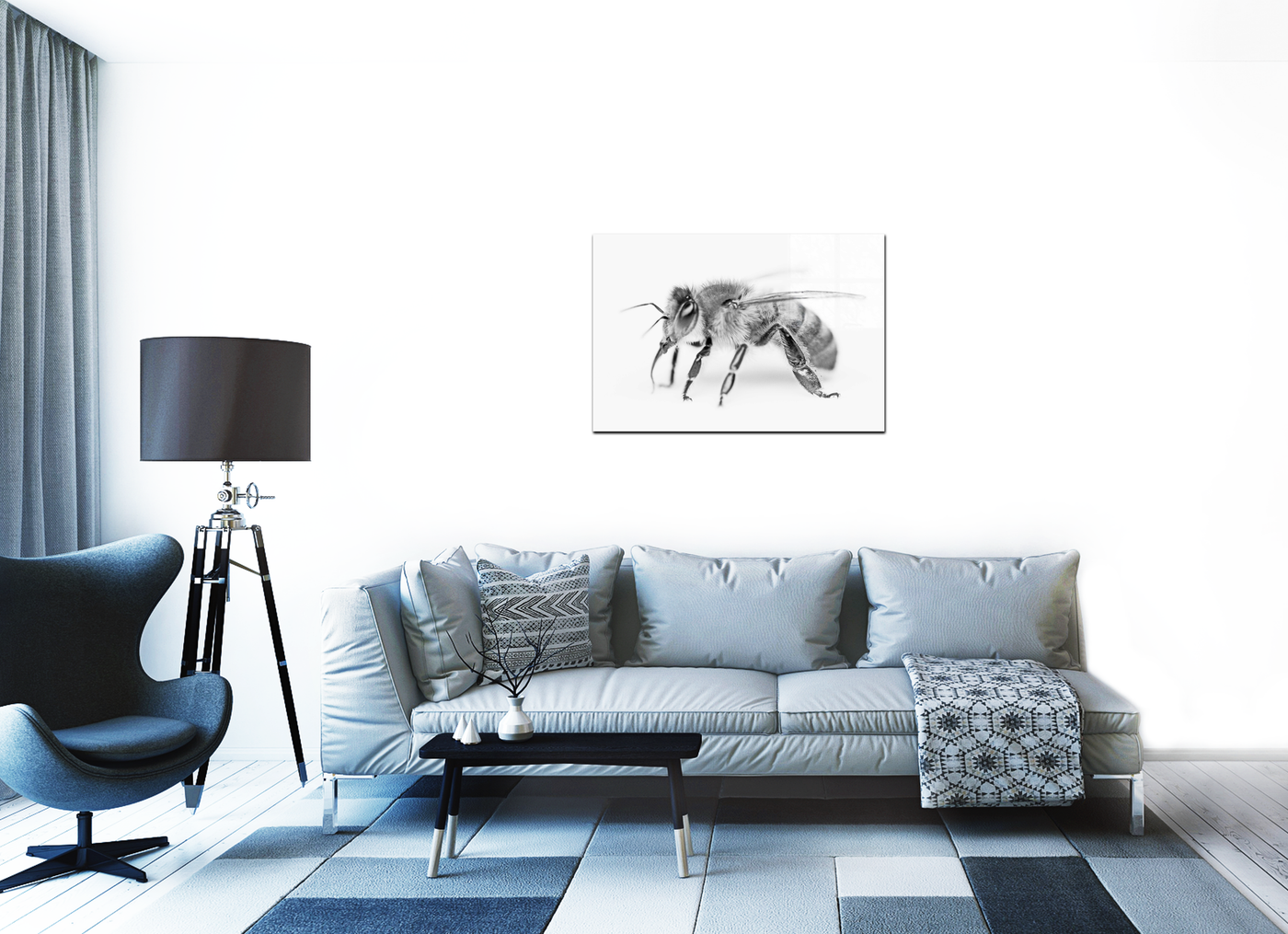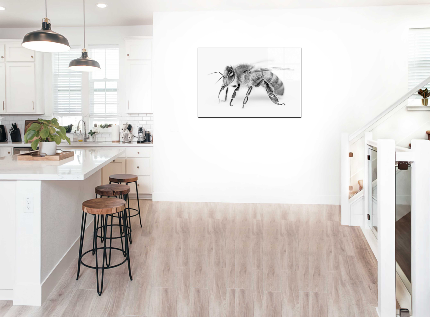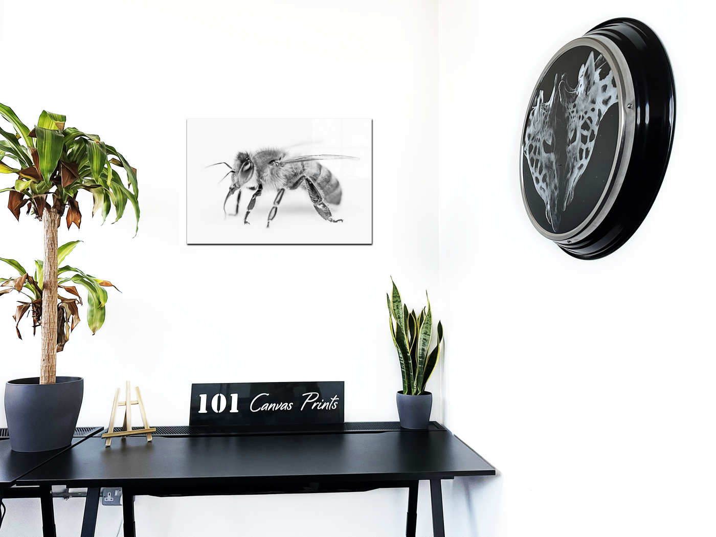 Explore the intricate world of nature's master pollinators with "Bee in Monochrome White", an extraordinary Acrylic print from 101 Canvas Prints. Our expert photography team has captured a stunning close-up of a honeybee, revealing the fascinating details of this remarkable creature in crisp black and white.