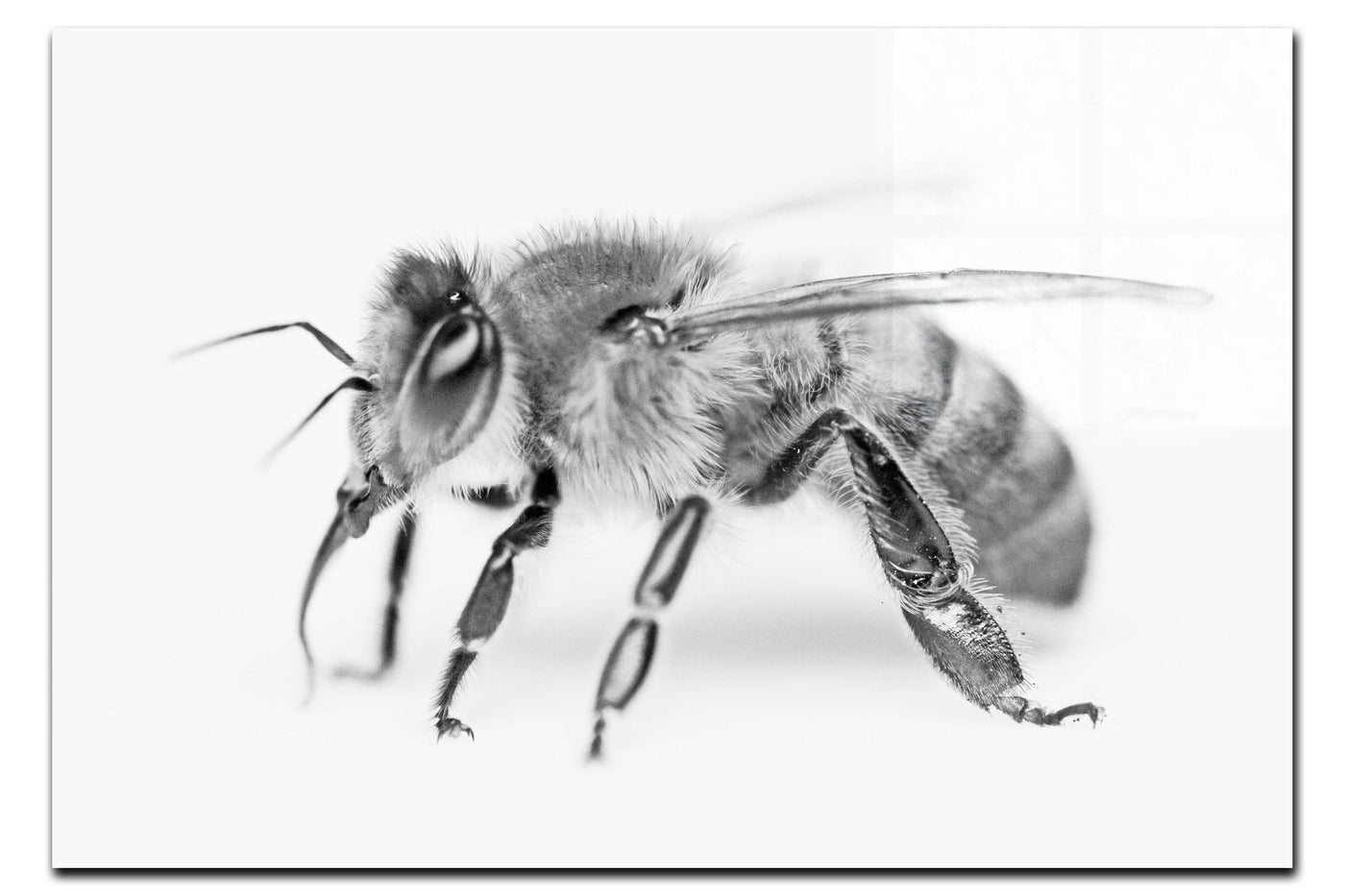 Explore the intricate world of nature's master pollinators with "Bee in Monochrome White", an extraordinary Acrylic print from 101 Canvas Prints. Our expert photography team has captured a stunning close-up of a honeybee, revealing the fascinating details of this remarkable creature in crisp black and white.