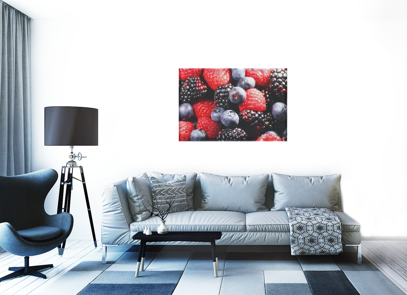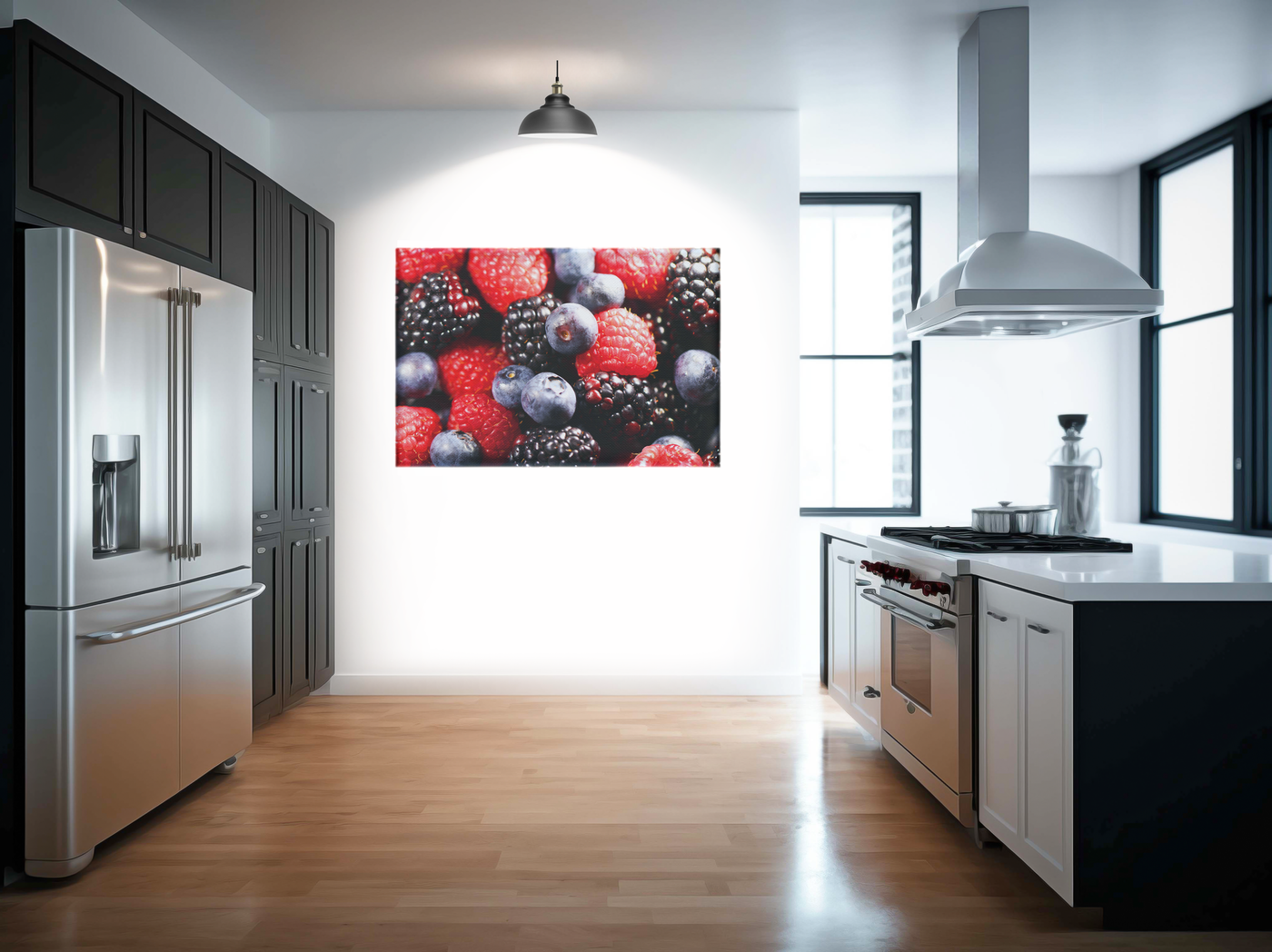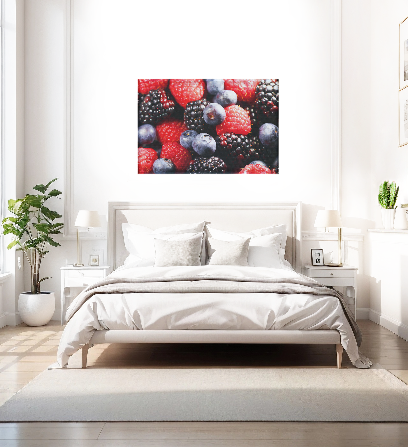 The Canvas texture adds a subtle, organic quality to this image, complementing the natural subject matter. Observe how the slightly rough surface of the Canvas interacts with the varied textures of the berries, from the glossy smoothness of the blueberries to the seeded surface of the strawberries and the intricate structure of the blackberries. This interplay enhances the sense of realism and depth in the image.