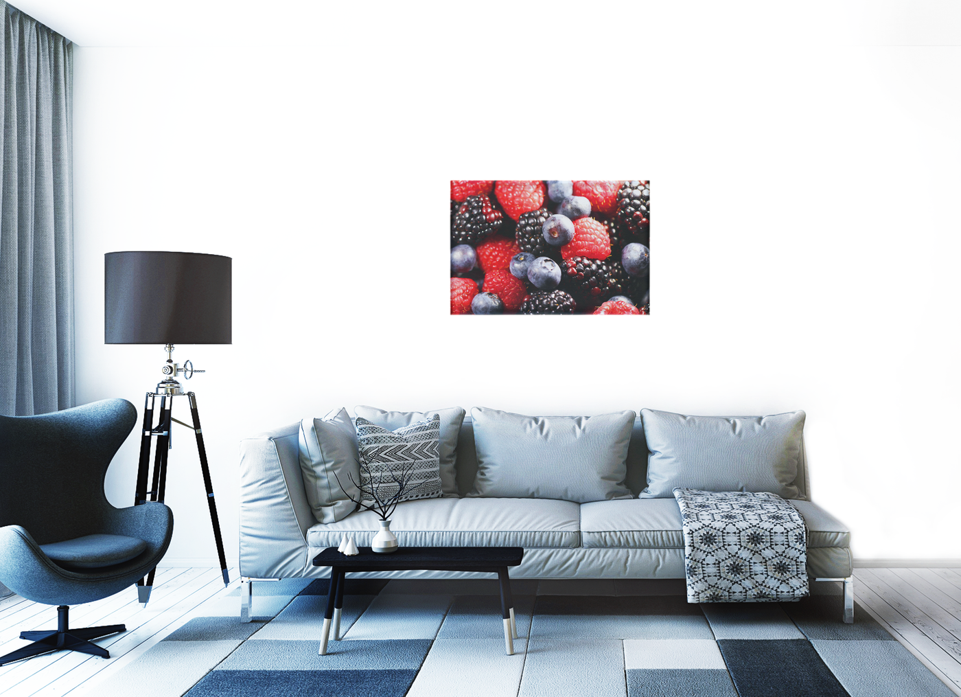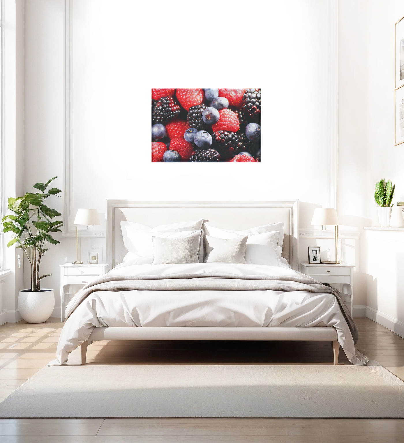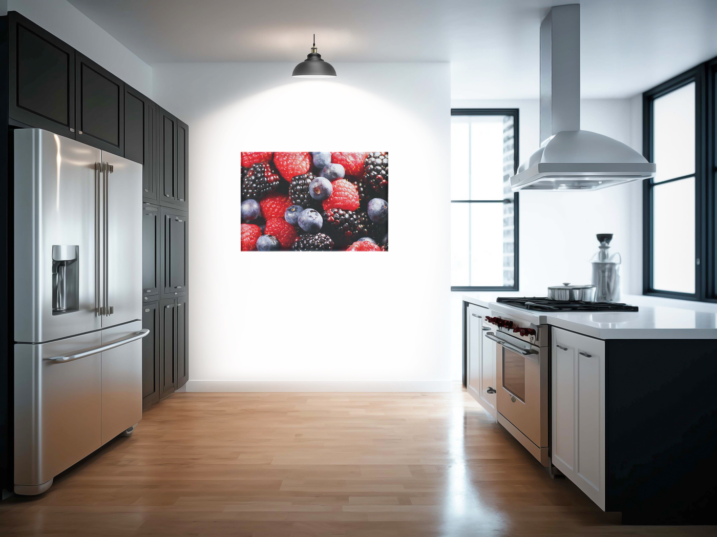 Our advanced printing techniques ensure that the vibrant colours and intricate details of this fruity scene are faithfully reproduced on Canvas. The rich reds, deep purples, and luscious blacks create a symphony of colour that's sure to catch the eye and stimulate the appetite.