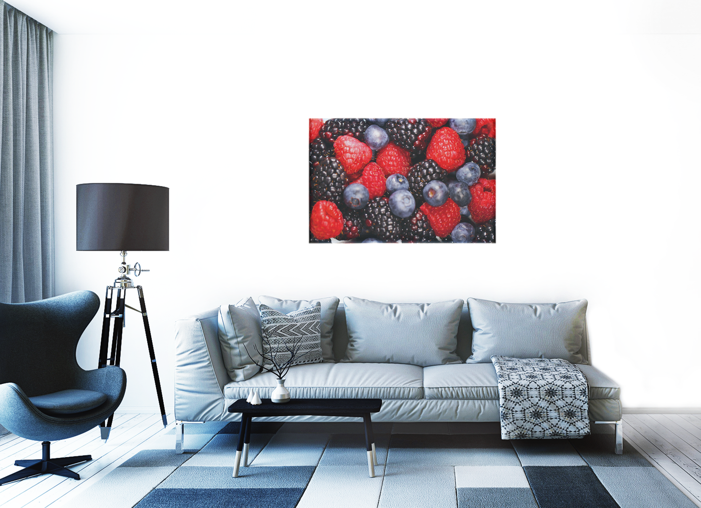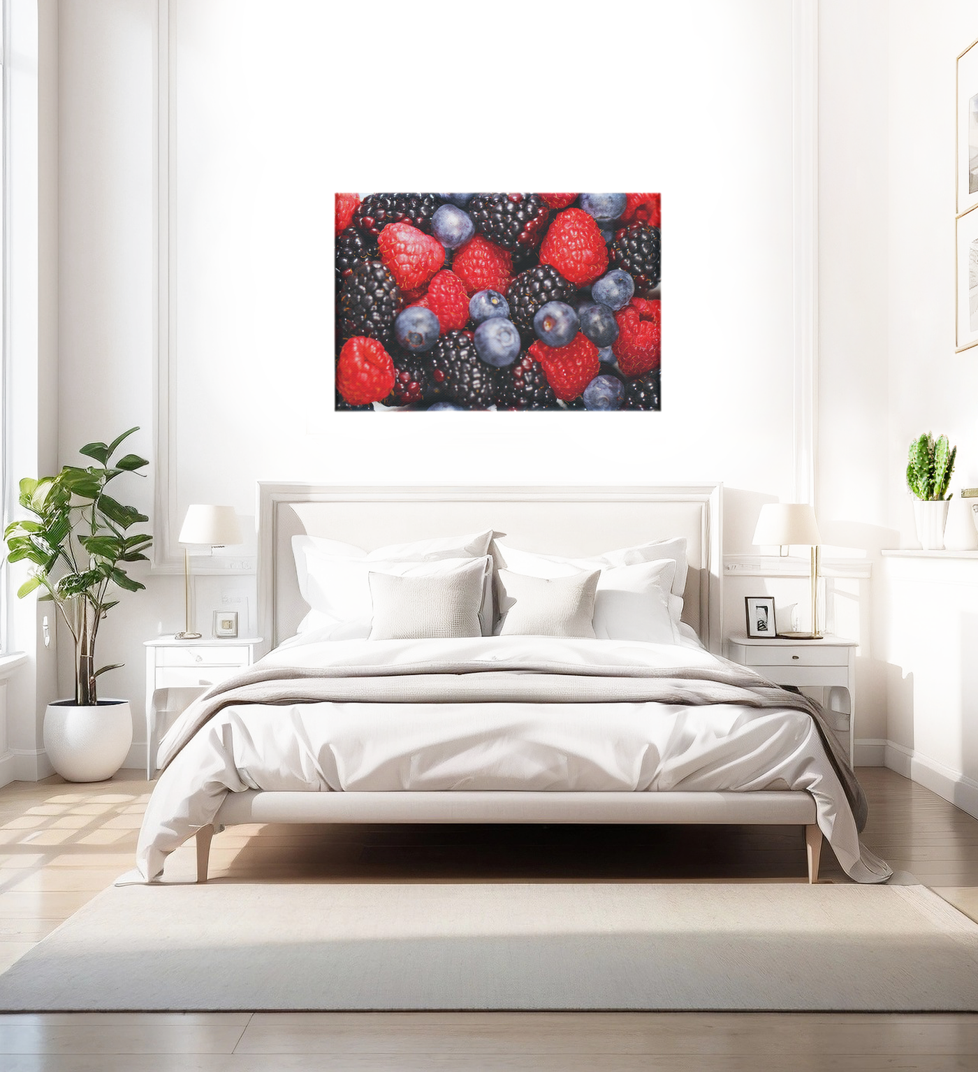 Our advanced printing techniques ensure that the vibrant colours and intricate details of this fruity scene are faithfully reproduced on Canvas. The rich reds, deep purples, and luscious blacks create a symphony of colour that's sure to catch the eye and stimulate the appetite.