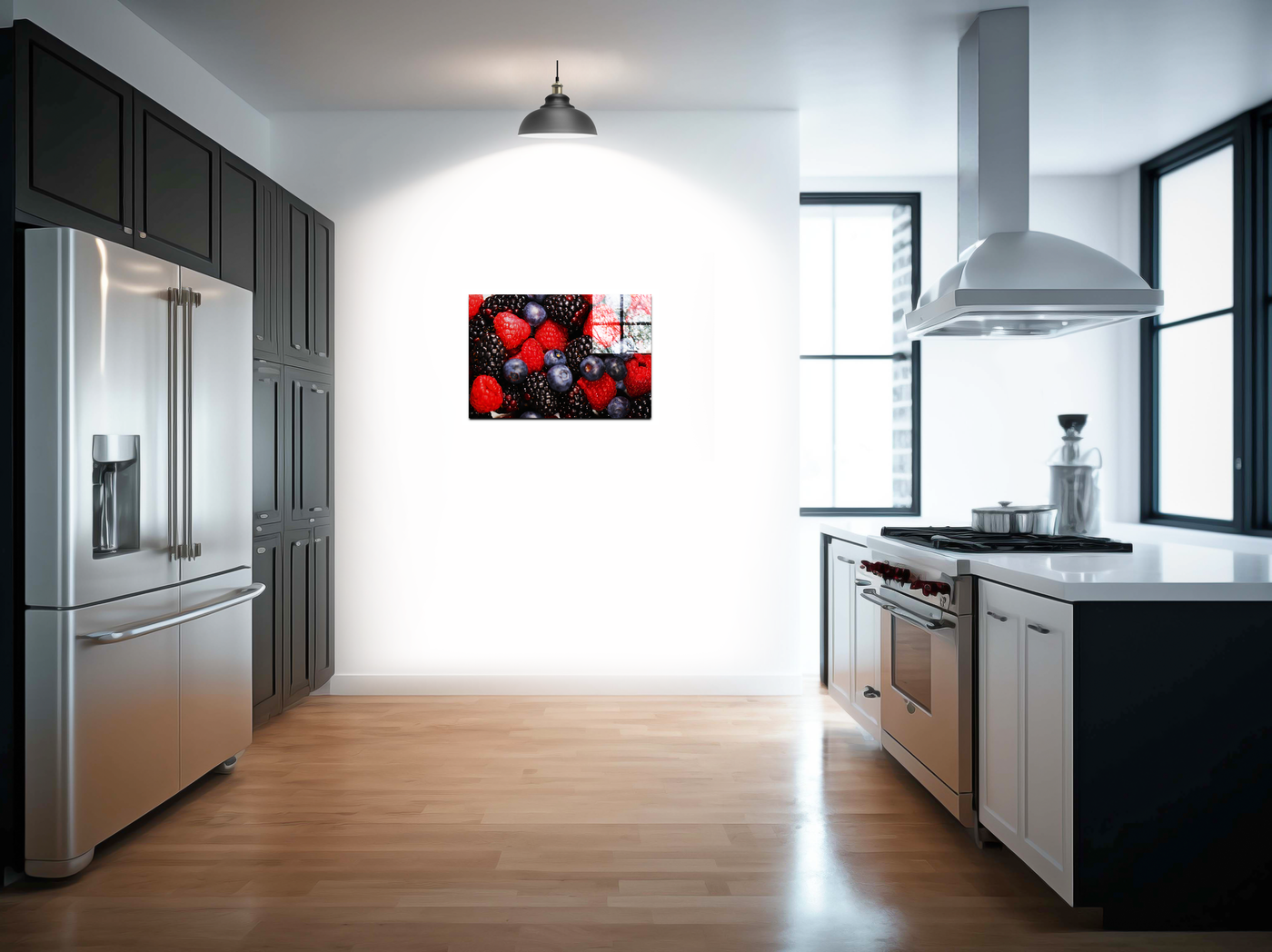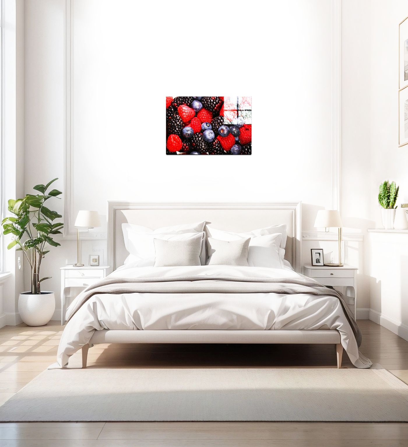 Our advanced printing techniques ensure that the vibrant colours and intricate details of this fruity scene are faithfully reproduced on canvas. The rich reds, deep purples, and luscious blacks create a symphony of colour that's sure to catch the eye and stimulate the appetite.
