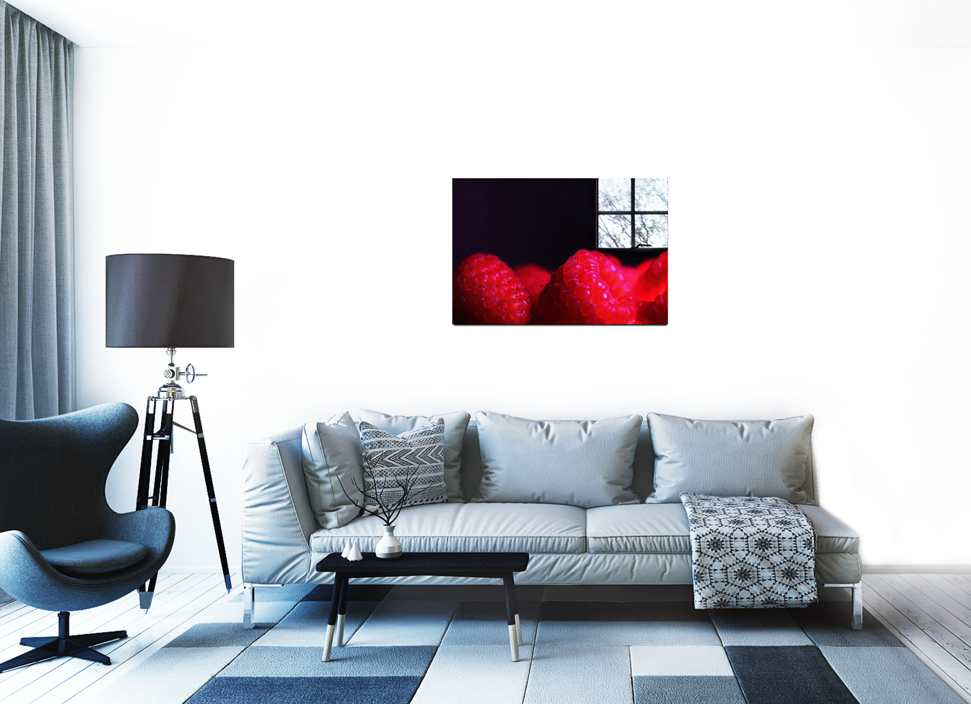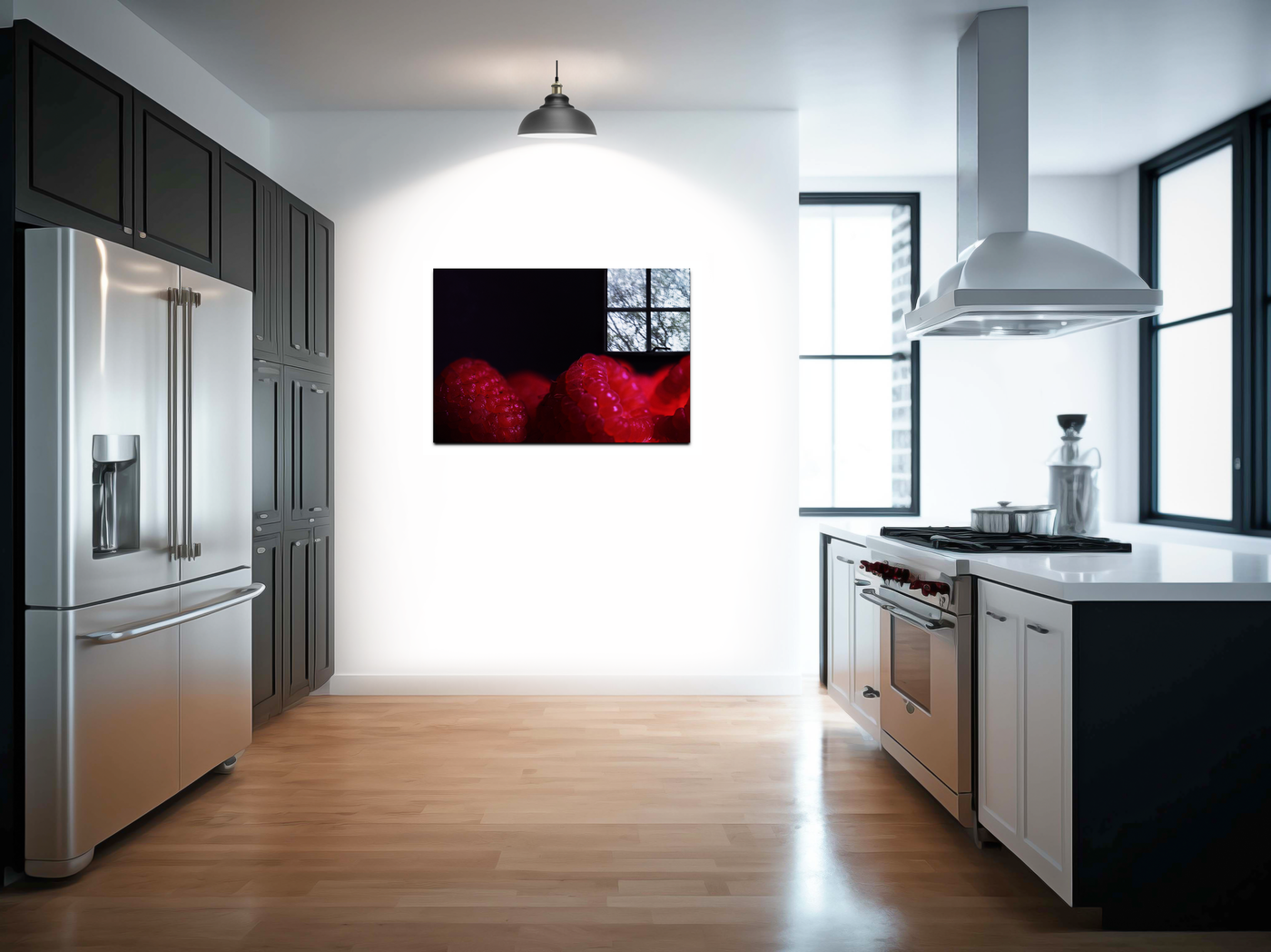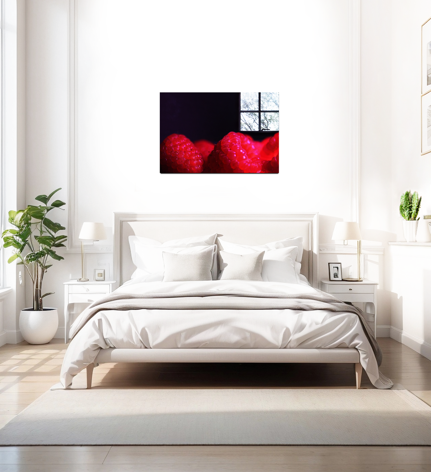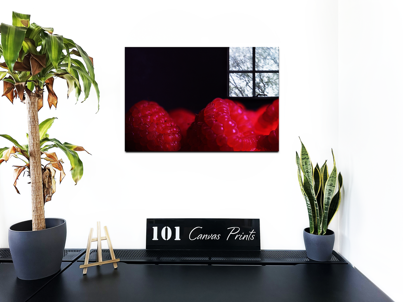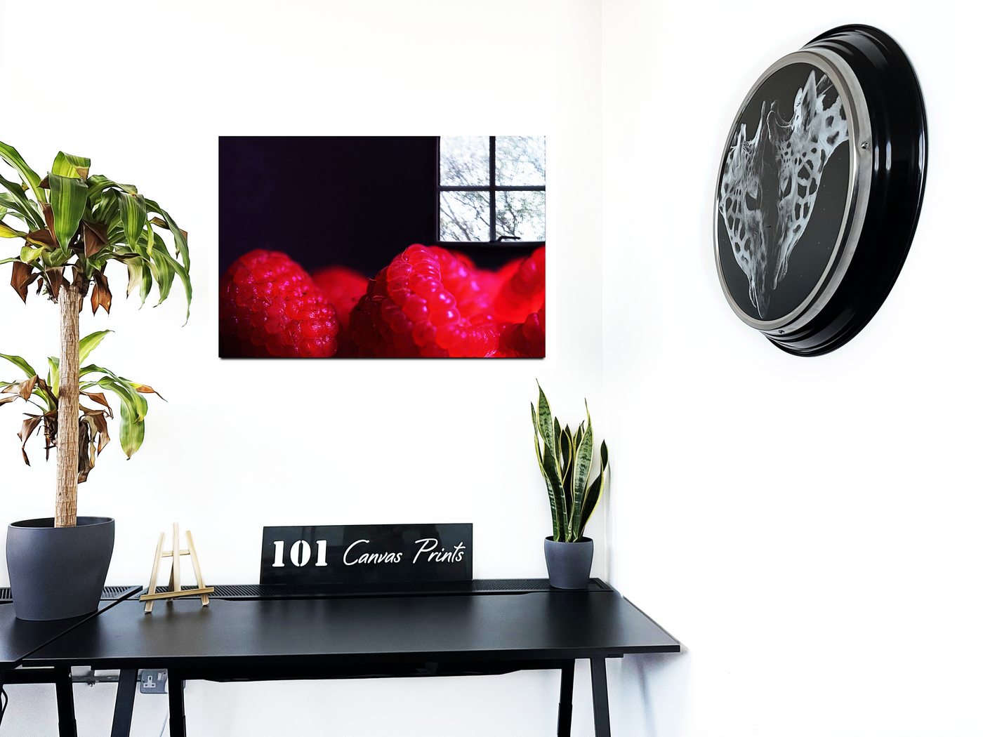 This atmospheric study of raspberries, expertly reproduced by the 101 Canvas Prints team, presents familiar fruit in an unfamiliar light. The composition creates intrigue through selective focus and dramatic lighting, with the berries appearing to emerge from deep shadow while a subtle window reflection provides environmental context. The photographer has transformed these simple fruits into a study of form and light worthy of Fine Art galleries.