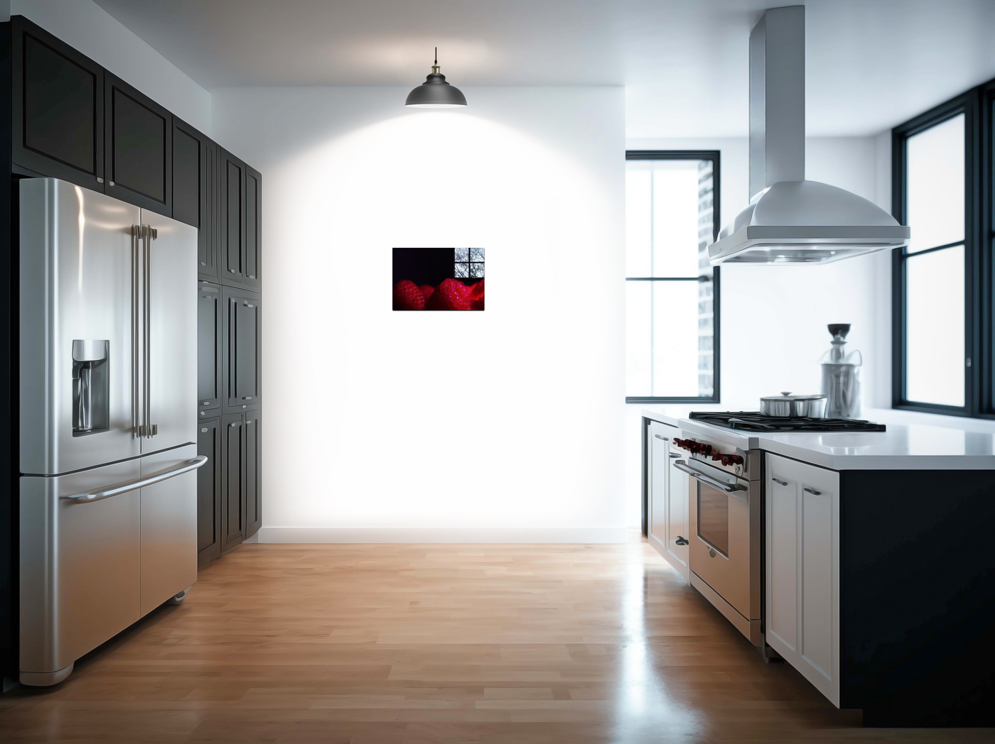 The photographer's mastery of light creates an extraordinary range of red tones, from brilliant crimson through to deep, velvety shadows. Through our precise photography and print enhancement process, we've maintained every nuance of texture and tone, from the gentle curves of each drupelet to the way light catches the berries' natural sheen. The contrast between illuminated fruit and dark background creates a theatrical effect that draws viewers into the composition.