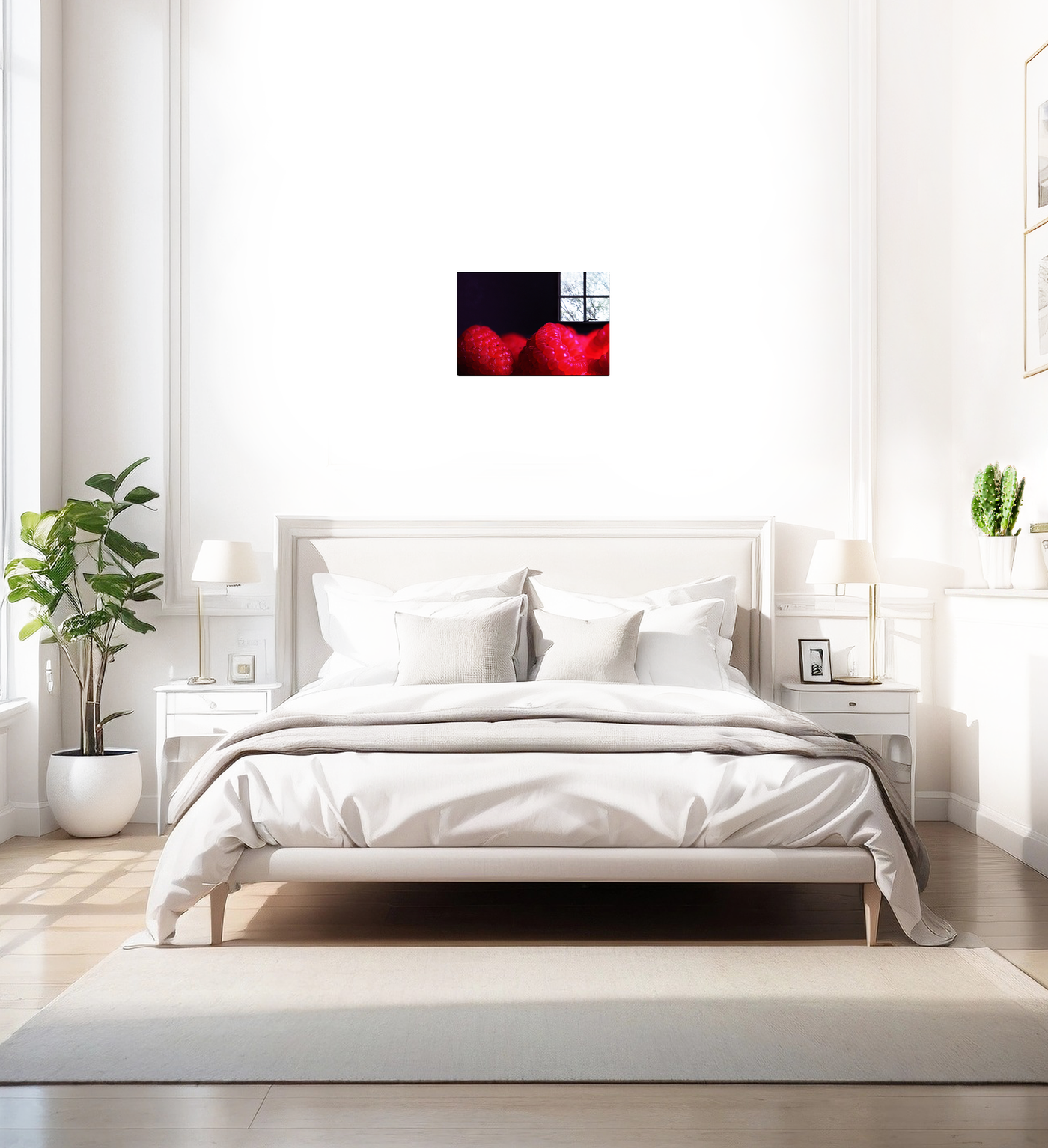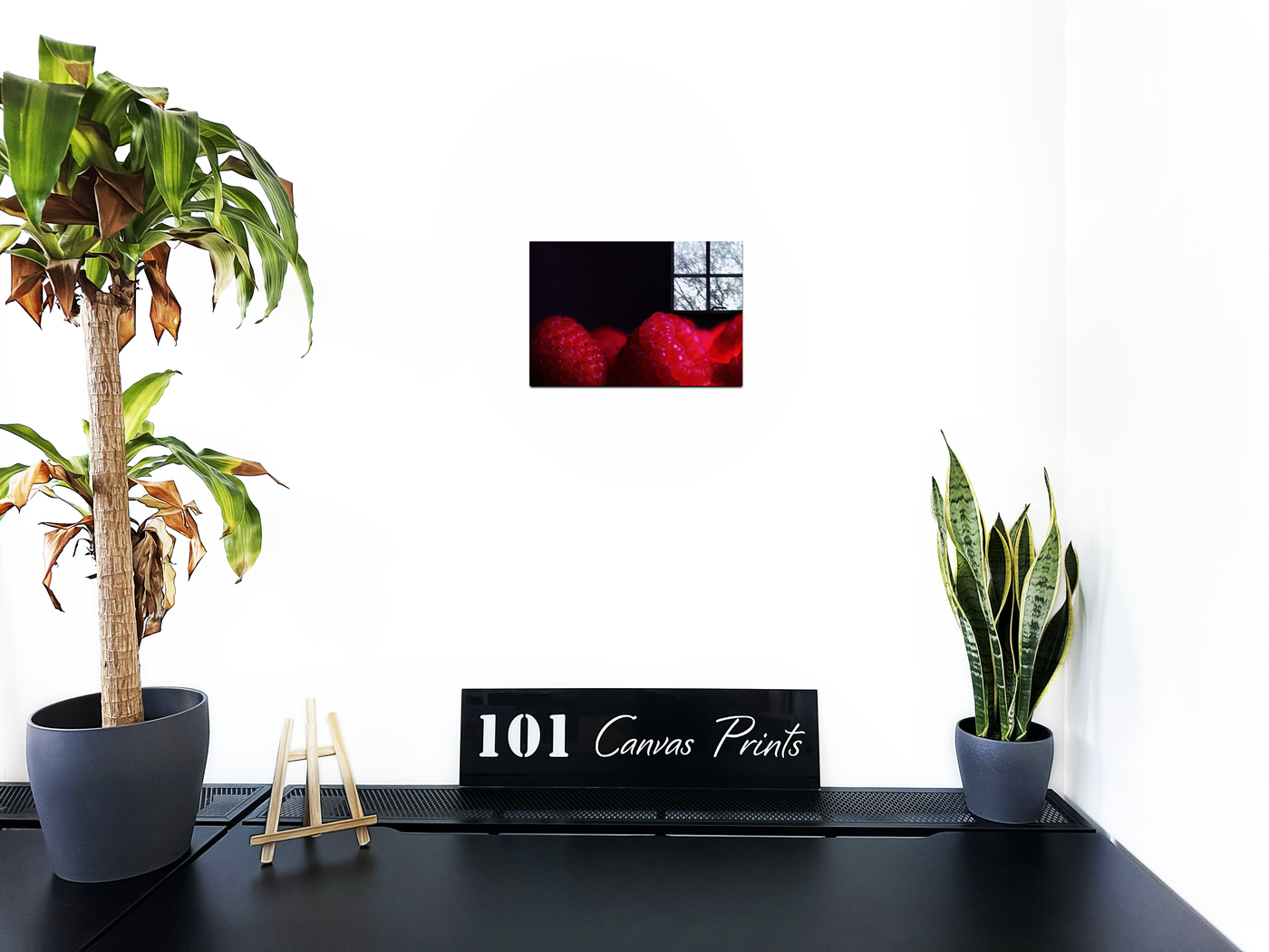 This atmospheric study of raspberries, expertly reproduced by the 101 Canvas Prints team, presents familiar fruit in an unfamiliar light. The composition creates intrigue through selective focus and dramatic lighting, with the berries appearing to emerge from deep shadow while a subtle window reflection provides environmental context. The photographer has transformed these simple fruits into a study of form and light worthy of Fine Art galleries.