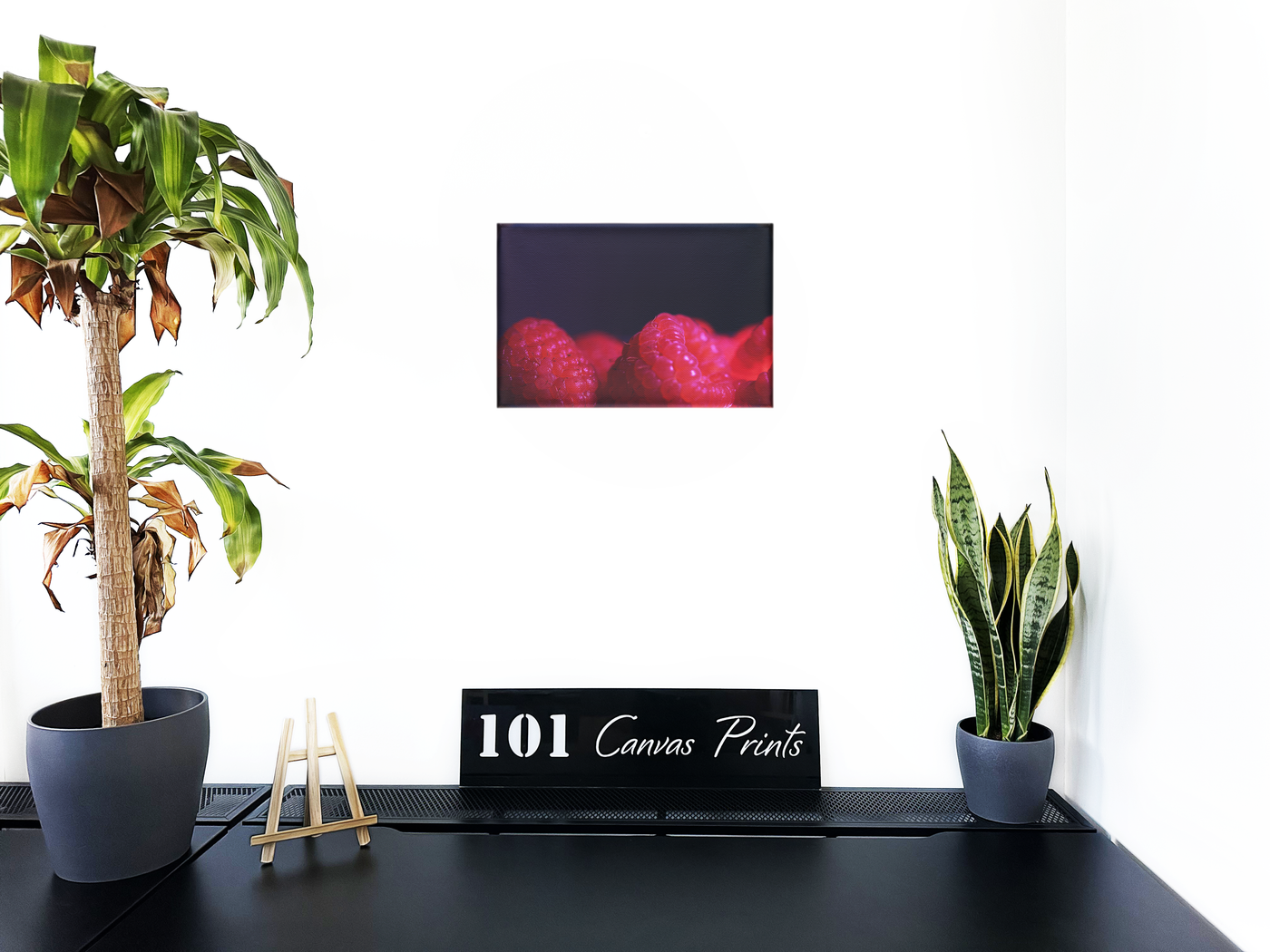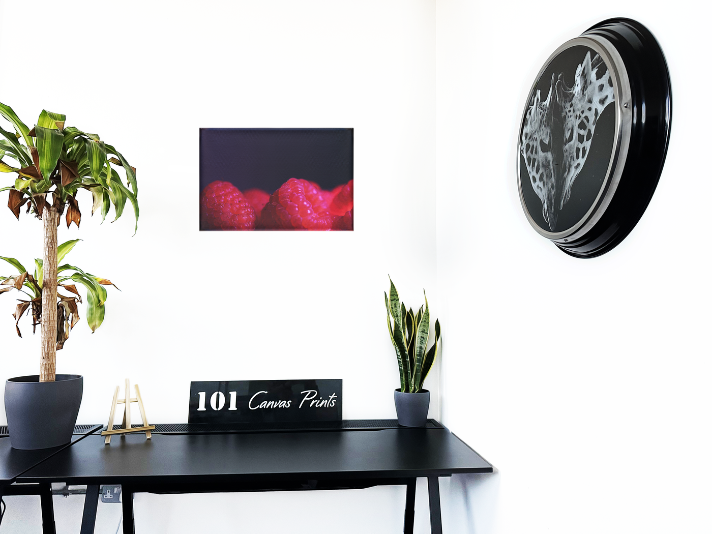 Masterfully captured by the 101 Canvas Prints photography team, this moody still life presents raspberries in a dramatic chiaroscuro style. The composition plays with depth and shadow, showing the berries emerging from darkness while a window's reflection adds atmospheric context to the scene. This artistic approach transforms these simple fruits into subjects worthy of Dutch master painting, with each berry carefully positioned to create a sense of depth and mystery.