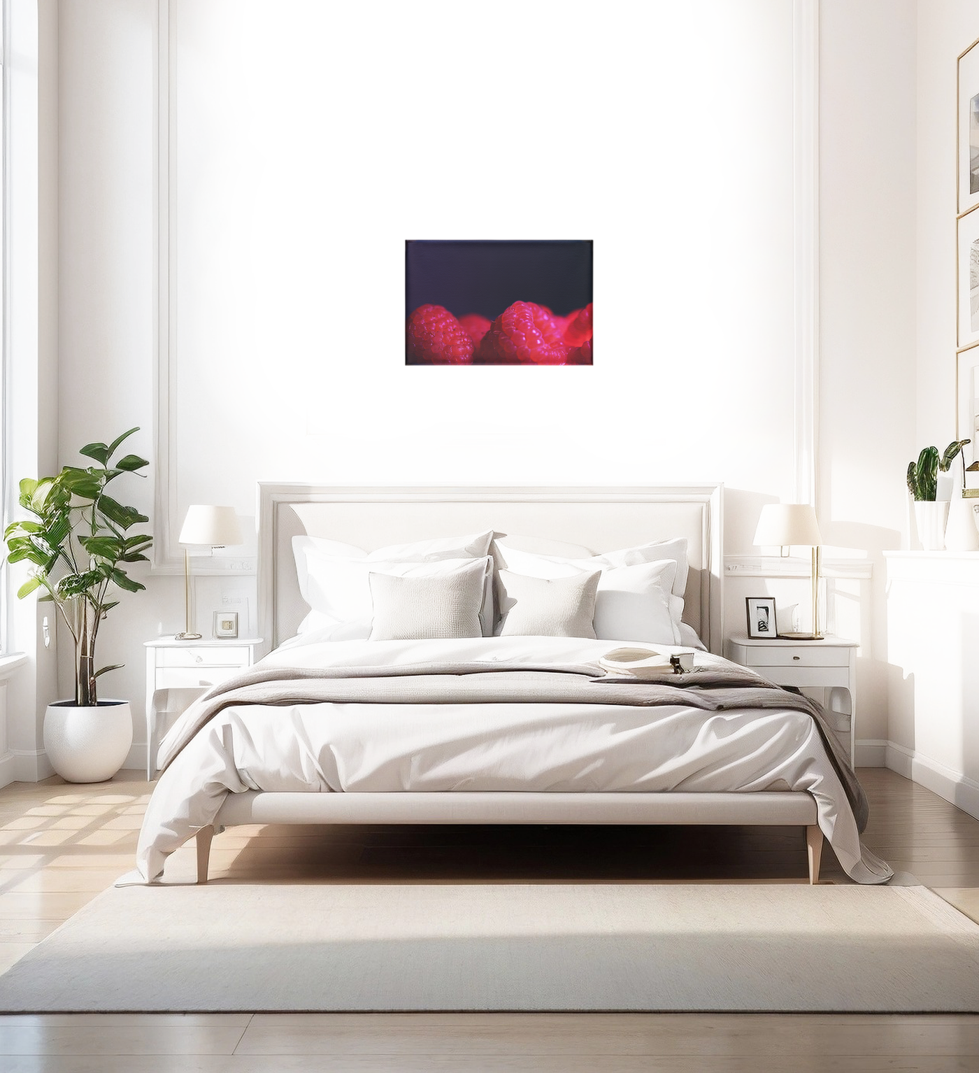 The colour palette is richly focused on various shades of red, from bright crimson highlights to deep burgundy shadows that merge with the black background. Our print enhancement team have preserved every subtle detail of the berries' texture, from their distinctive dimpled surface to the delicate fibres visible in the extreme close-up. The interplay between light and shadow creates a sophisticated depth that elevates these humble fruits into Fine Art.