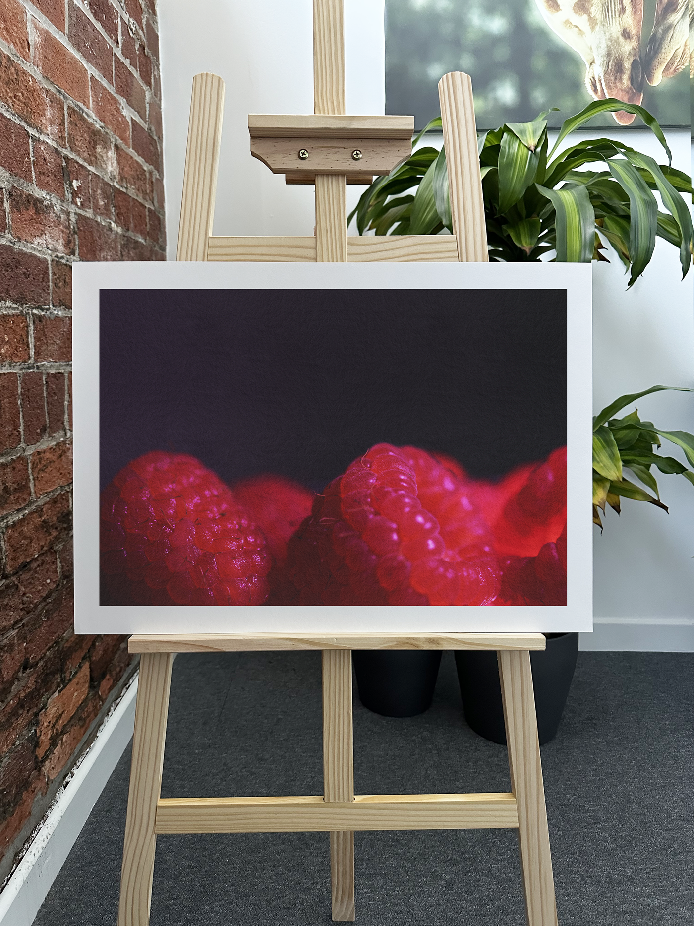 The colour palette is richly focused on various shades of red, from bright crimson highlights to deep burgundy shadows that merge with the black background. Our print enhancement team have preserved every subtle detail of the berries' texture, from their distinctive dimpled surface to the delicate fibers visible in the extreme close-up. The interplay between light and shadow creates a sophisticated depth that elevates these humble fruits into Fine Art.