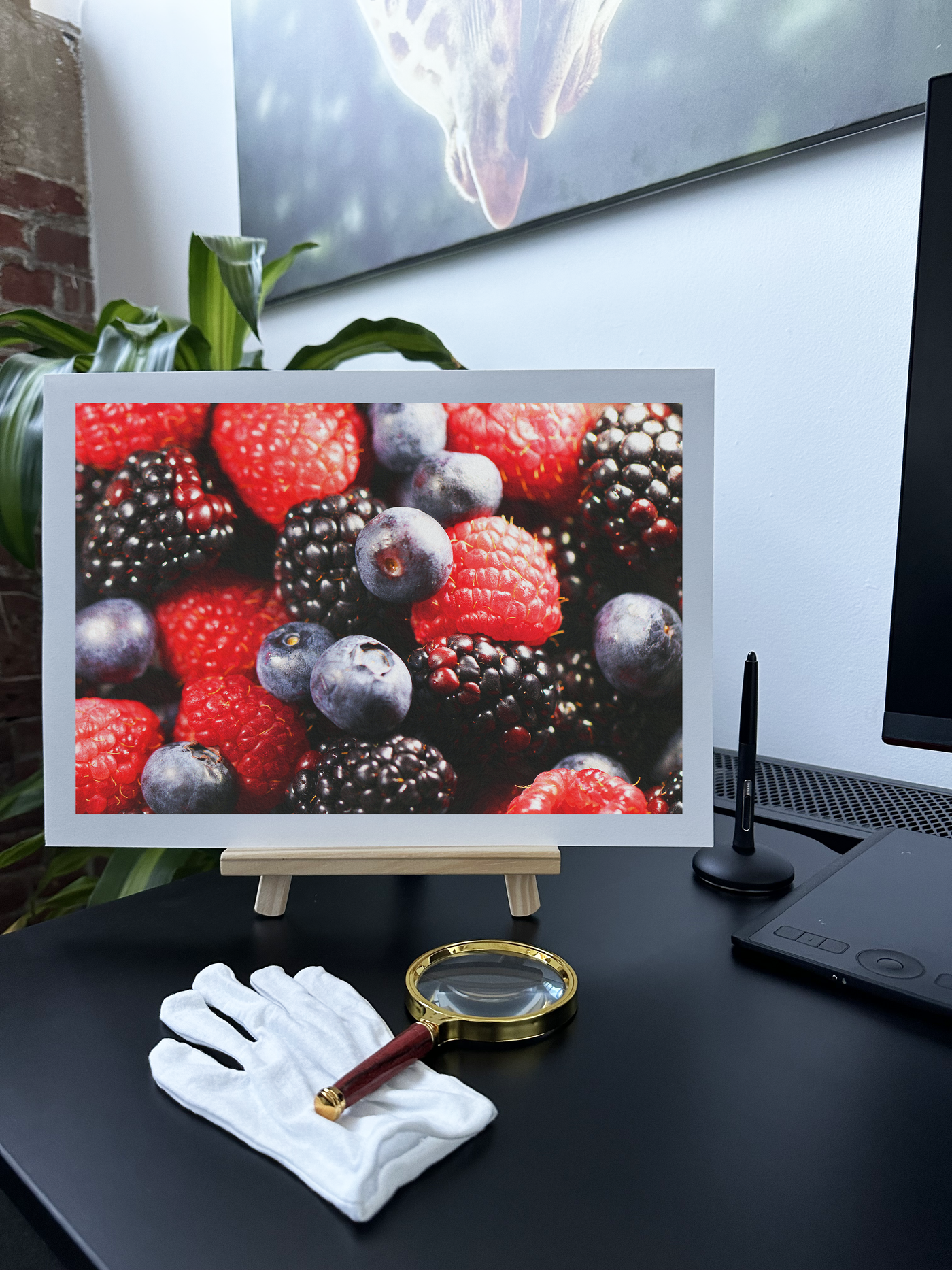Our advanced printing techniques ensure that the vibrant colours and intricate details of this fruity scene are faithfully reproduced on Fine Art paper. The rich reds, deep purples, and luscious blacks create a symphony of colour that's sure to catch the eye and stimulate the appetite.
