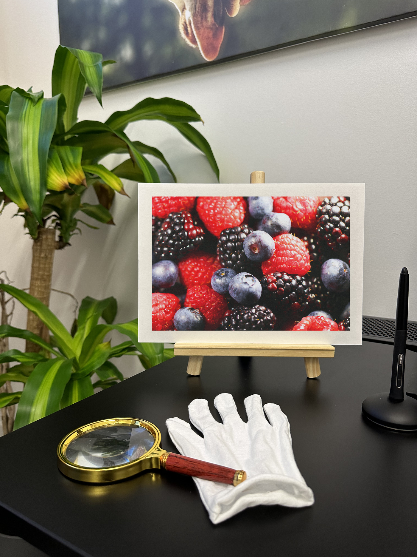 The Fine Art paper texture adds a subtle, organic quality to this image, complementing the natural subject matter. Observe how the slightly rough surface of the Fine Art paper interacts with the varied textures of the berries, from the glossy smoothness of the blueberries to the seeded surface of the strawberries and the intricate structure of the blackberries. This interplay enhances the sense of realism and depth in the image.