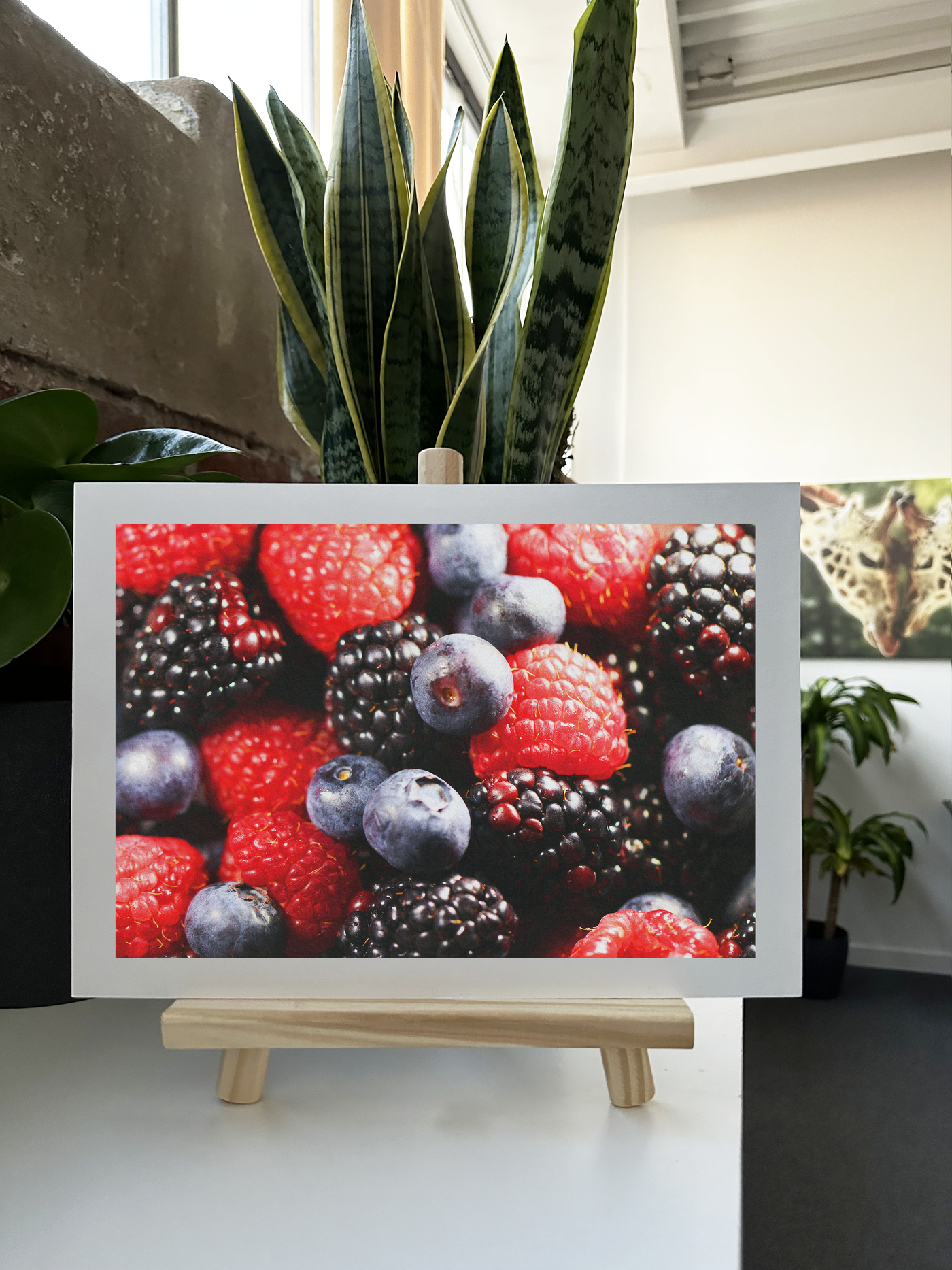Our advanced printing techniques ensure that the vibrant colours and intricate details of this fruity scene are faithfully reproduced on Fine Art paper. The rich reds, deep purples, and luscious blacks create a symphony of colour that's sure to catch the eye and stimulate the appetite.