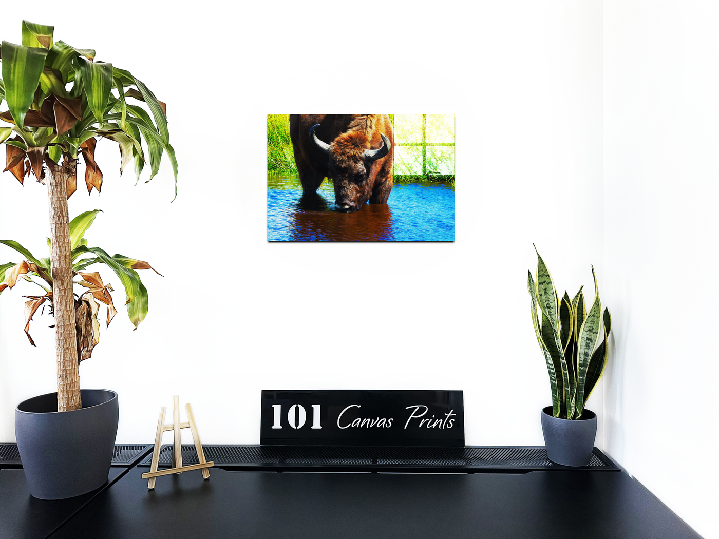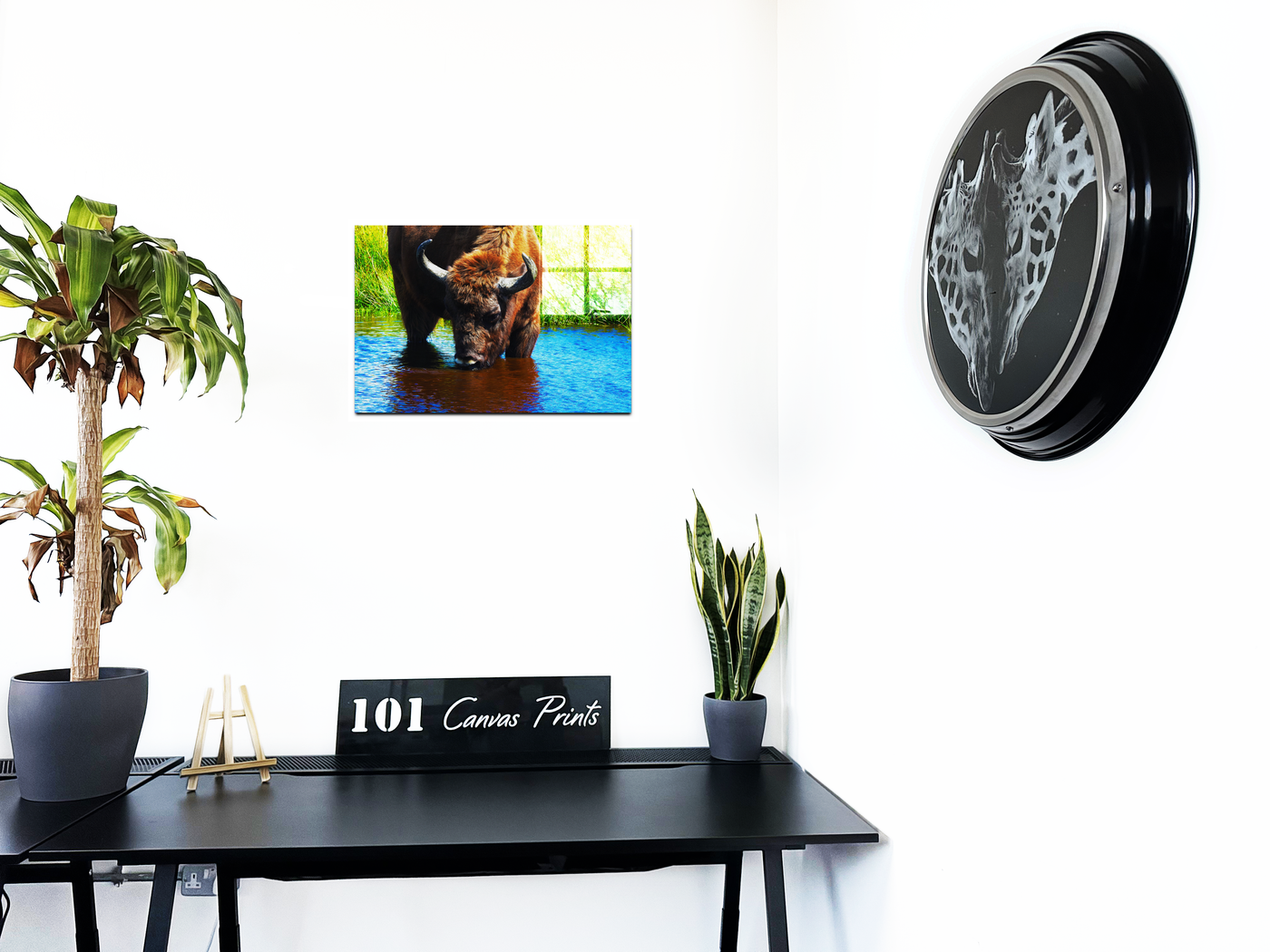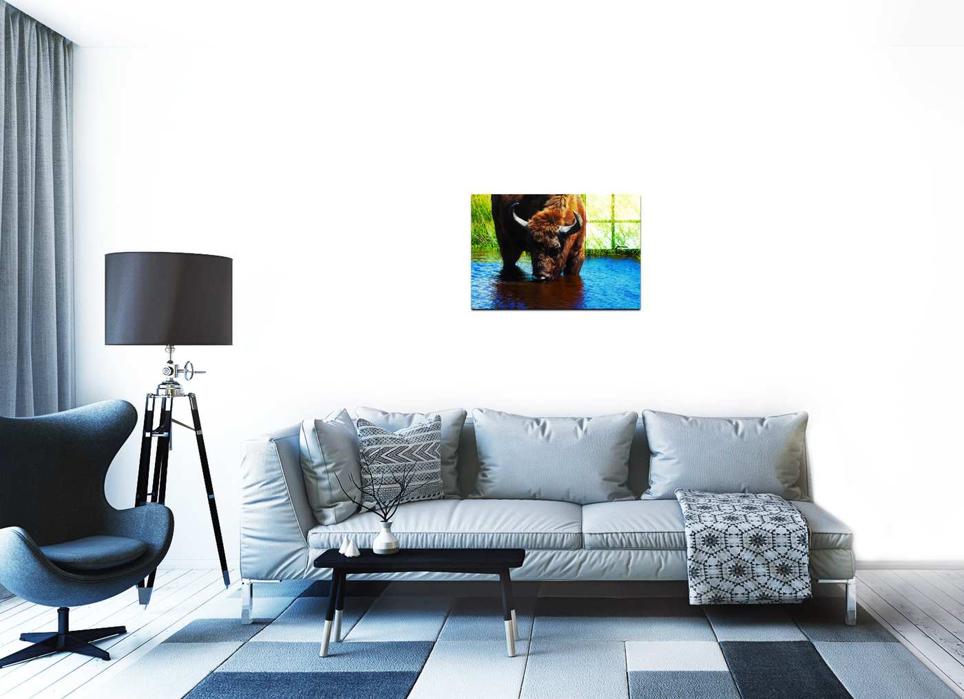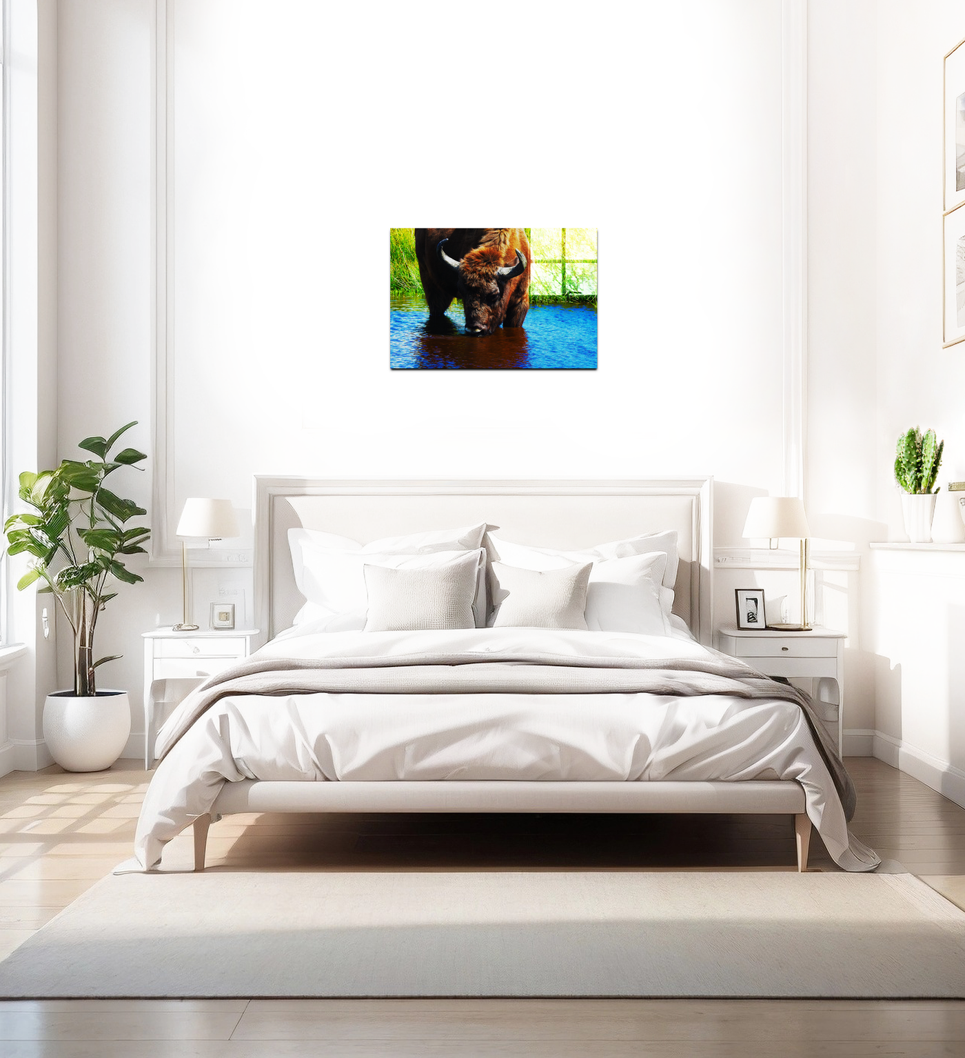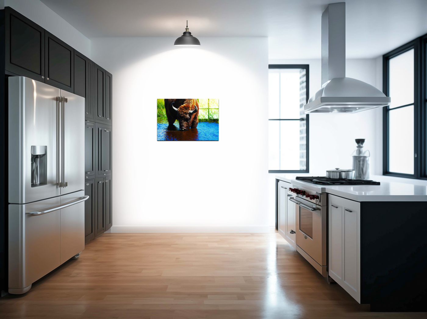 Captured in one of the few places he can be found, this Acrylic print brings to life the grace and power of an enamoured bison at a watering hole.