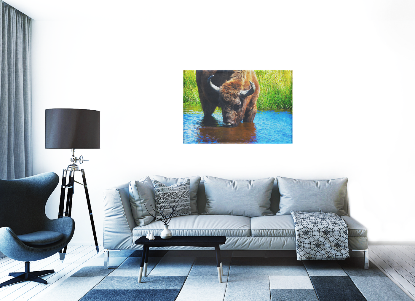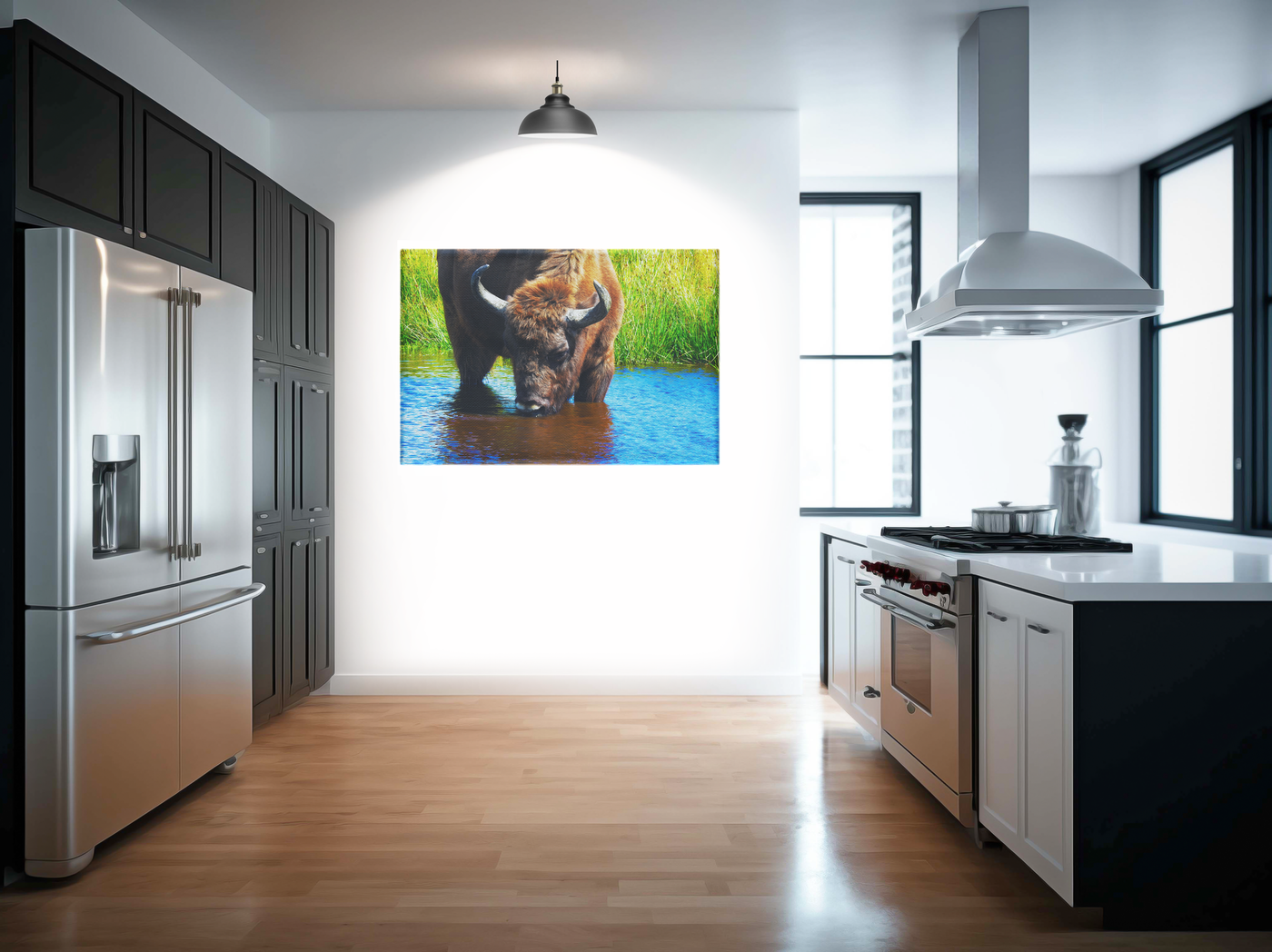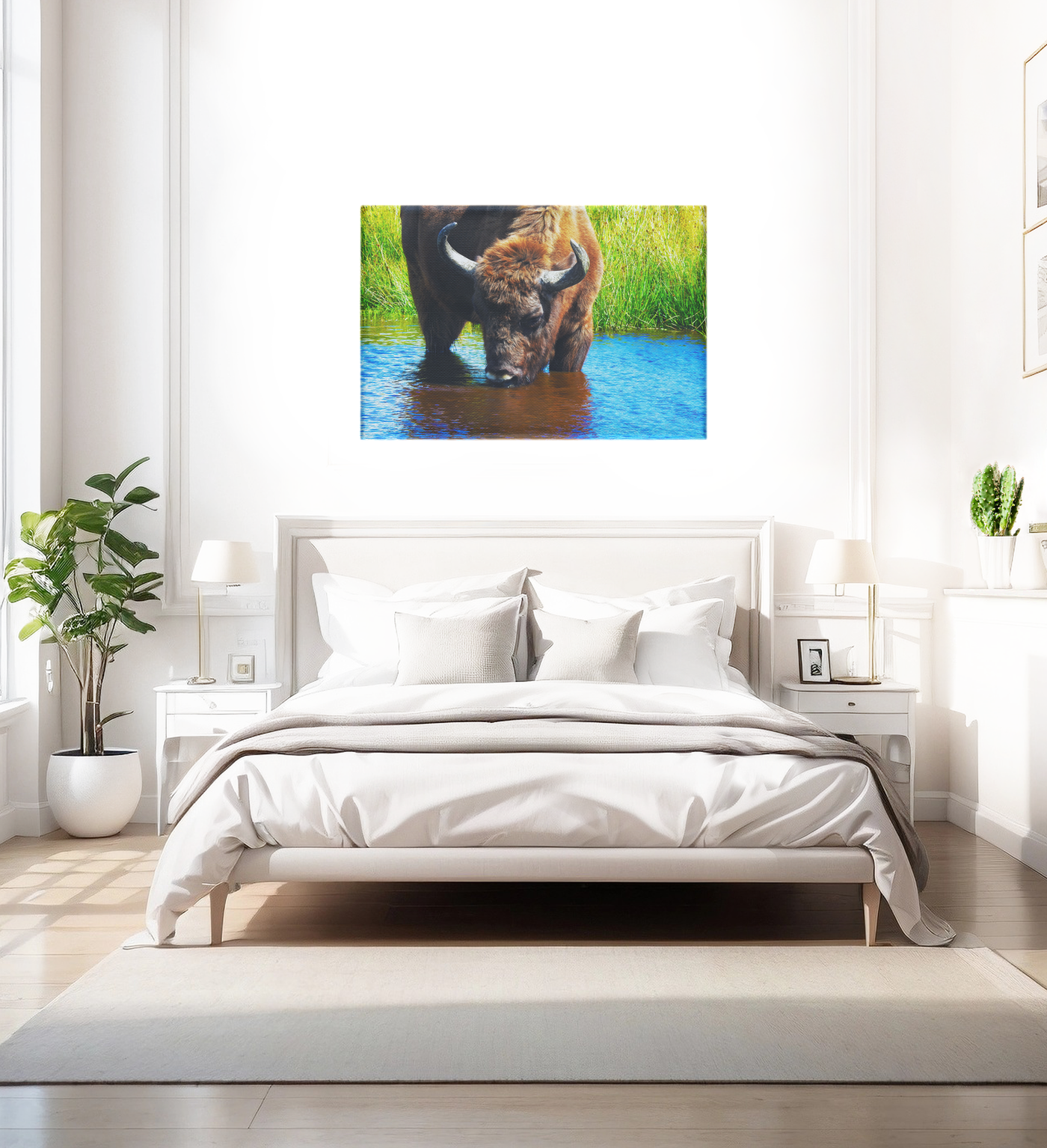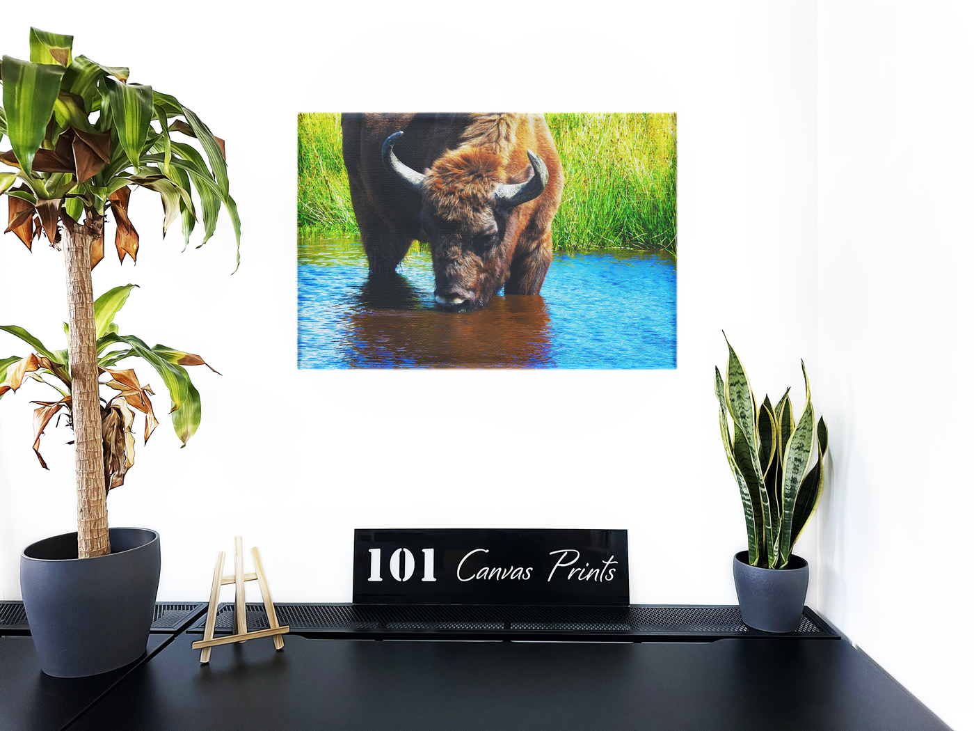 Captured in one of the few places he can be found, this Canvas print brings to life the grace and power of an enamoured bison at a watering hole.