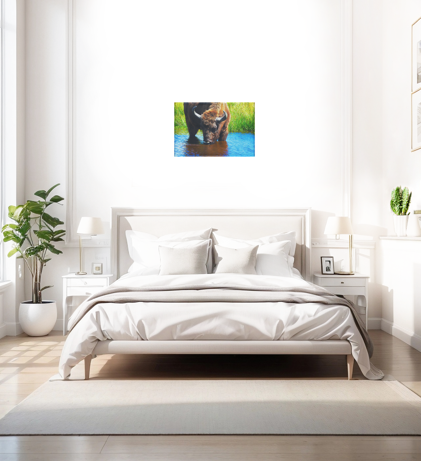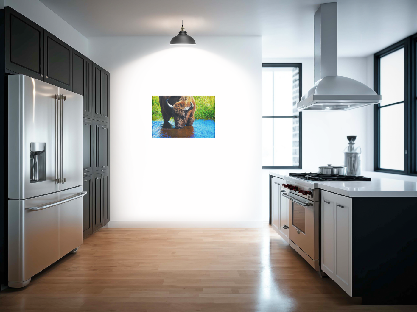 Captured in one of the few places he can be found, this Canvas print brings to life the grace and power of an enamoured bison at a watering hole.