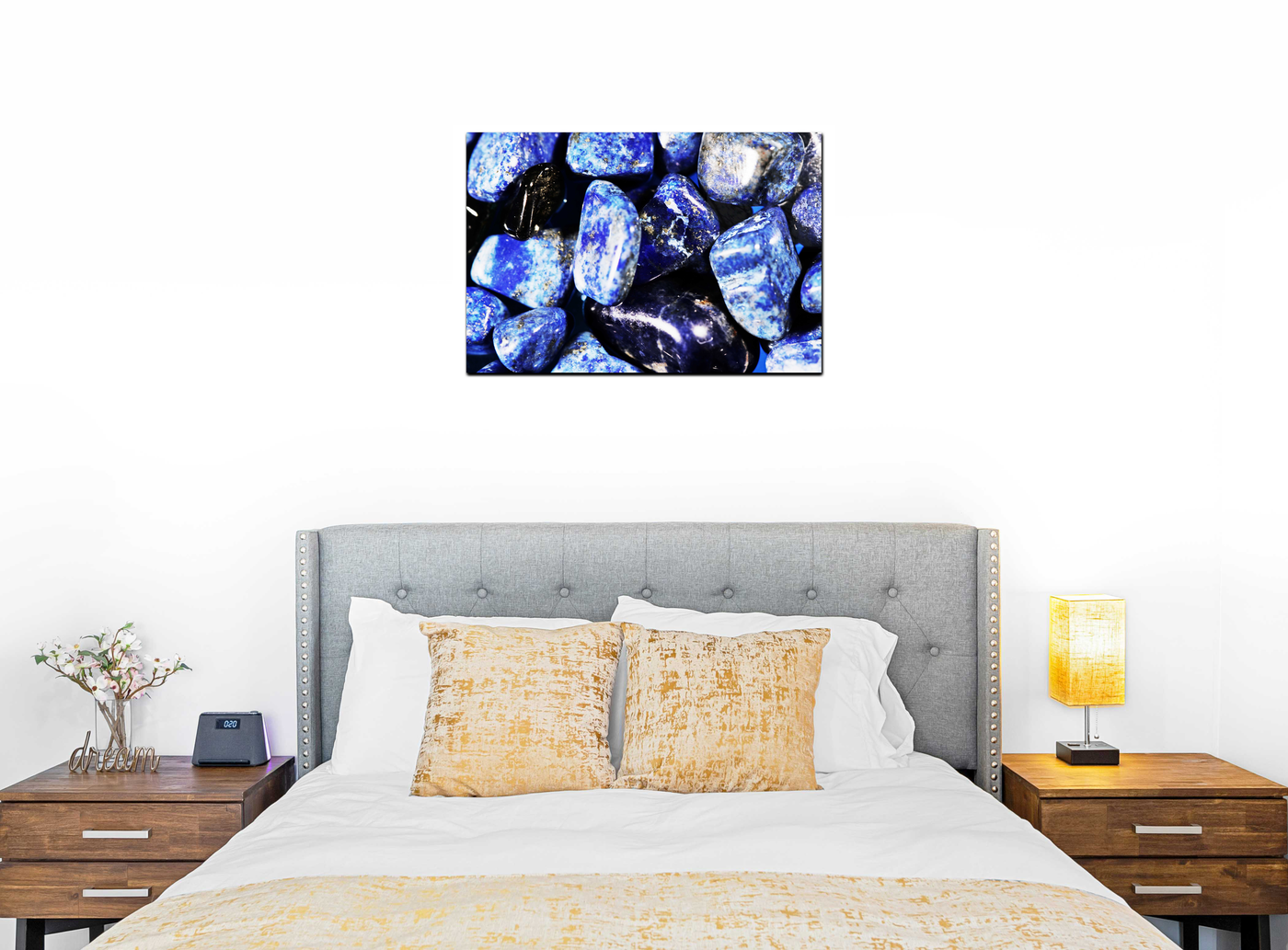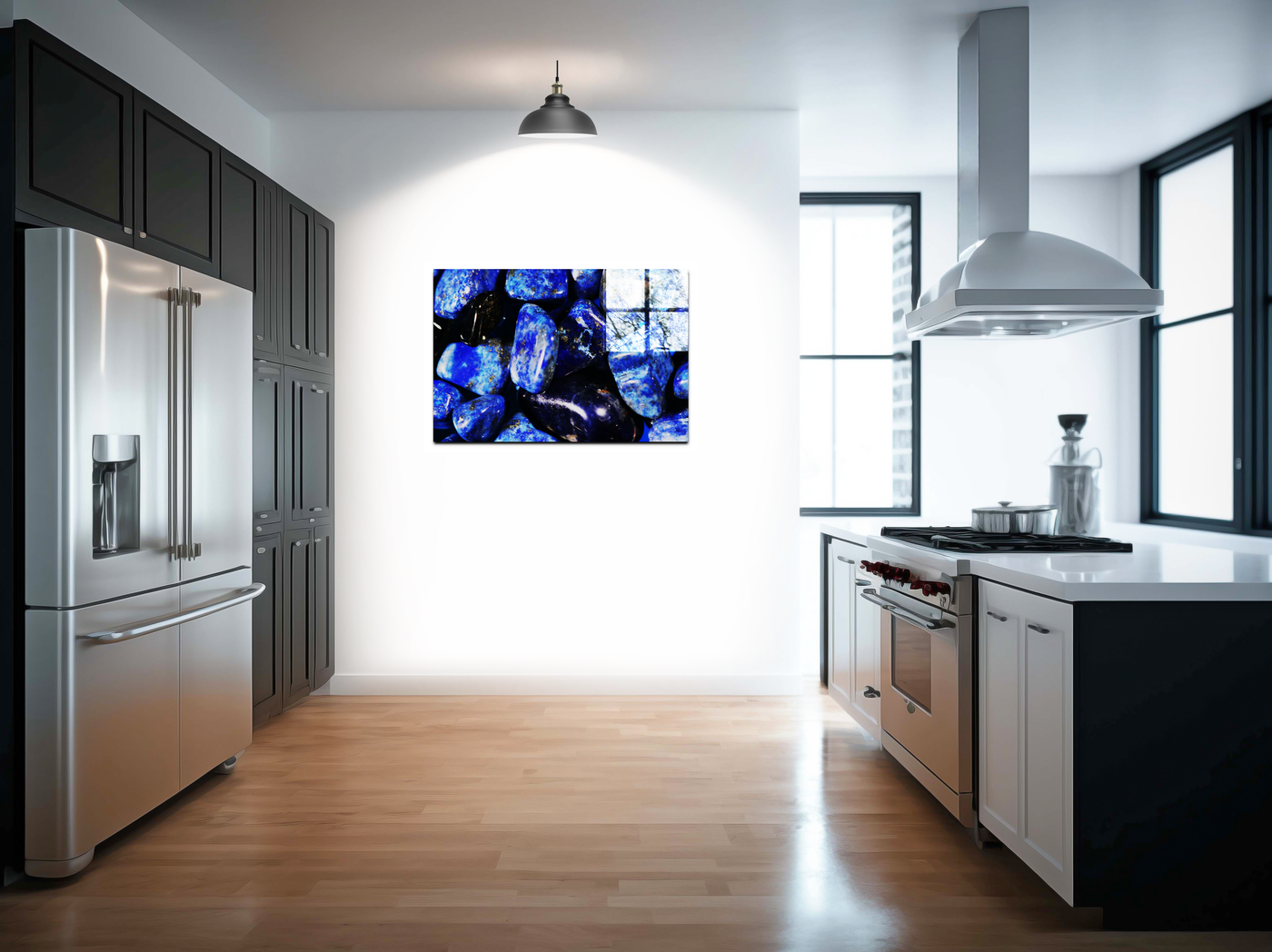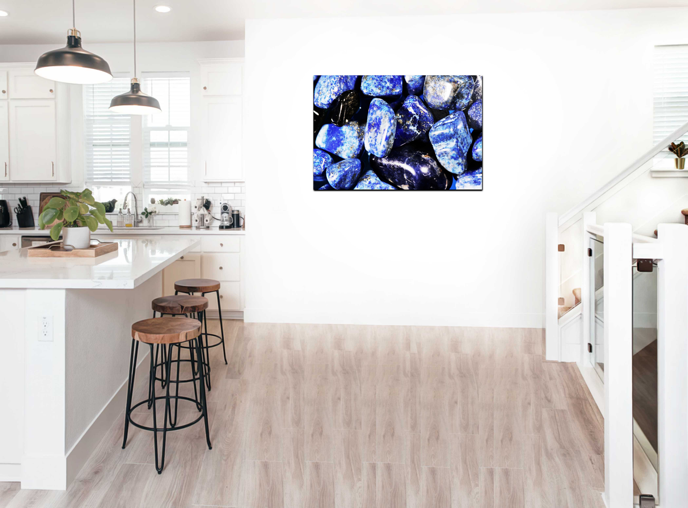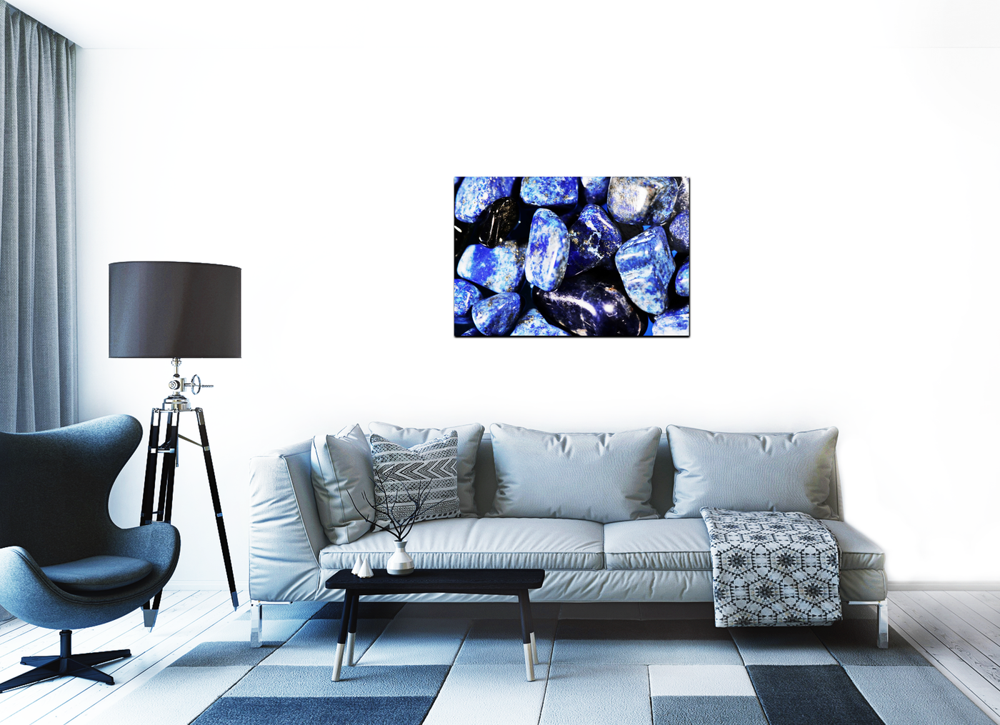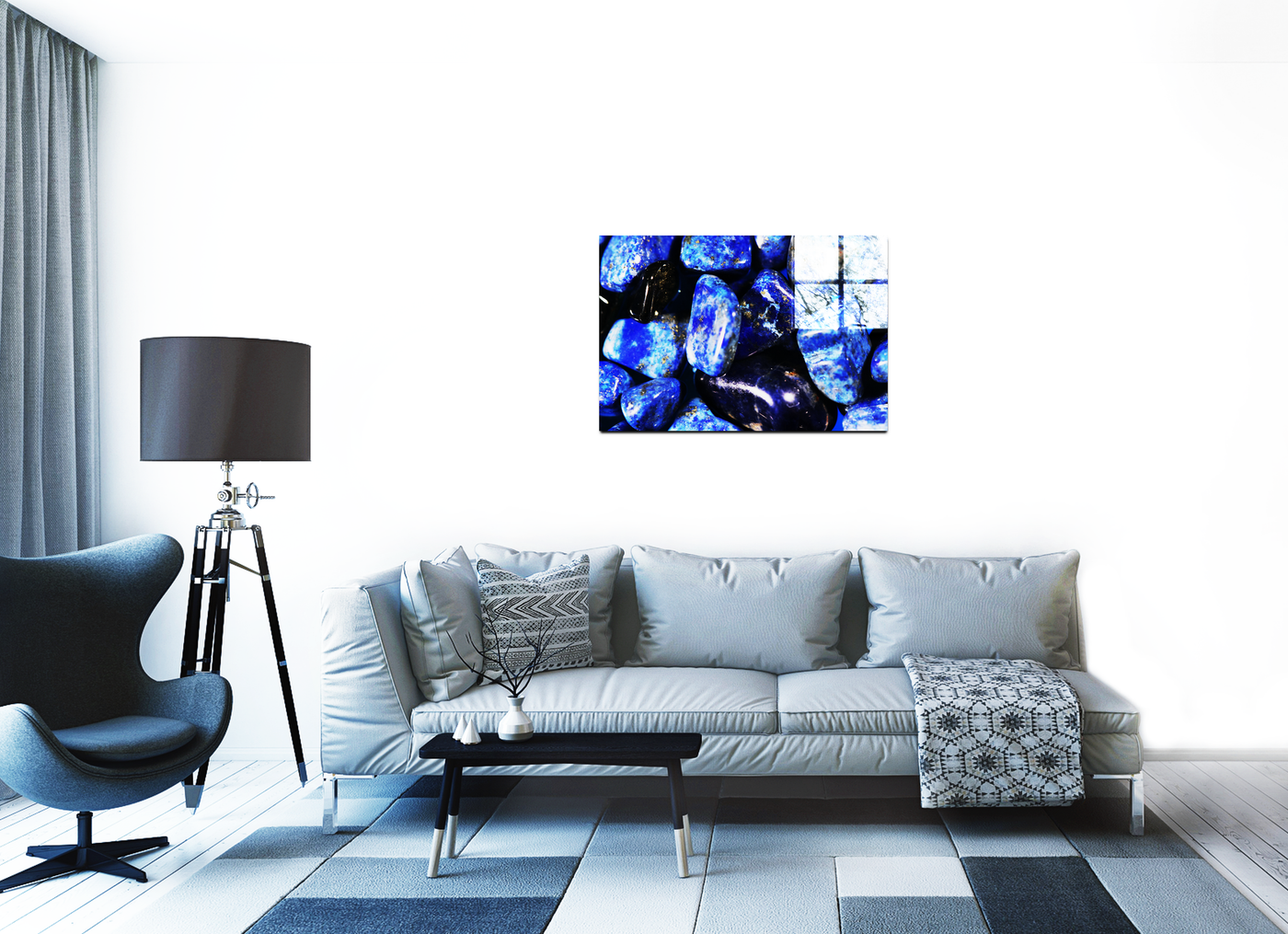 Our state-of-the-art printing process ensures that every detail is preserved, from the smooth, polished surfaces to the intricate veins and inclusions that make each stone unique. The Acrylic medium enhances the gemstones' natural lustre, making the blues appear even more vibrant and giving the impression that the stones are wet or submerged in water.