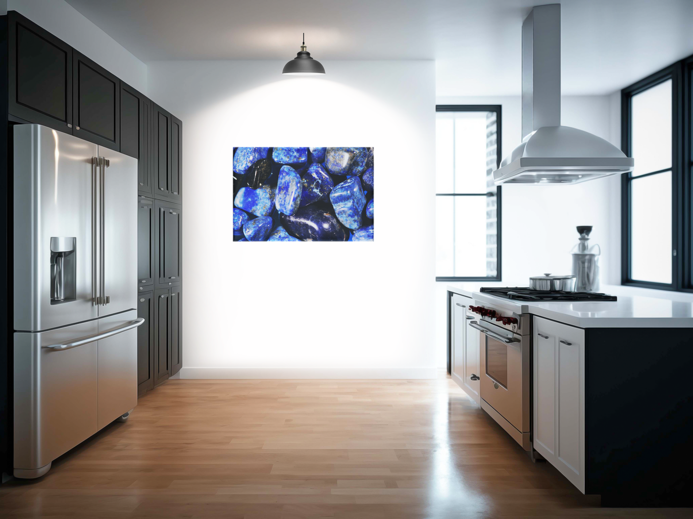 The Canvas texture adds a unique dimension to the image, softening the hard edges of the stones and creating a more painterly effect. This enhances the dreamy quality of the deep blue hues, reminiscent of the night sky or the depths of the ocean. The subtle texture of the Canvas also complements the natural variations in the lapis lazuli, highlighting the interplay of deep blues, white calcite, and glittering pyrite.