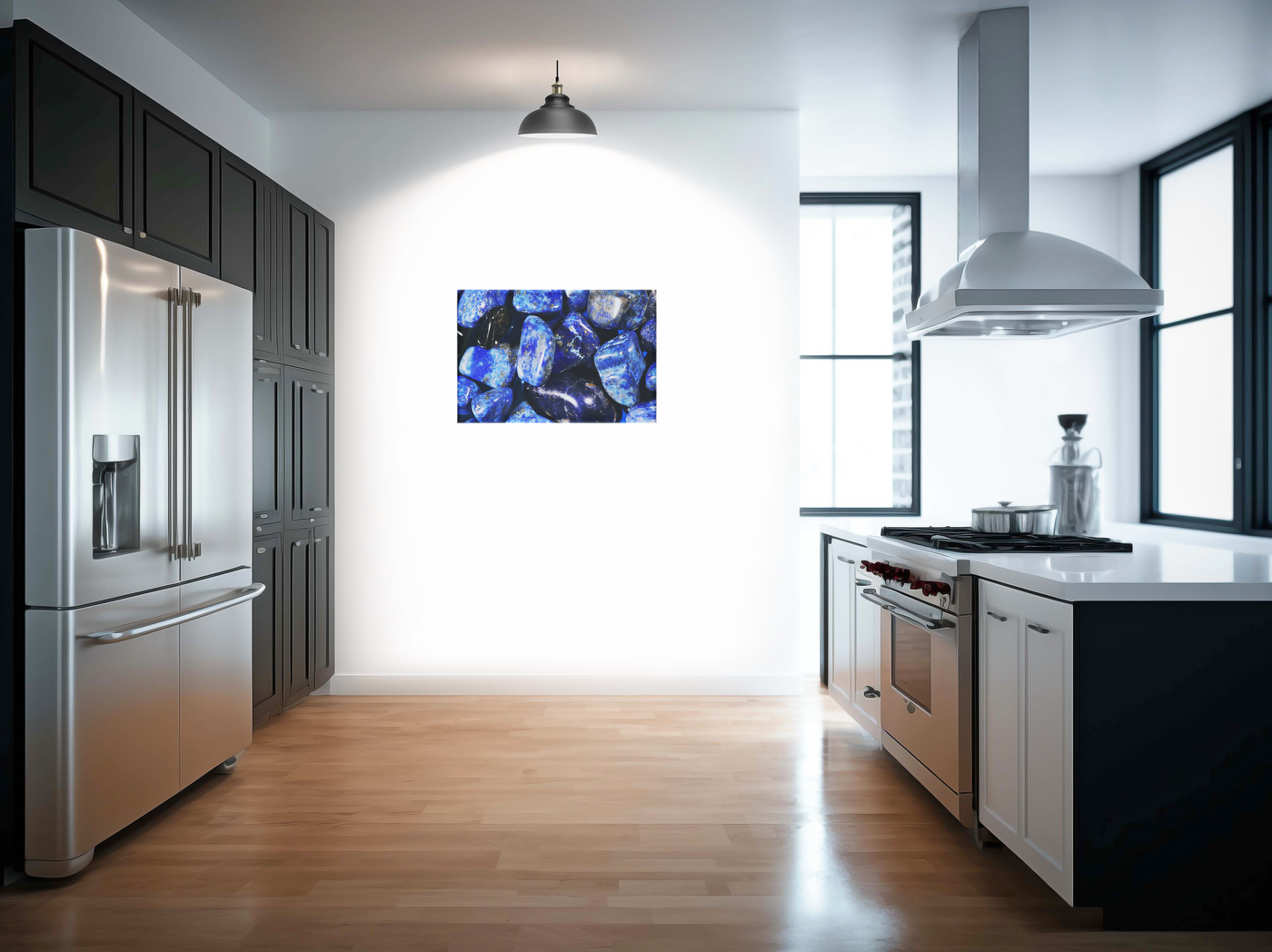 The Canvas texture adds a unique dimension to the image, softening the hard edges of the stones and creating a more painterly effect. This enhances the dreamy quality of the deep blue hues, reminiscent of the night sky or the depths of the ocean. The subtle texture of the Canvas also complements the natural variations in the lapis lazuli, highlighting the interplay of deep blues, white calcite, and glittering pyrite.