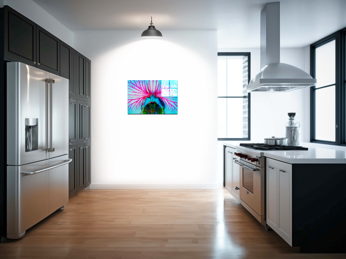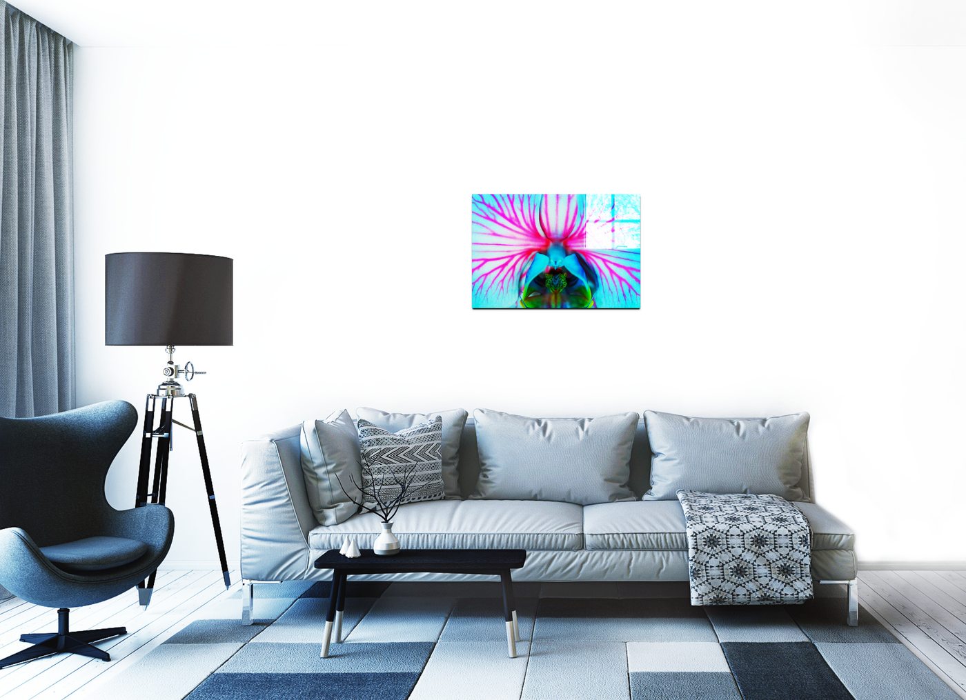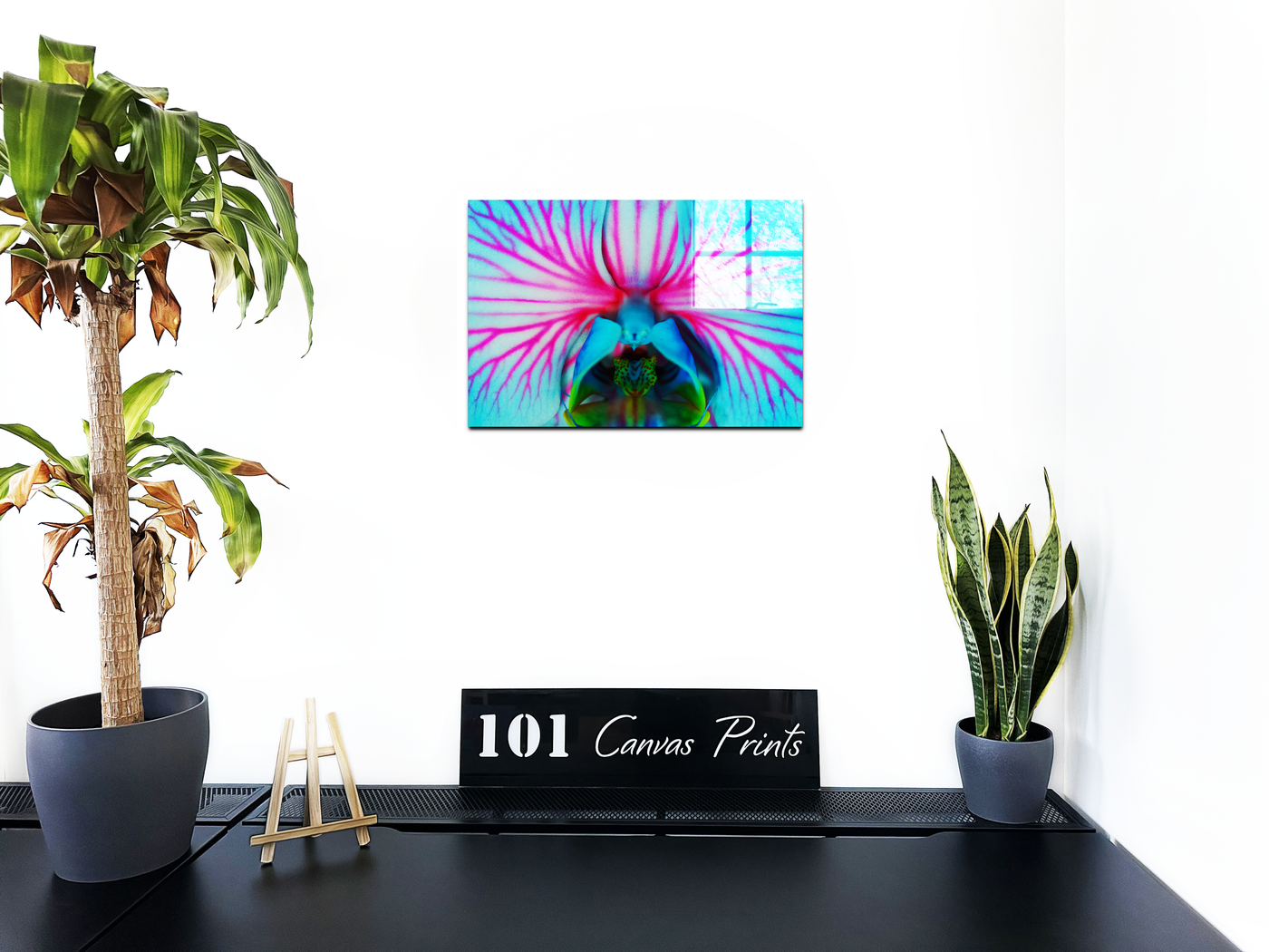 The crystal-clear Acrylic medium perfectly enhances the electric blues, shocking pinks, and vivid greens of this macro orchid image. The translucent quality of the Acrylic creates an illusion of depth, making it appear as if you're peering into the very heart of the flower. The glossy finish amplifies the intensity of the colours, giving them an almost neon-like glow that captivates the eye.