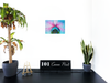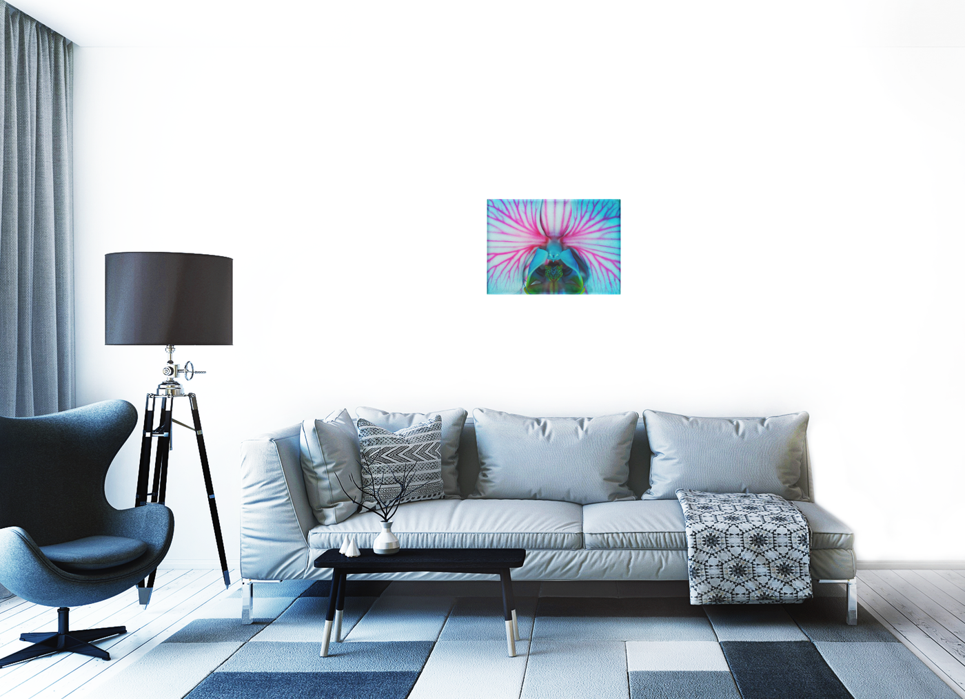 The natural texture of the Canvas softens the electric hues of the image, creating a harmonious balance between the vibrant colours and the organic feel of the print. This interplay enhances the dreamlike quality of the macro photograph, making the fluorescent pinks, ethereal blues, and lime greens appear to glow from within the fabric.