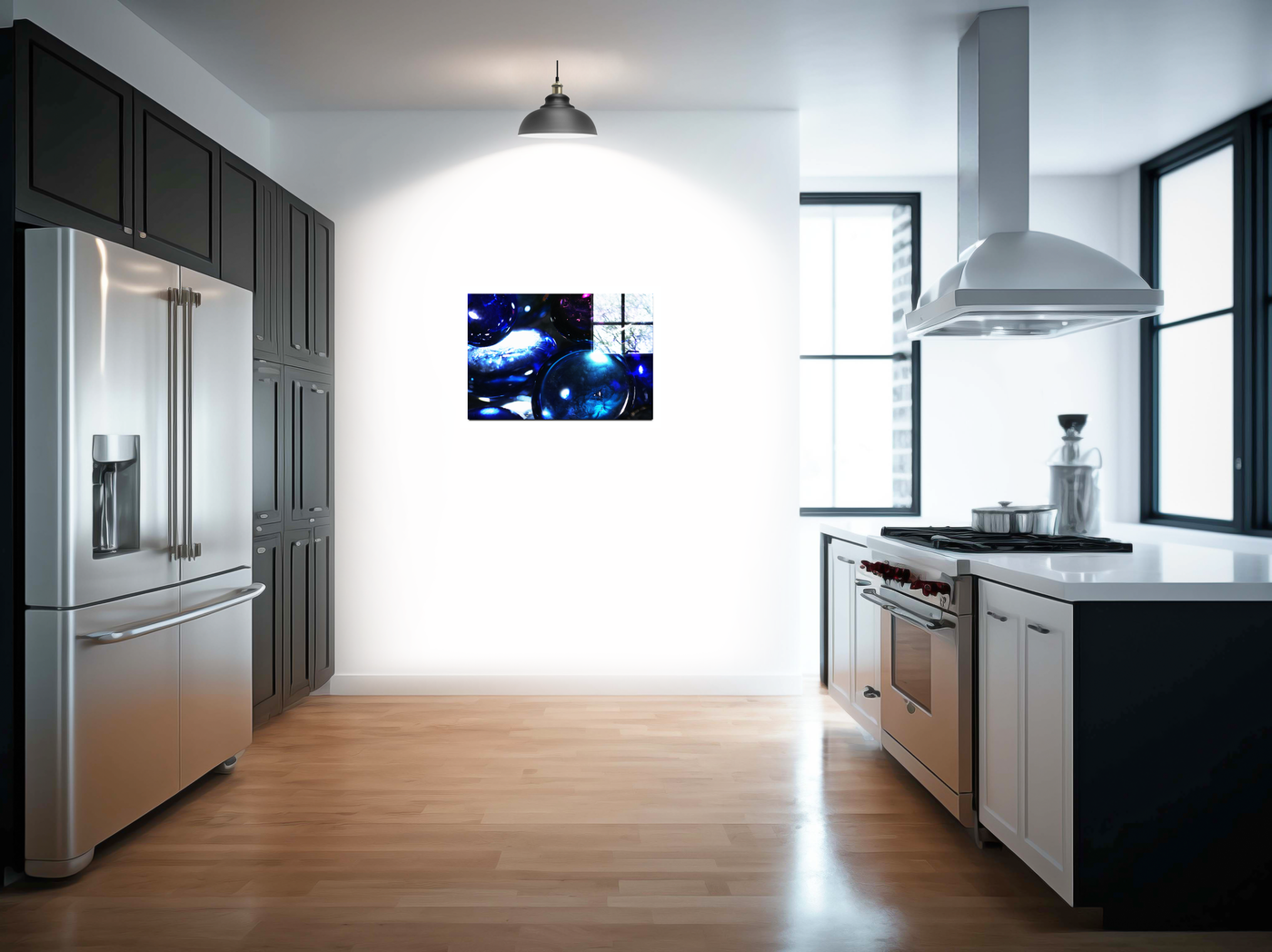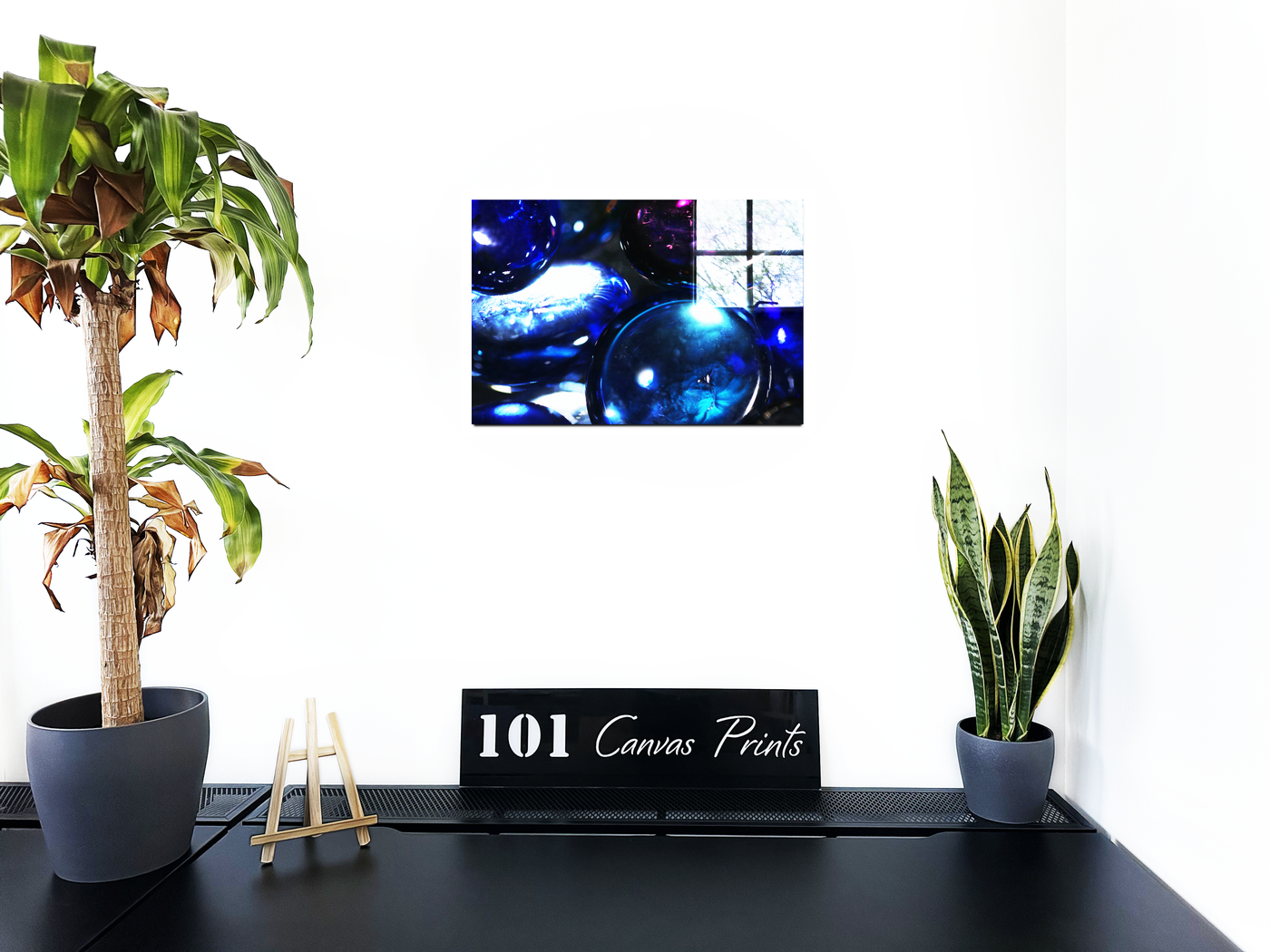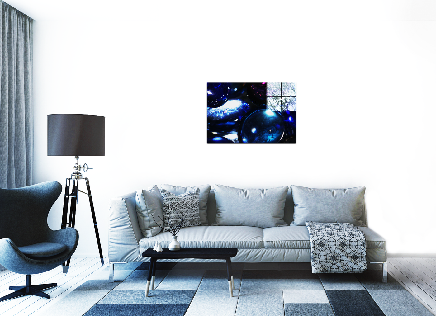 The Acrylic medium amplifies the ethereal quality of this image, enhancing the deep blues and adding a lustrous sheen to the orbs. Notice how the glossy surface of the Acrylic mimics the reflective nature of the spheres, creating an illusion of depth and movement. The interplay of light and shadow, coupled with the varying shades of blue, evokes a sense of mystery and wonder.