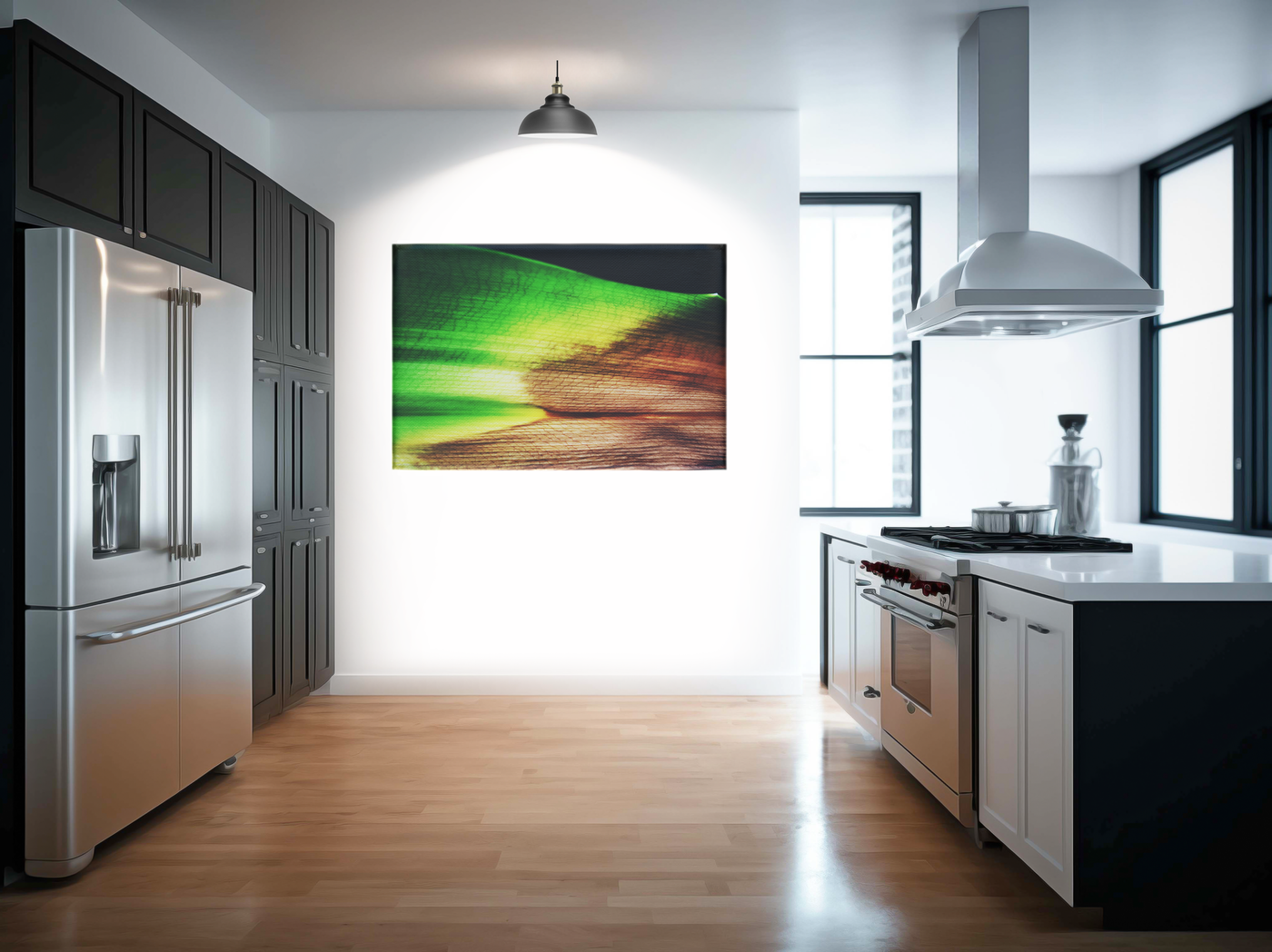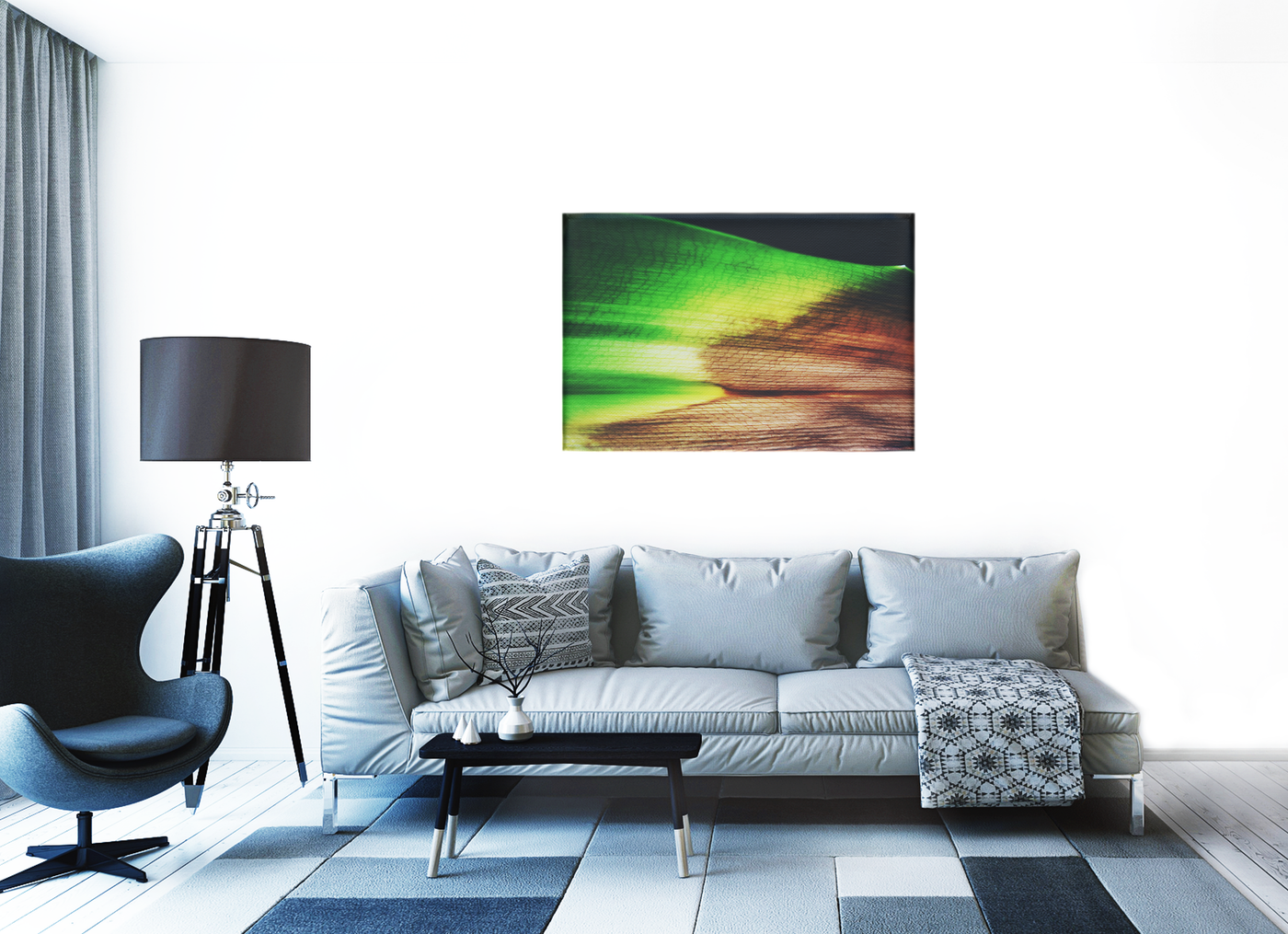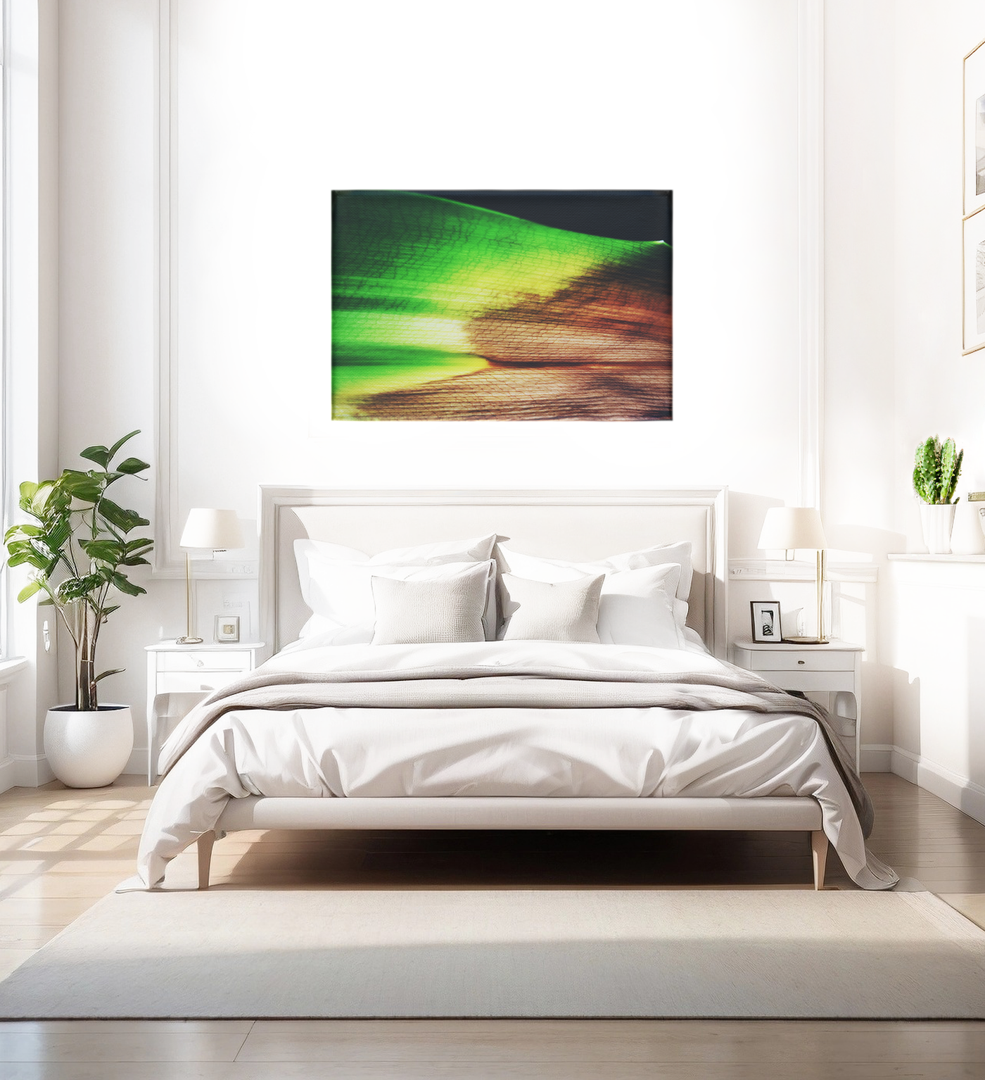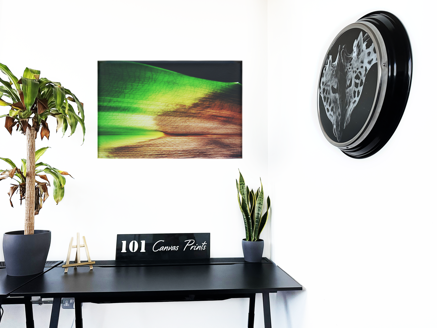 This captivating Canvas print offers an intimate, abstract view of nature's artistry, presenting a mesmerising close-up of a leaf. The composition is a study in organic forms and natural gradients, with sweeping curves and intricate vein patterns creating a sense of movement across the frame. The image invites viewers to explore the minute details of the natural world, revealing the extraordinary complexity and beauty hidden within seemingly simple plant life.