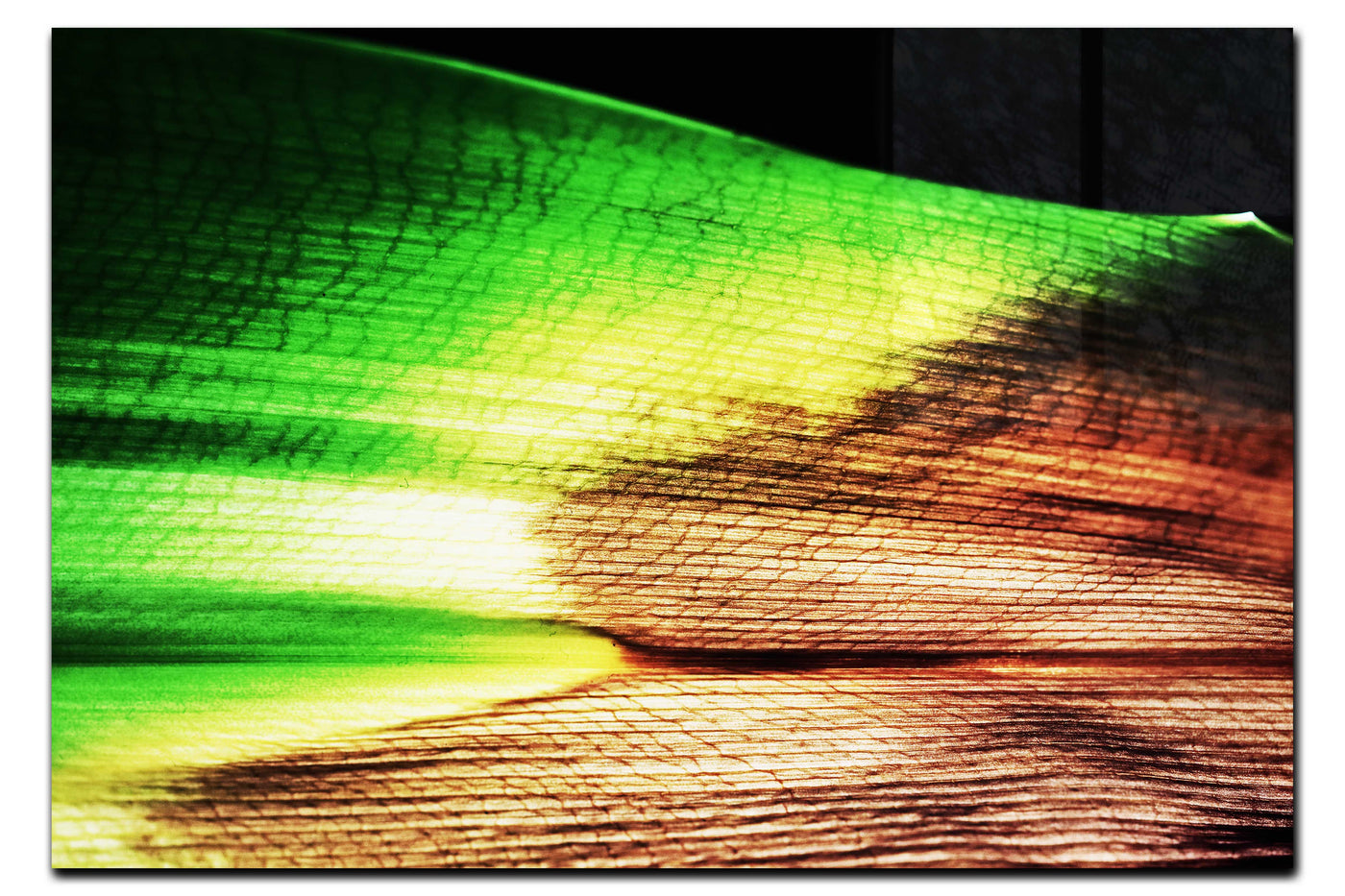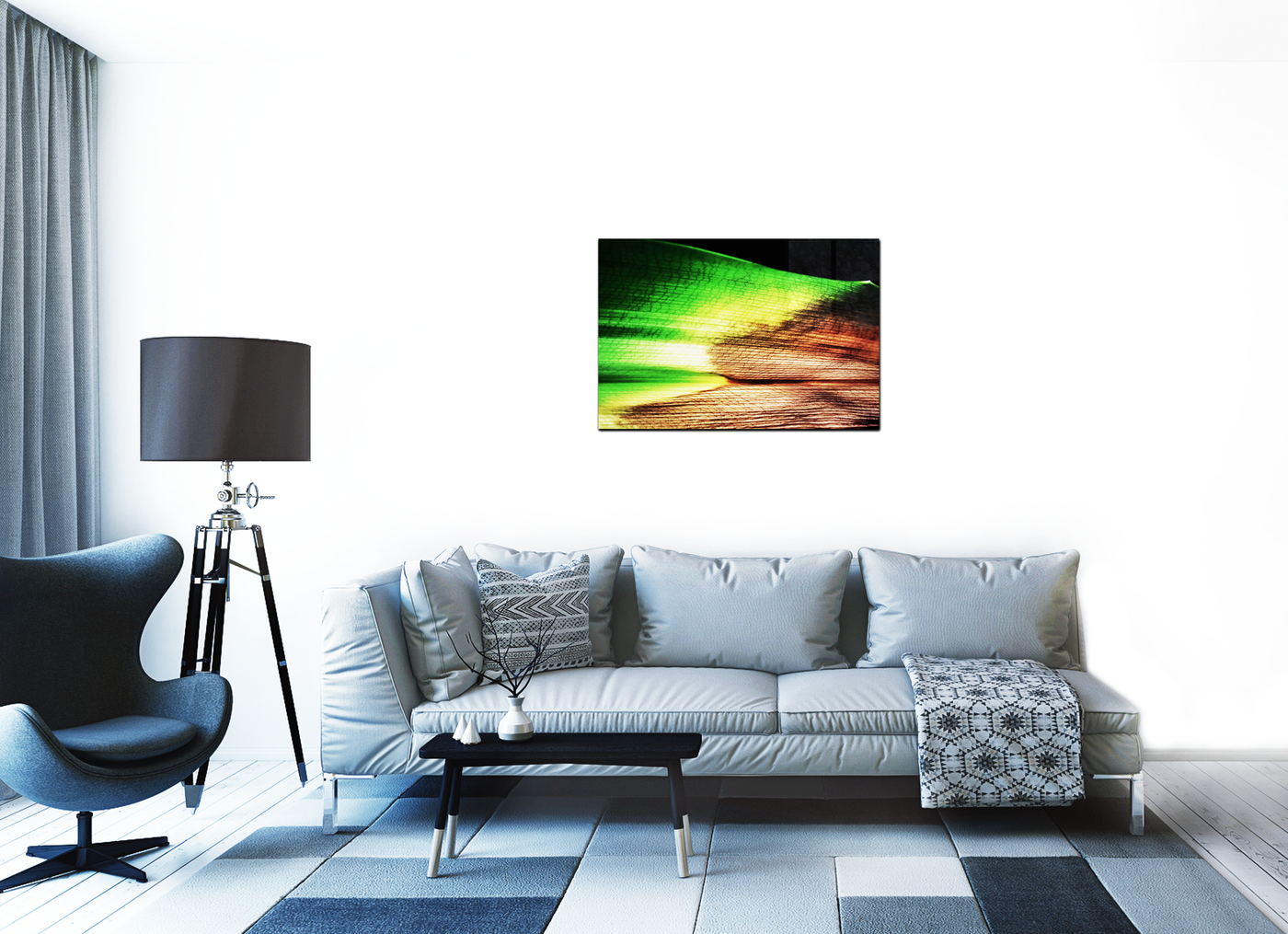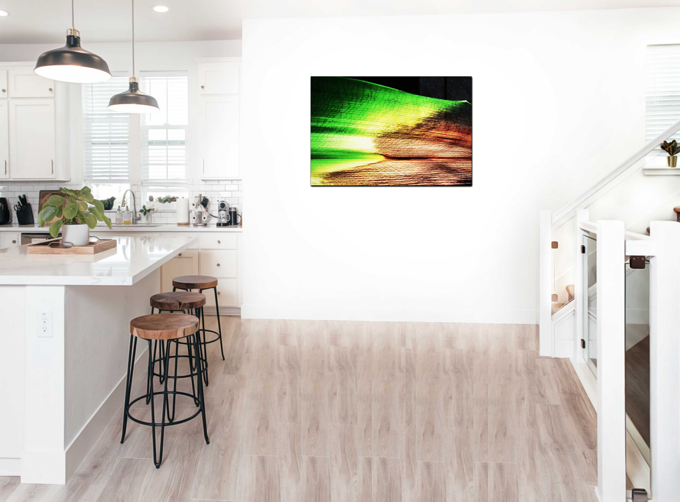 The Acrylic medium brings extraordinary clarity and depth to this botanical tableau. The colour palette is a celebration of nature's vibrancy, dominated by an electric green that seems to pulse with life on the left side of the image. This intense green transitions through a luminous yellow-green in the centre, before giving way to warm, rich browns and subtle reds on the right. This progression of colours not only creates a visually striking effect but also symbolises the life cycle of the leaf, from its verdant prime to its autumnal transformation. Throughout the image, delicate vein structures create a network of lines and textures, adding complexity and depth to the composition.