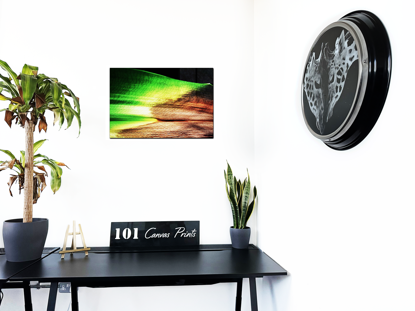 Immerse yourself in the microscopic marvels of plant life with this stunning acrylic-set print that transforms a leaf's structure into an abstract landscape of colour and form. The image presents an extreme close-up view of what appears to be a leaf or similar plant structure, revealing a world of intricate patterns and vibrant hues that often go unnoticed by the naked eye. The composition draws the viewer in, inviting exploration of every curve, vein, and colour transition.