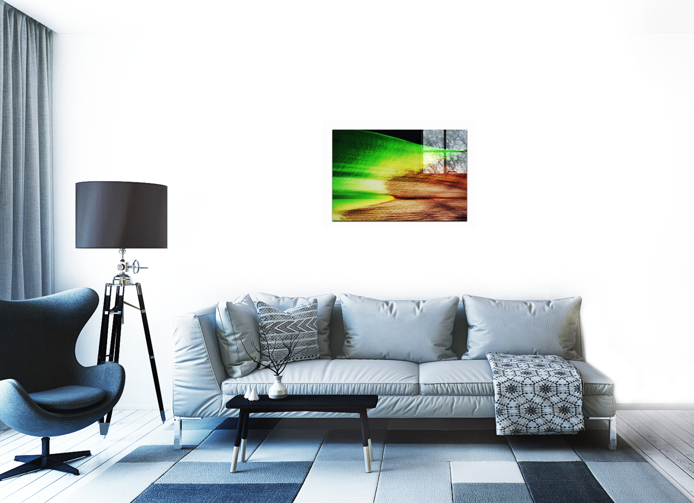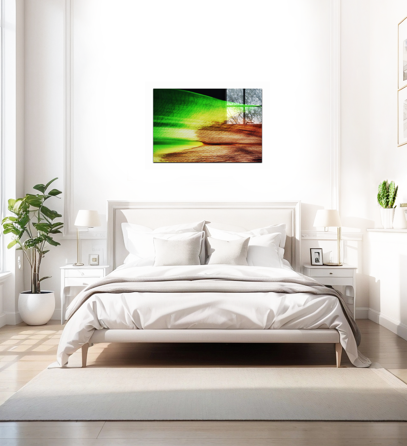The Acrylic medium brings extraordinary clarity and depth to this botanical tableau. The colour palette is a celebration of nature's vibrancy, dominated by an electric green that seems to pulse with life on the left side of the image. This intense green transitions through a luminous yellow-green in the centre, before giving way to warm, rich browns and subtle reds on the right. This progression of colours not only creates a visually striking effect but also symbolises the life cycle of the leaf, from its verdant prime to its autumnal transformation. Throughout the image, delicate vein structures create a network of lines and textures, adding complexity and depth to the composition.
