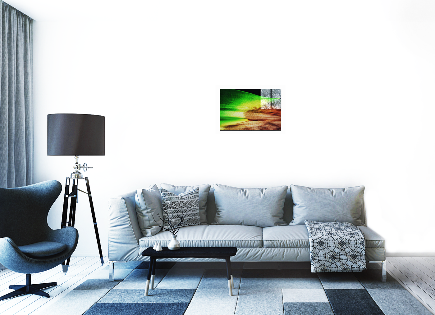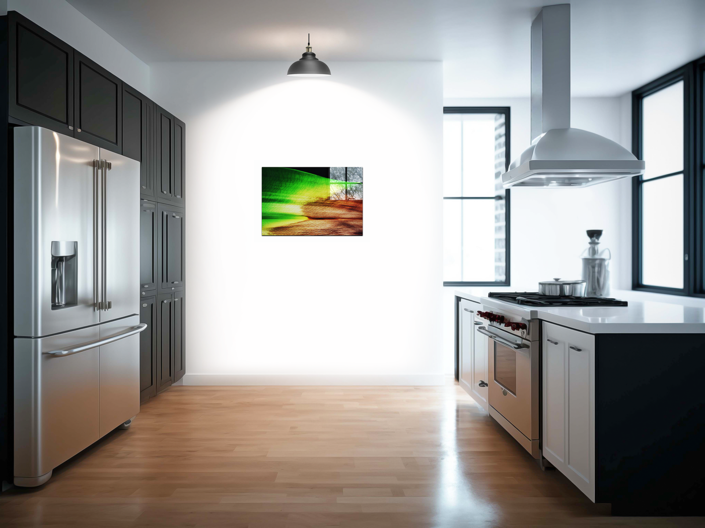 The Acrylic medium brings extraordinary clarity and depth to this botanical tableau. The colour palette is a celebration of nature's vibrancy, dominated by an electric green that seems to pulse with life on the left side of the image. This intense green transitions through a luminous yellow-green in the centre, before giving way to warm, rich browns and subtle reds on the right. This progression of colours not only creates a visually striking effect but also symbolises the life cycle of the leaf, from its verdant prime to its autumnal transformation. Throughout the image, delicate vein structures create a network of lines and textures, adding complexity and depth to the composition.