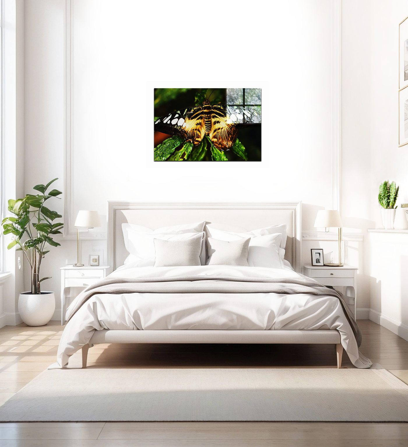 The crystal-clear Acrylic medium brings this image to life, enhancing the butterfly's intricate patterns and rich golden hues. The glossy surface of the Acrylic creates a sense of depth, making the butterfly's wings appear to shimmer and gleam as if touched by sunlight. This effect is particularly striking in the way it highlights the delicate, lace-like patterns on the wings against the darker body.