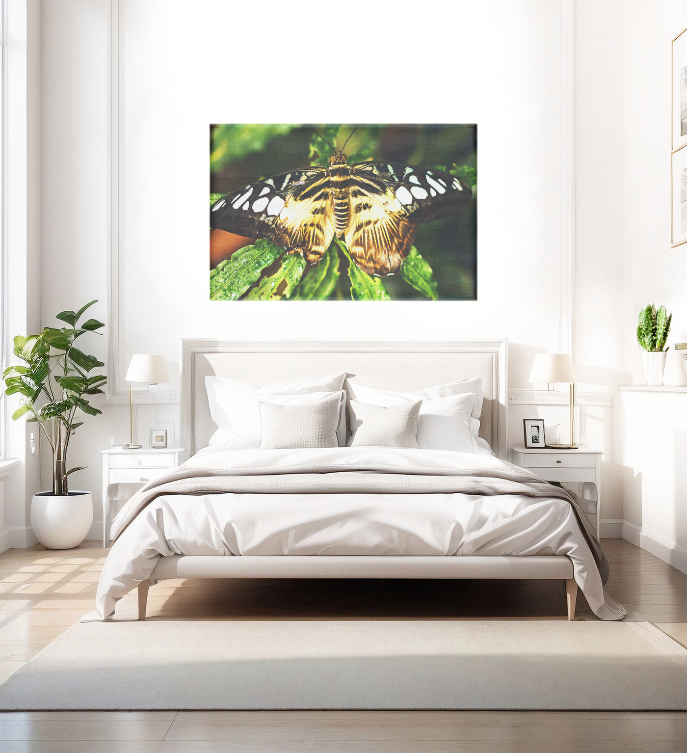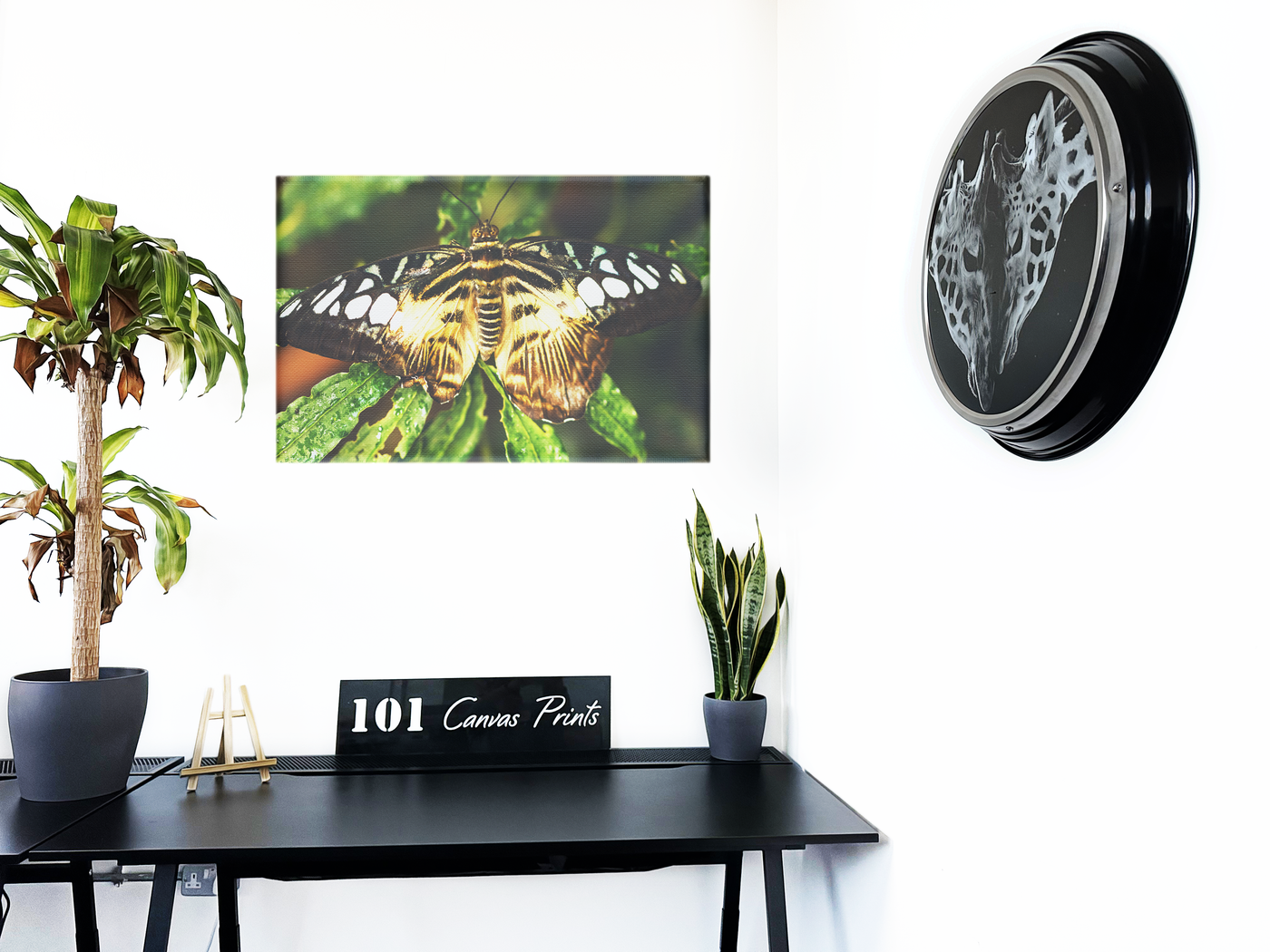 The natural weave of the Canvas perfectly complements the organic subject matter, adding a subtle texture that enhances the overall composition. This interplay between the Canvas and the image softens the contrast, creating a harmonious balance that draws the eye to the butterfly's striking golden wings and intricate markings.
