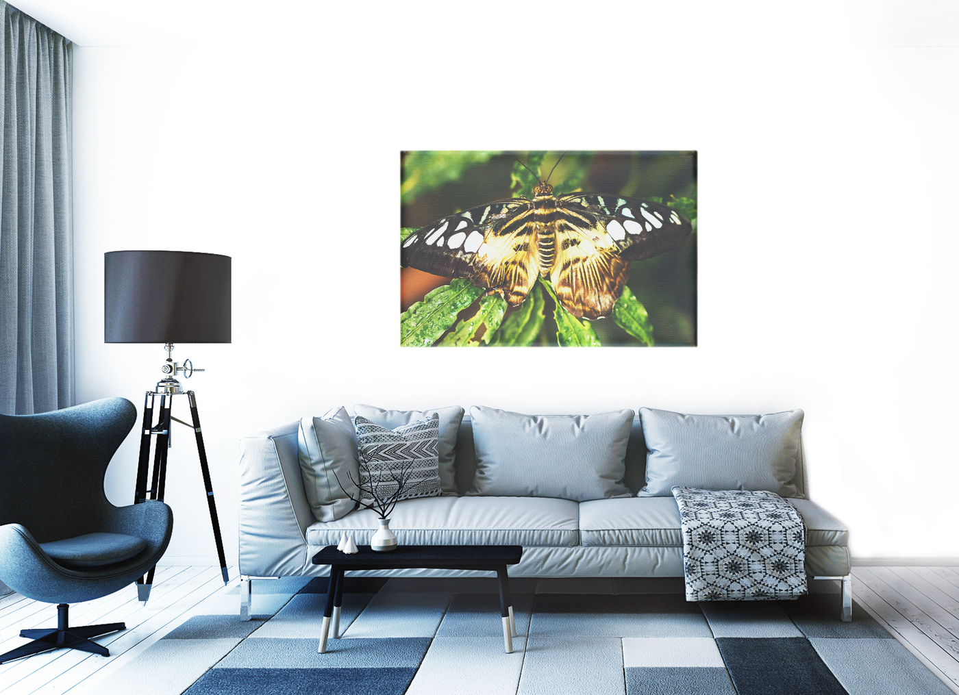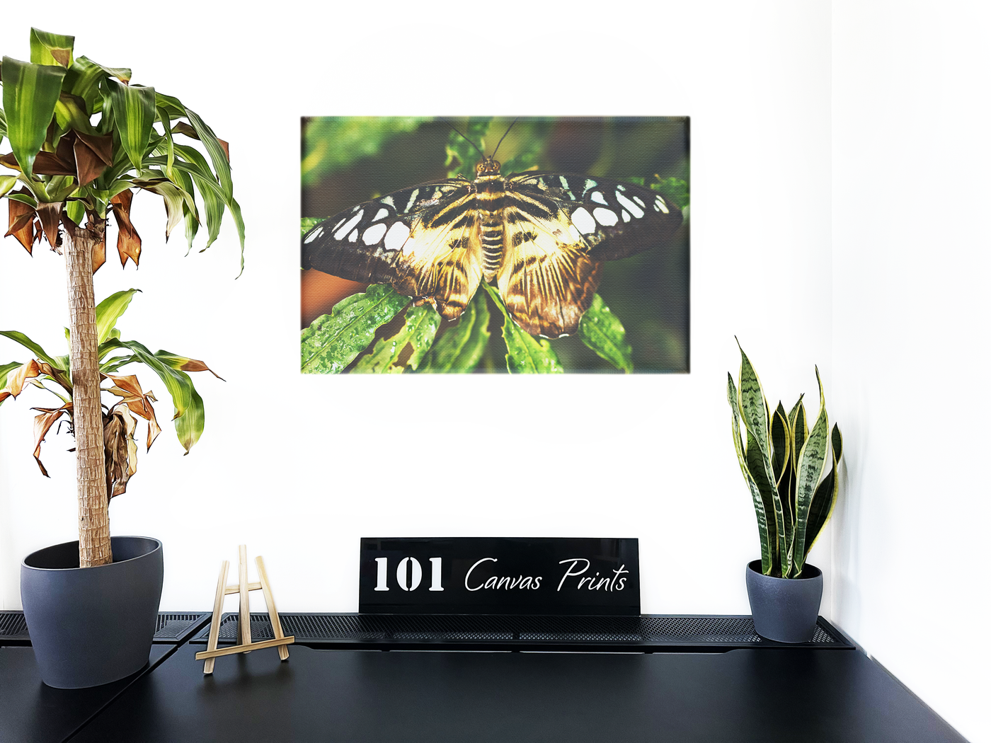 Hang this magnificent piece in your home or office to bring a touch of natural elegance and tropical allure to your décor. The Clipper butterfly, with its bold patterns and golden hues, symbolises transformation and beauty, making this Canvas print not just a stunning visual element but also a source of inspiration and wonder. Let this artwork transport you to a tranquil rainforest glade, where nature's most exquisite creations take flight.