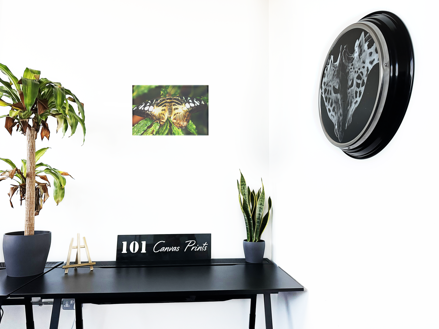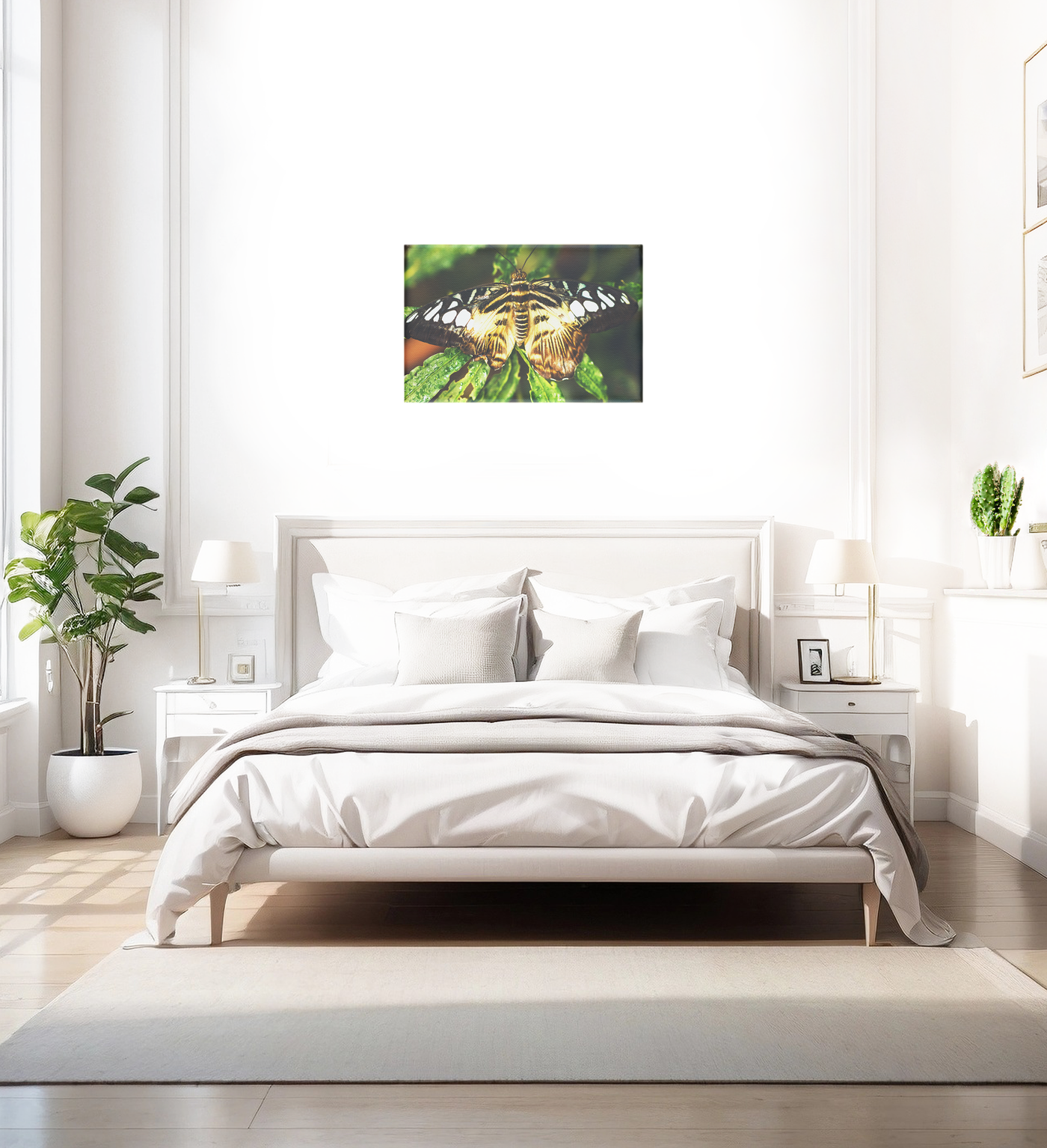 The natural weave of the Canvas perfectly complements the organic subject matter, adding a subtle texture that enhances the overall composition. This interplay between the Canvas and the image softens the contrast, creating a harmonious balance that draws the eye to the butterfly's striking golden wings and intricate markings.