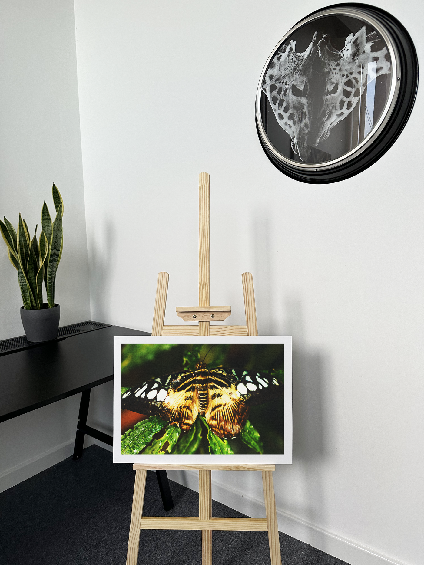 Our premium printing techniques ensure that every nuance of colour and detail is faithfully reproduced on the Fine Art paper. The matte finish reduces glare, allowing viewers to appreciate the butterfly's complex wing patterns and the lush green backdrop from any angle. The Fine Art paper texture also adds depth to the image, emphasising the three-dimensional quality of the butterfly and the water droplets on the leaves.
