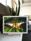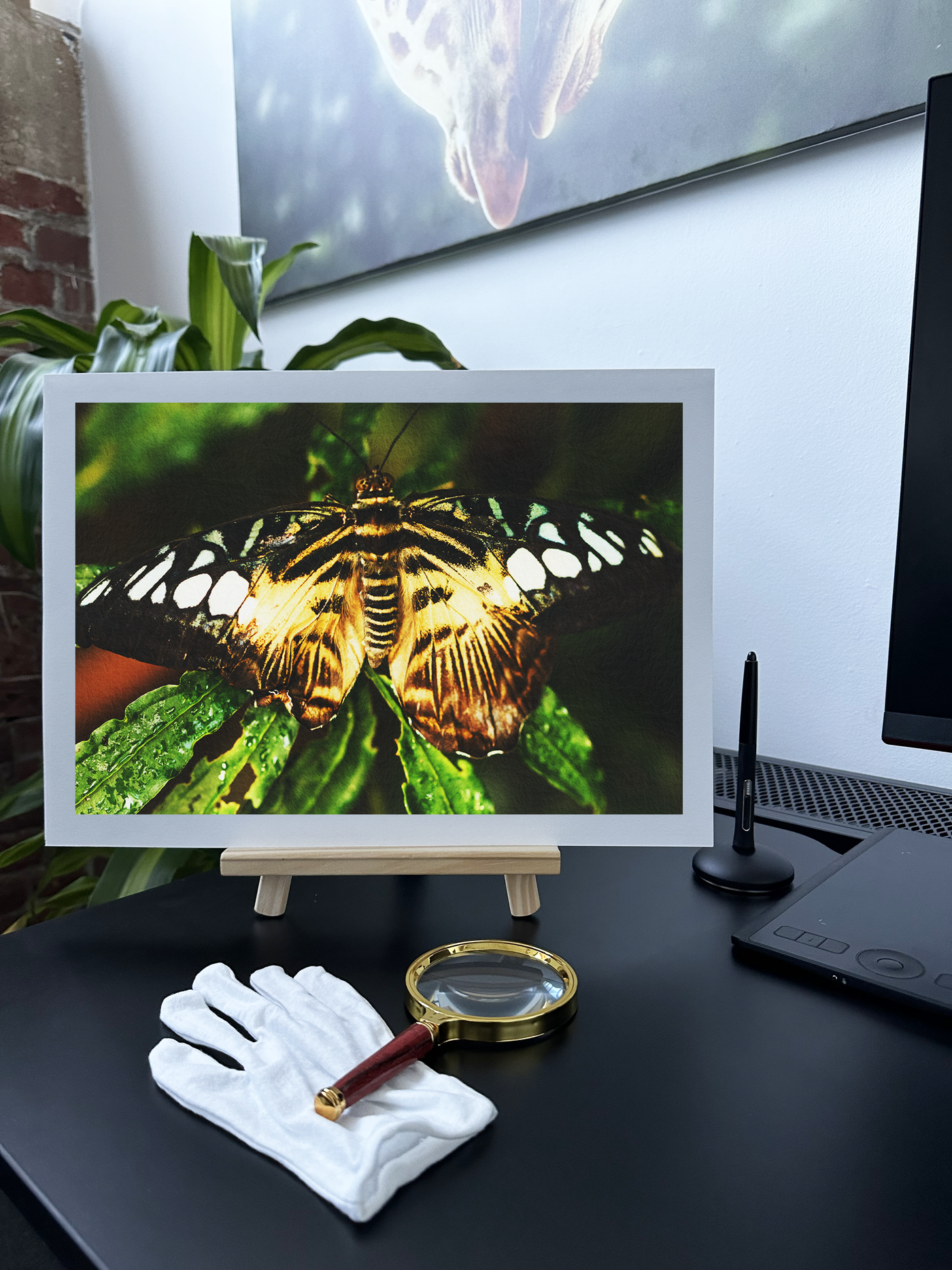 The natural weave of the Fine Art print perfectly complements the organic subject matter, adding a subtle texture that enhances the overall composition. This interplay between the Fine Art paper and the image softens the contrast, creating a harmonious balance that draws the eye to the butterfly's striking golden wings and intricate markings.