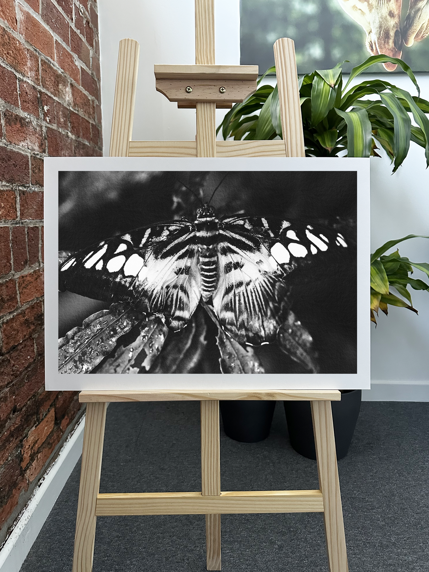 Hang this magnificent piece in your home or office to bring a touch of natural elegance and tropical allure to your décor. The Clipper butterfly, with its bold patterns and Monochrome hues, symbolises transformation and beauty, making this Monochrome Fine Art print not just a stunning visual element but also a source of inspiration and wonder. Let this artwork transport you to a tranquil rainforest glade, where nature's most exquisite creations take flight.