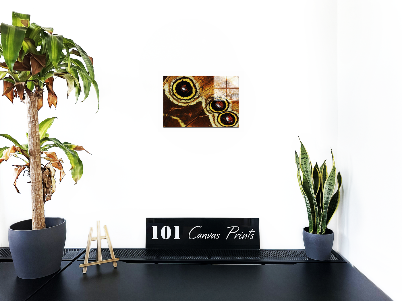 The crystal-clear Acrylic medium perfectly enhances the rich, warm tones of the image, from deep browns to vibrant golds. The glossy surface of the Acrylic creates a sense of depth, making the circular patterns pop as if they were three-dimensional. This effect is particularly striking in the way it highlights the concentric rings of the eyespots, creating an almost hypnotic visual experience.