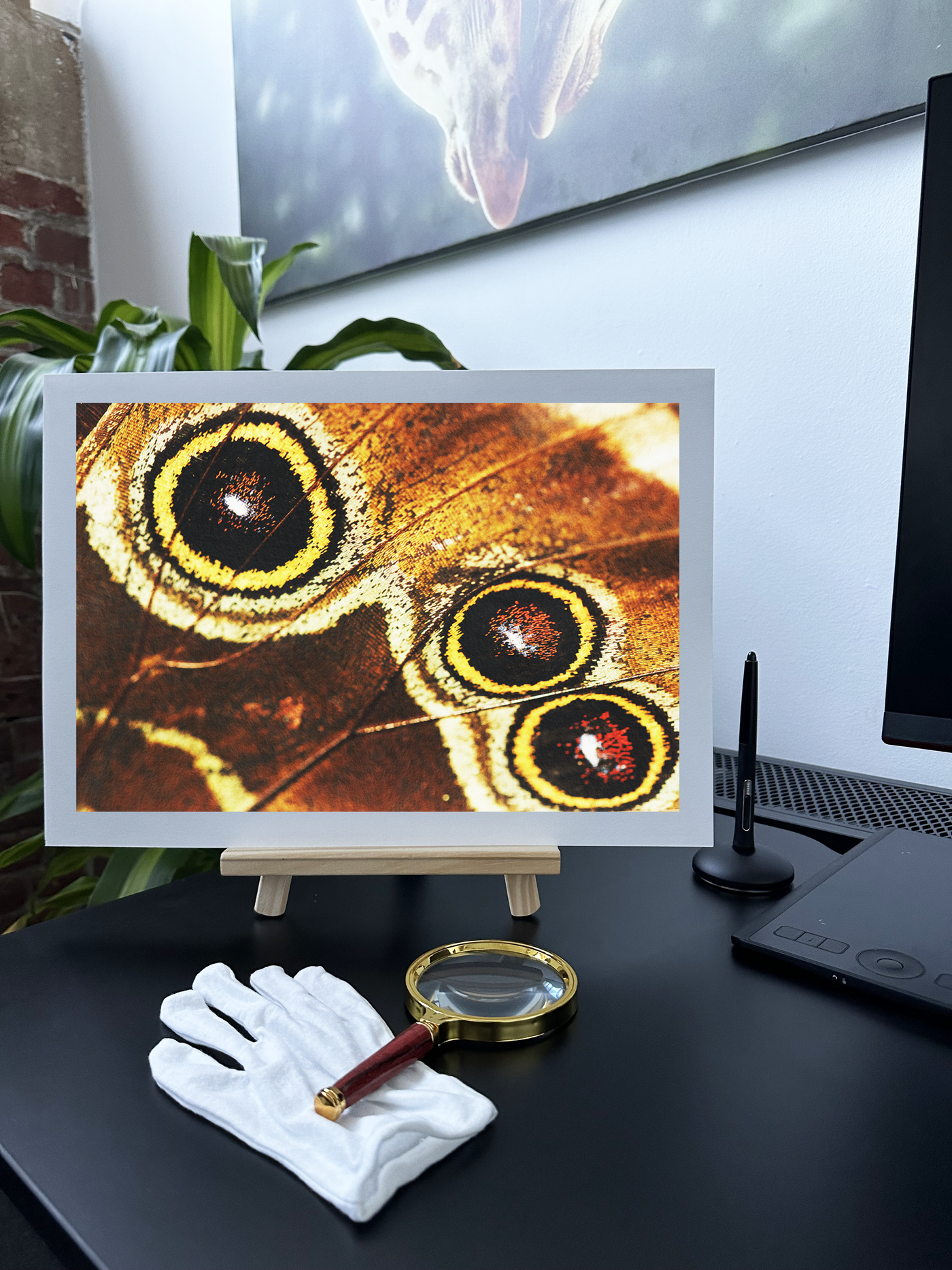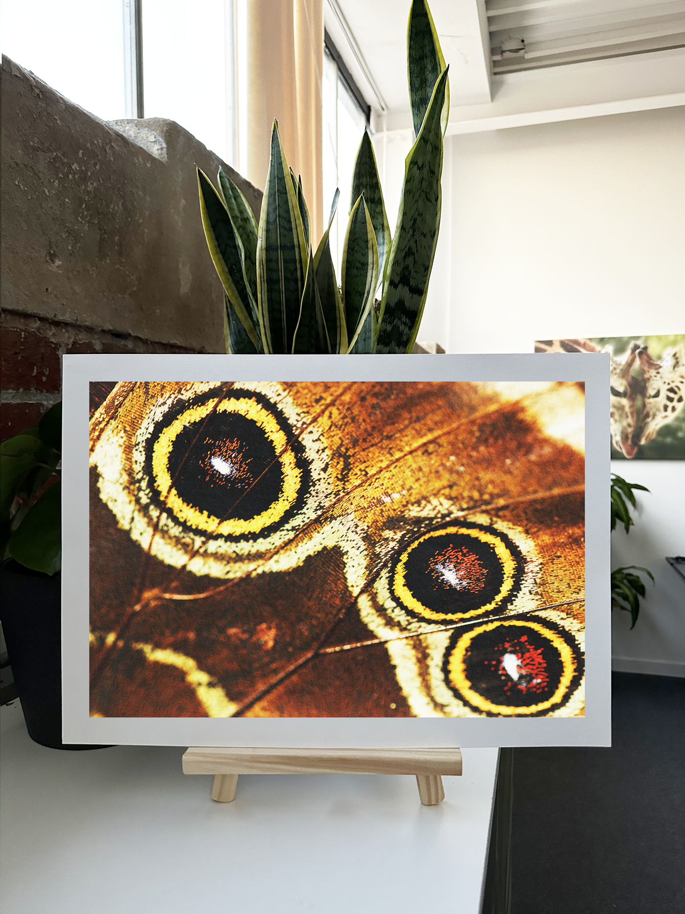 Our premium printing techniques ensure that every nuance of colour and detail is faithfully reproduced on the Fine Art paper. The matte finish reduces glare, allowing viewers to appreciate the complex structures and patterns of the eyespots from any angle. The Fine Art print texture also adds depth to the image, emphasising the three-dimensional quality of the wing scales and the illusion of depth within each eyespot.