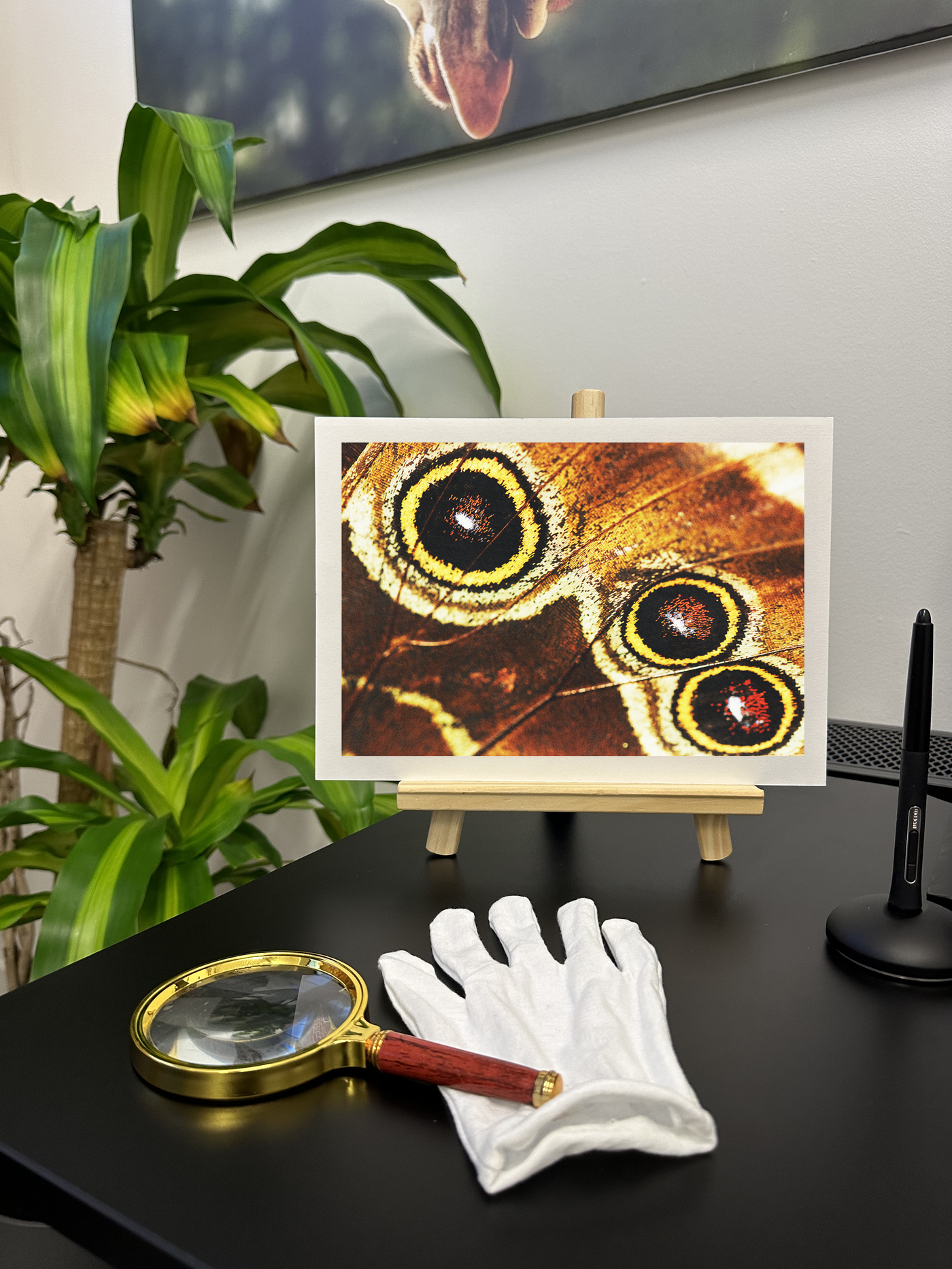 Hang this piece in your home or office to bring a touch of natural wonder and scientific curiosity to your décor. The eyespots, with their concentric circles of gold and brown create a visually striking artwork