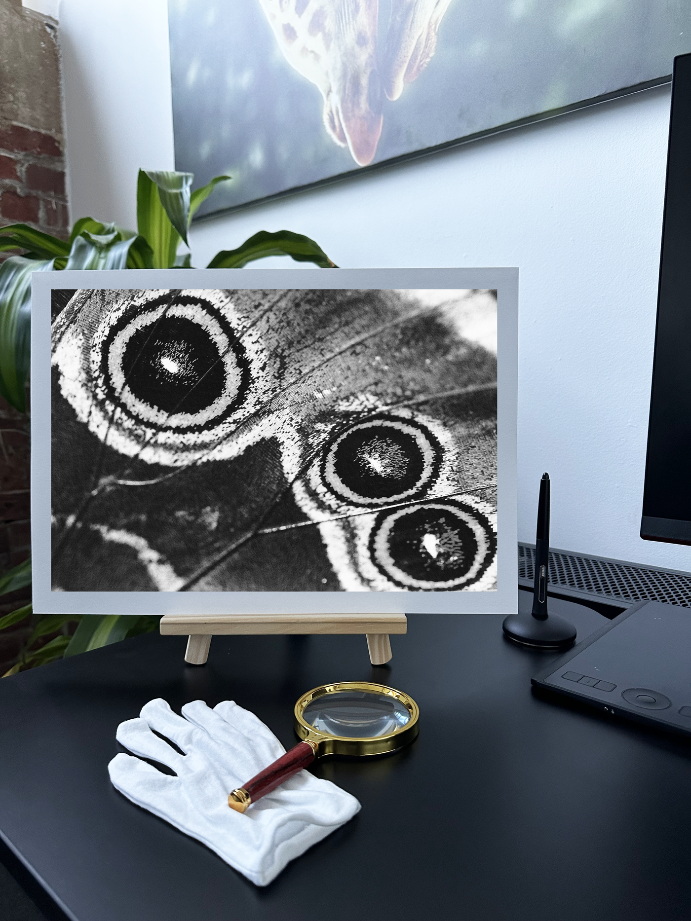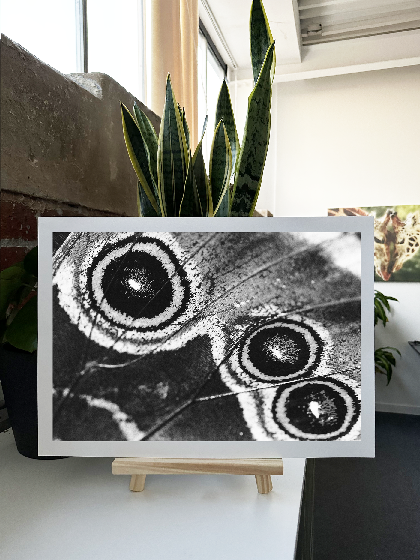 Our premium printing techniques ensure that every nuance of Monochromatic detail is faithfully reproduced on the Fine Art paper. The matte finish reduces glare, allowing viewers to appreciate the complex structures and patterns of the eyespots from any angle. The Fine Art print texture also adds depth to the image, emphasising the three-dimensional quality of the wing scales and the illusion of depth within each eyespot.
