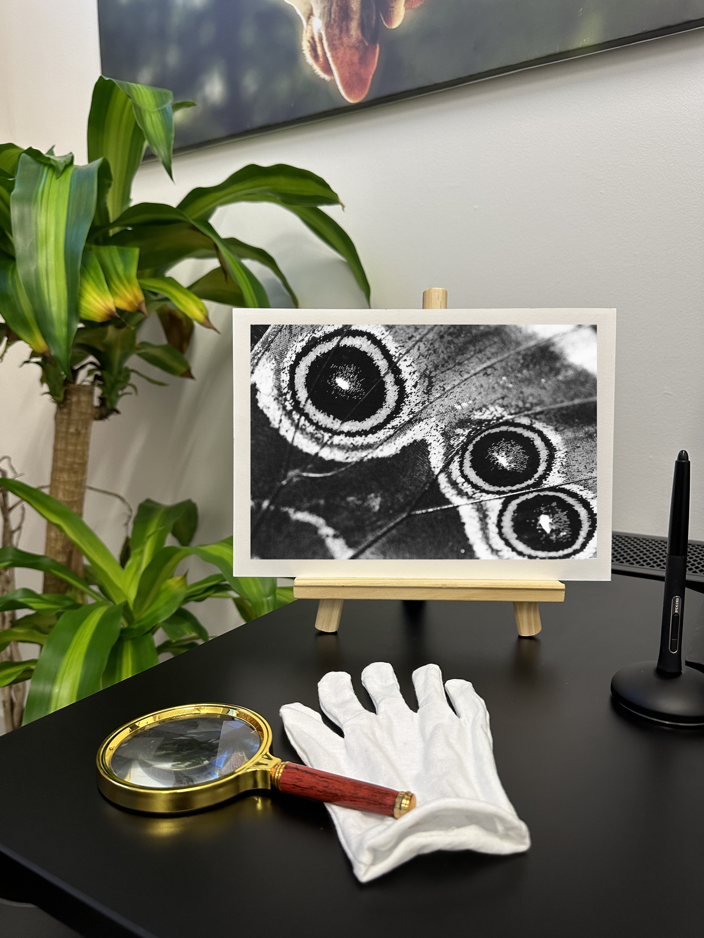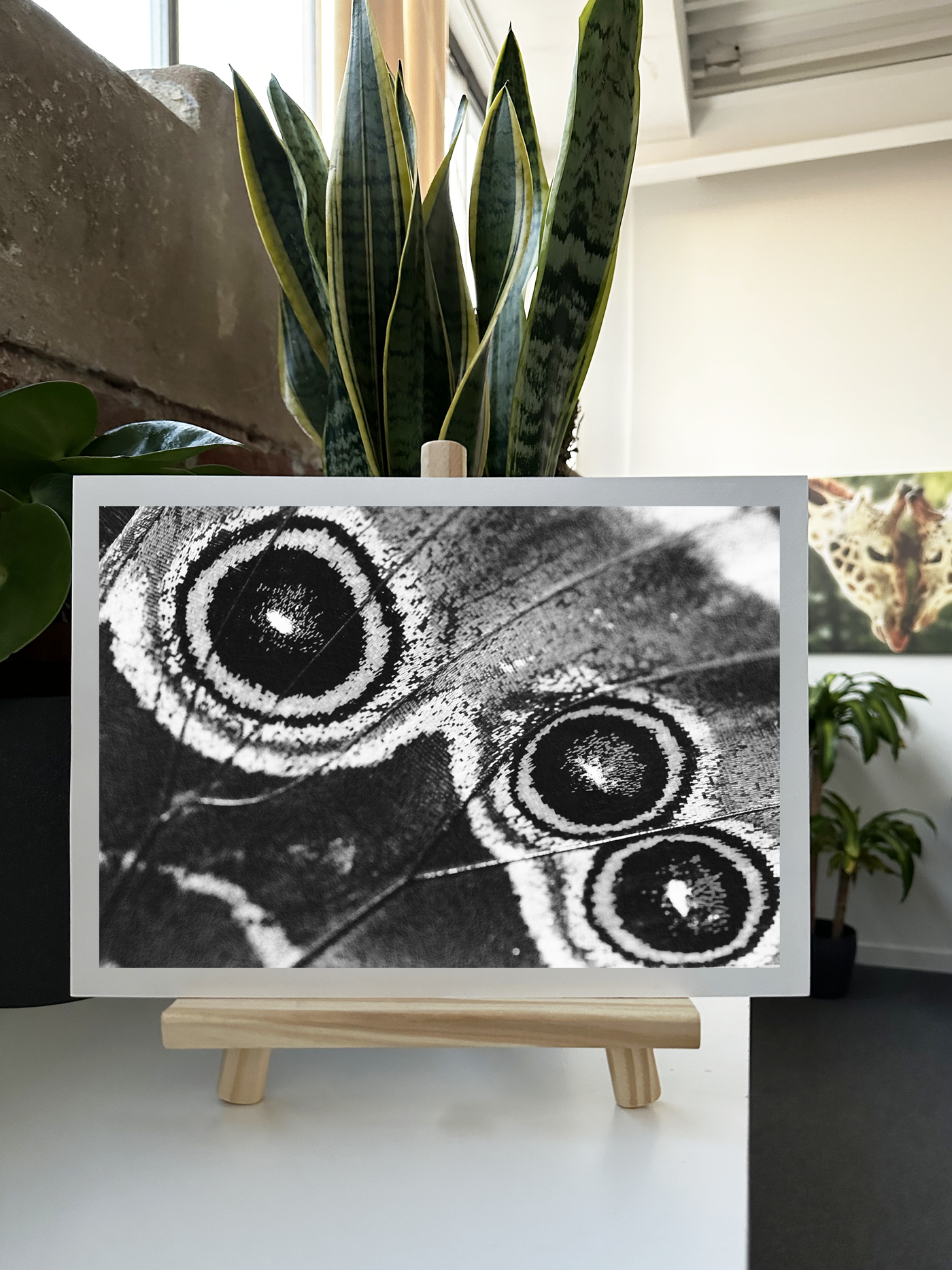 Our premium printing techniques ensure that every nuance of Monochromatic detail is faithfully reproduced on the Fine Art paper. The matte finish reduces glare, allowing viewers to appreciate the complex structures and patterns of the eyespots from any angle. The Fine Art print texture also adds depth to the image, emphasising the three-dimensional quality of the wing scales and the illusion of depth within each eyespot.