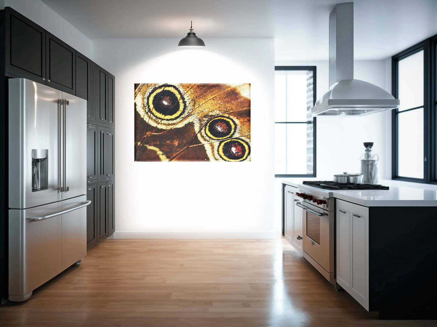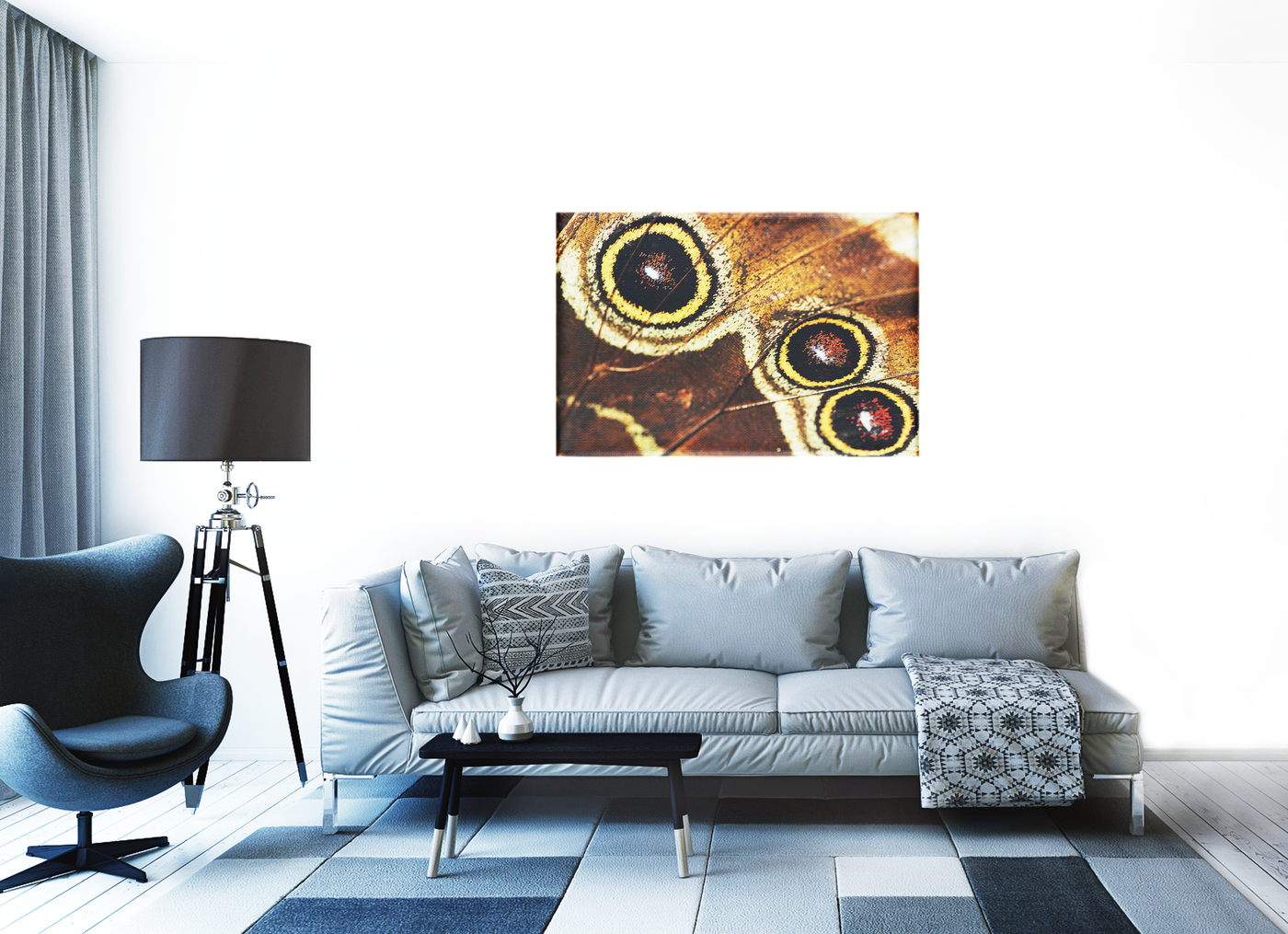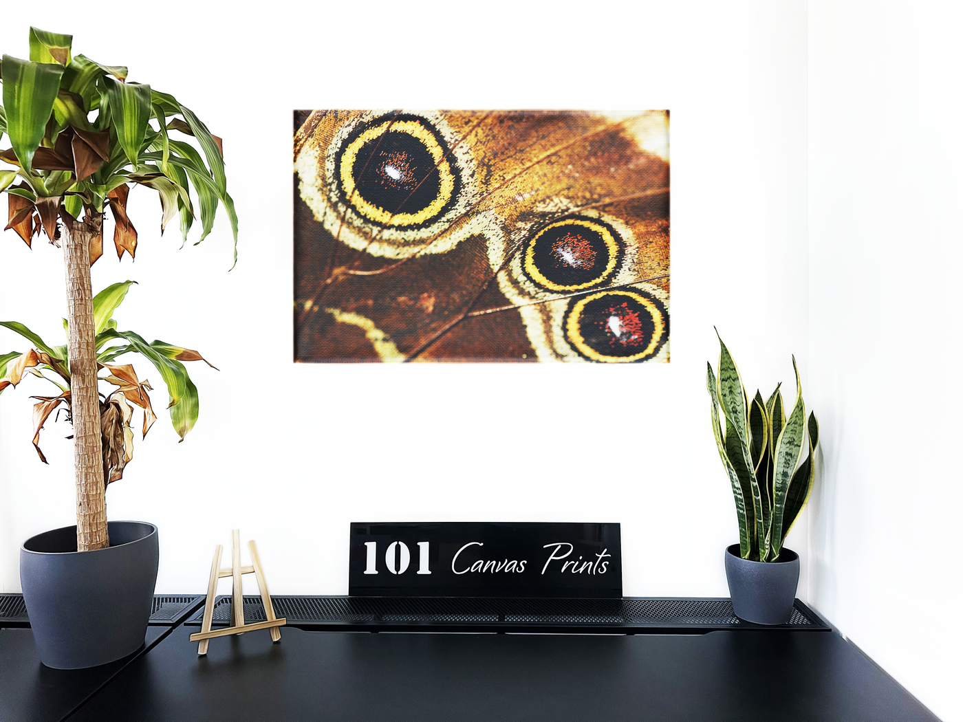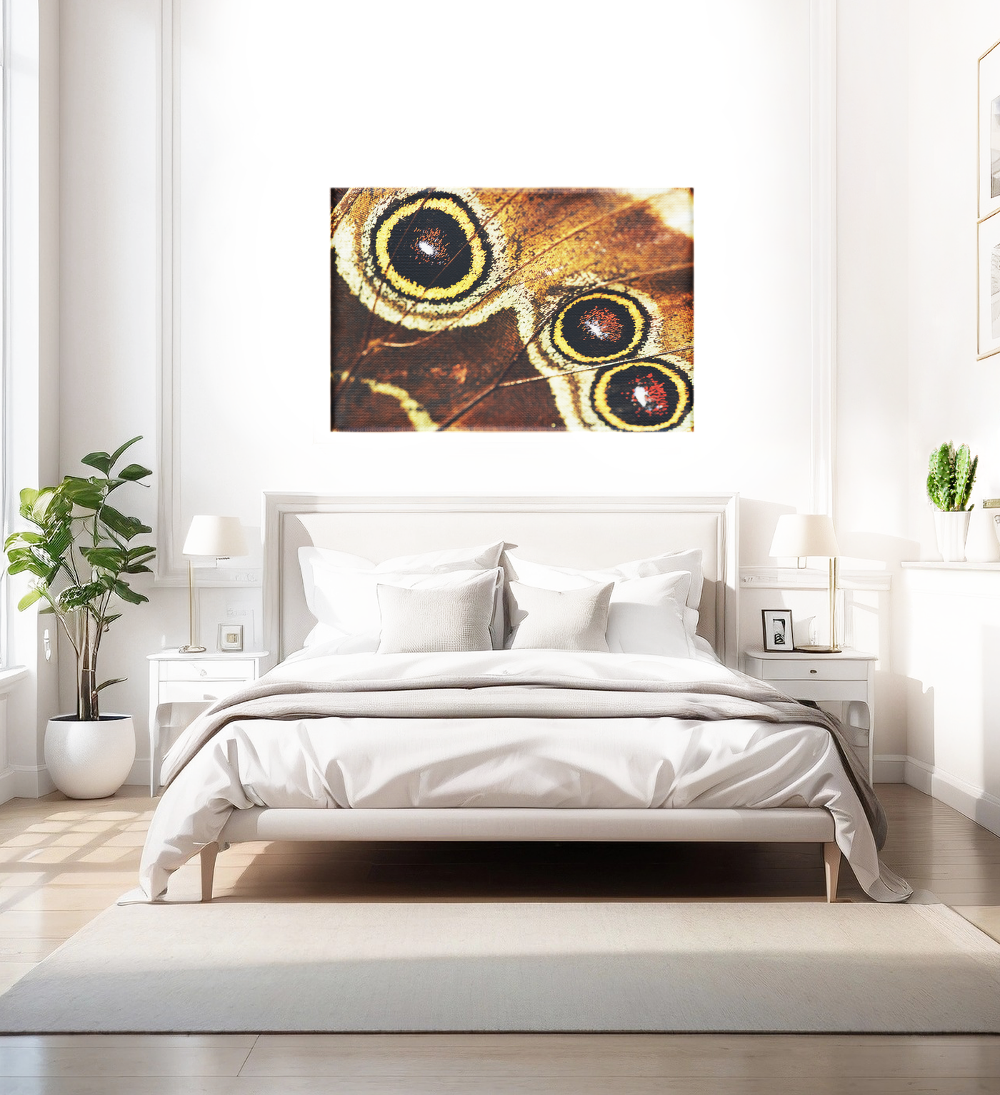 Our premium printing techniques ensure that every nuance of colour and detail is faithfully reproduced on the Canvas. The matte finish reduces glare, allowing viewers to appreciate the complex structures and patterns of the eyespots from any angle. The Canvas texture also adds depth to the image, emphasising the three-dimensional quality of the wing scales and the illusion of depth within each eyespot.