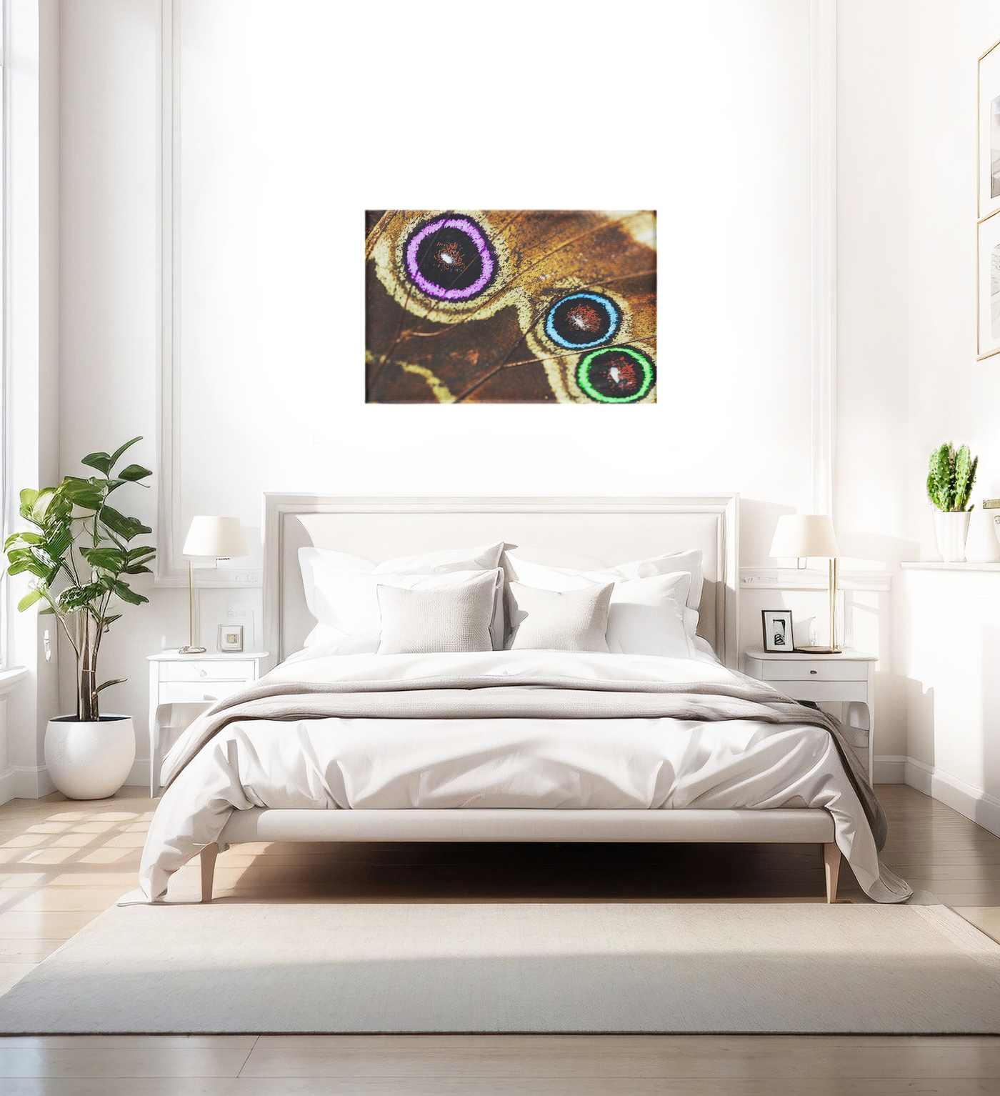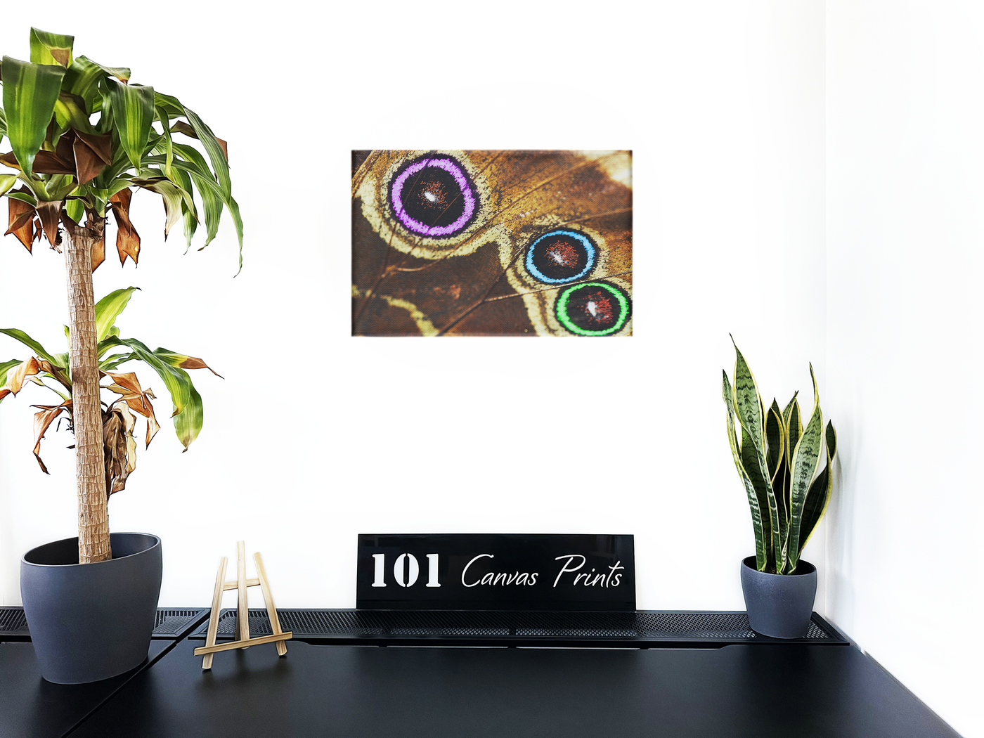 This captivating image from the 101 Canvas Prints photography team showcases the intricate beauty of butterfly wing eyespots. The photograph features three distinct eyespots, each ringed in purple, blue, and green, set against the warm, textured background of the wing.