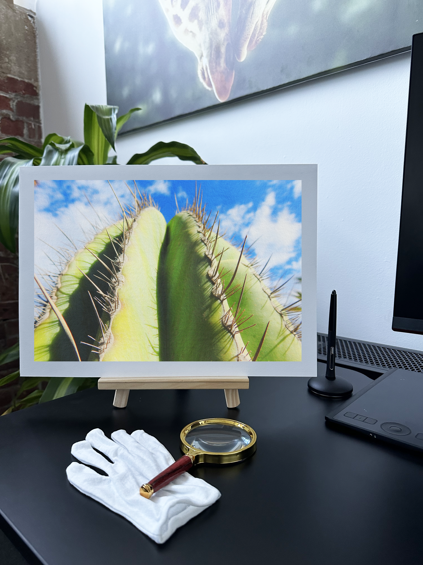 The matte finish of Fine Art paper enhances the rich green hues of the cactus, creating beautiful tonal variations from light lime to deep emerald. This interplay of textures and colours adds depth to the piece, inviting closer inspection of the cactus's intricate defensive structures.